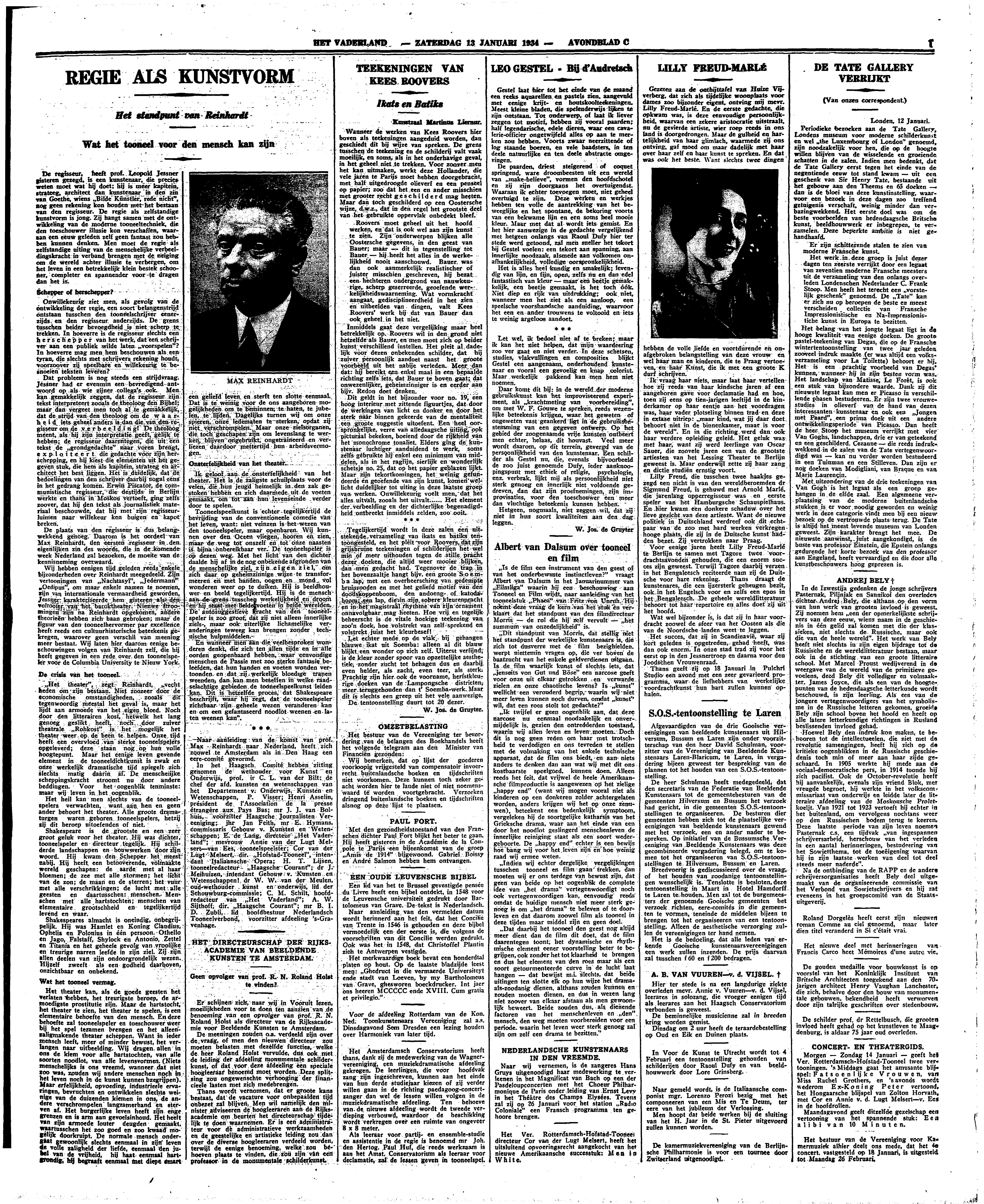 De regisseur, heeft prof. Leopold Jessner gisteren gezegd, is een kunstenaar, die precies weten moet wat hij doet; hij is meer kapitein, strateeg, architect dan kunstenaar in den zin van Goethe, wiens ‘Bilde Künstler, rede nicht’, nog geen rekening kon houden met het bestaan van den regisseur. De regie als zelfstandige kunstvorm is jong. Zij hangt samen met de ontwikkeling van de moderne toneeltechniek, die den toeschouwer illusie kon verschaffen, waaraan een eeuw geleden zelf geen fantast zou hebben kunnen denken. Men moet de regie als zelfstandige uiting van de menschelijke verbeeldingskracht in verband brengen met de neiging om de wereld achter illusie te verbergen, om het leven in een betrekkelijk klein bestek schooner, completer en spannender voor te dragen dan het is.