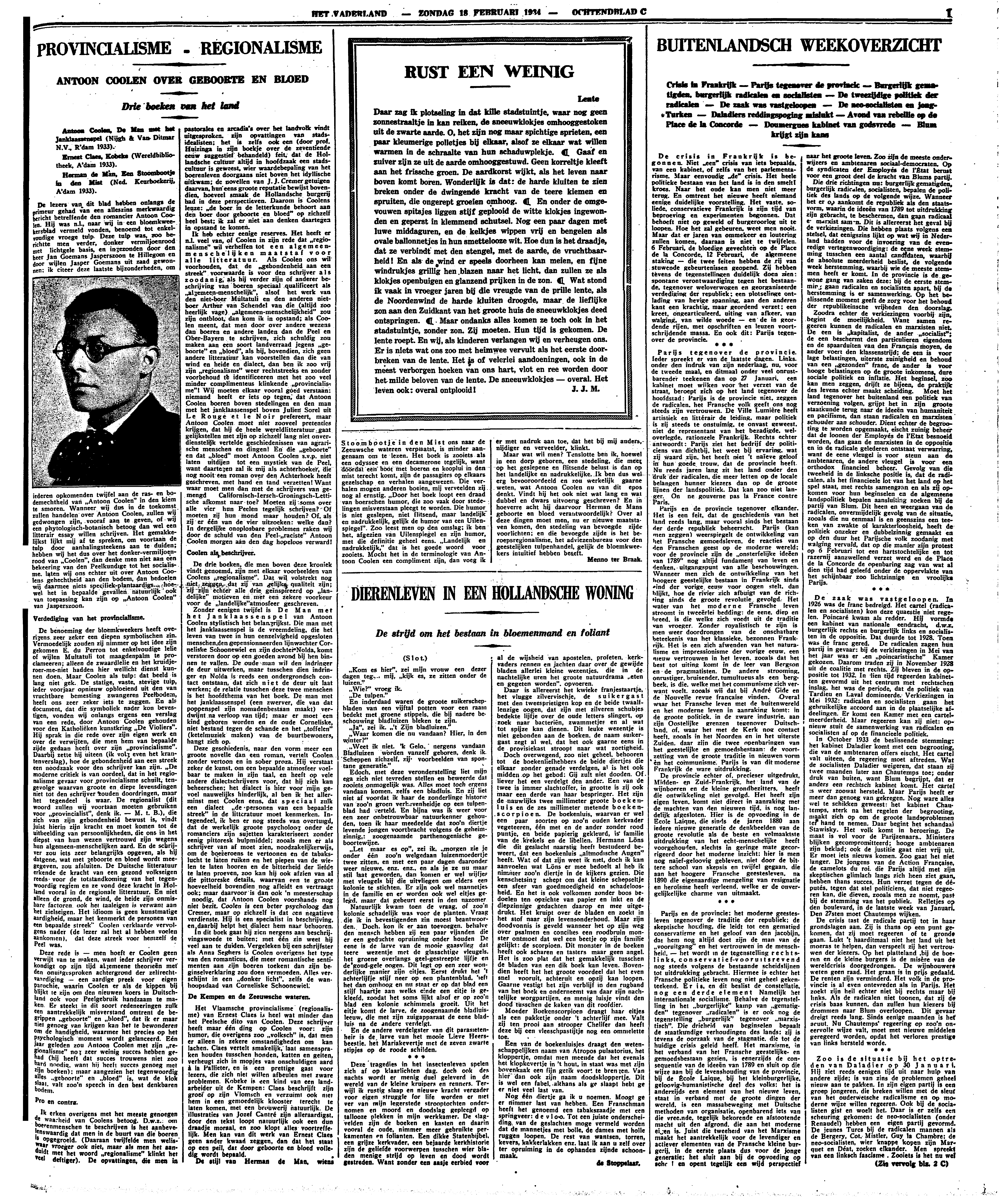 Deze rede is – men hoeft er Coolen geen verwijt van te maken, want ieder schrijver verkondigt op zijn tijd algemeene theorieën met den onuitgesproken achtergrond der zelfrechtvaardiging – een aardige preek voor eigen parochie, waarin Coolen er als de kippen bij blijkt te zijn om den nieuwen koers in Duitschland ook voor Peelgebruik handzaam te maken. Er steekt in dit soort redeneeringen zulk een aantrekkelijk misverstand omtrent de begrippen ‘geboorte’ en ‘bloed’, dat ik er maar niet genoeg van krijgen kan het te bewonderen om de handigheid, waarmee het precies op het psychologisch moment wordt gelanceerd. Eén jaar geleden zou Antoon Coolen met zijn ‘regionalisme’ nog zeer weinig succes hebben gehad (hij heeft dat succes trouwens niet zoo hard noodig, want hij heeft succes genoeg met zijn boeken); maar aangezien het tegenwoordig alles ‘geboorte’ en ‘bloed’ is, wat de klok slaat, valt zoo'n speech in den best denkbaren bodem.