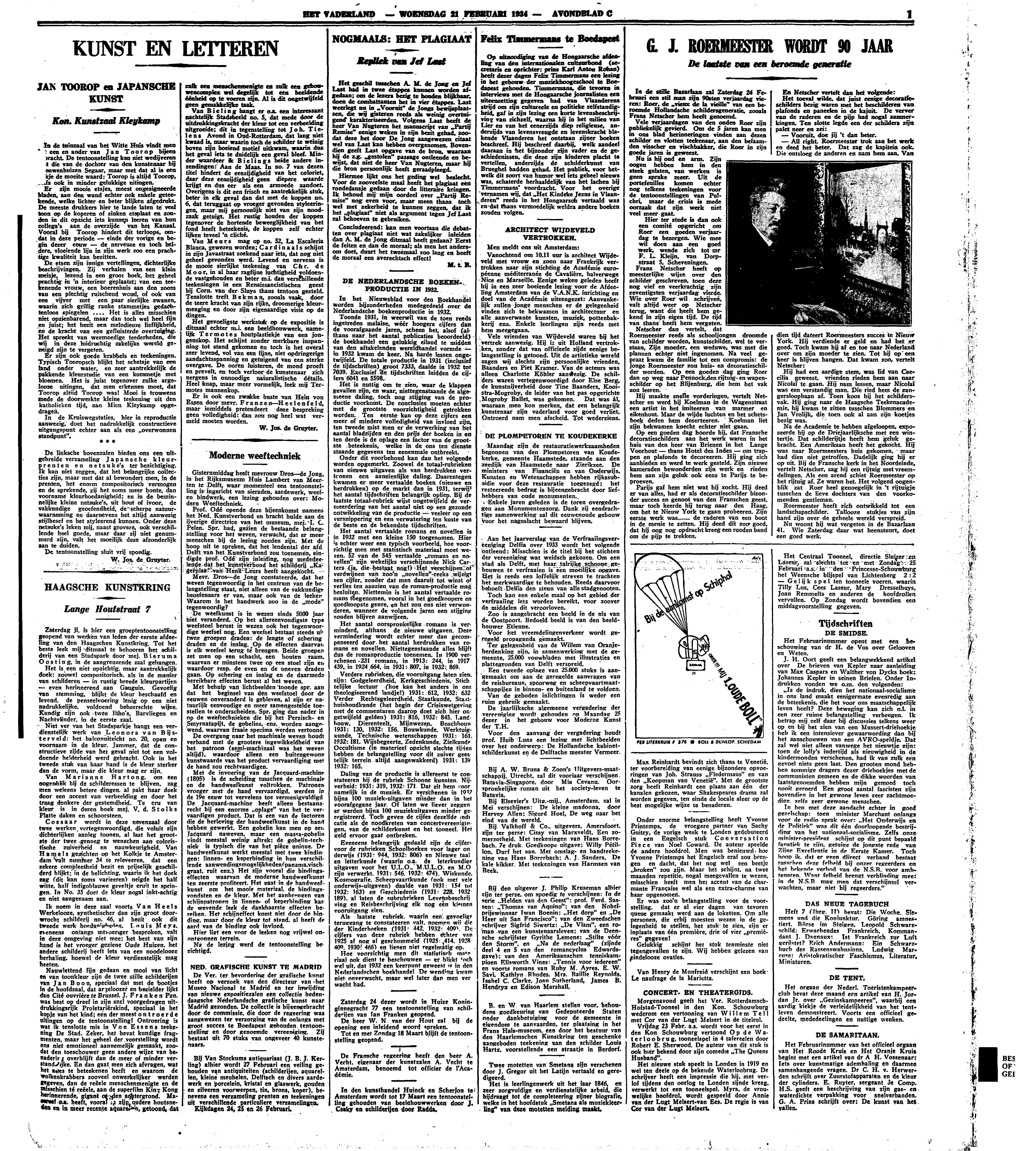 Het geschil tusschen A.M. de Jong en Jef Last had in twee étappes kunnen worden afgedaan; om de lezers bezig te houden blijkbaar, doen de combattanten het in vier étappes. Last weerlegt nu in Vooruit De Jongs bewijsplaatsen, die wij gisteren reeds als weinig overtuigend karakteriseerden. Volgens Last heeft de heer Van Nugteren het manuscript van ‘Partij Remise’ eenige weken in zijn bezit gehad, zoodat deze het door De Jong aangewezen citaat wel van Last kan hebben overgenomen. Bovendien geeft Last opgave van de bron, waaraan hij de z.g. ‘gestolen’ passage ontleende en bewijst dat niet de heer Van Nugteren, maar hij die bron persoonlijk heeft geraadpleegd.