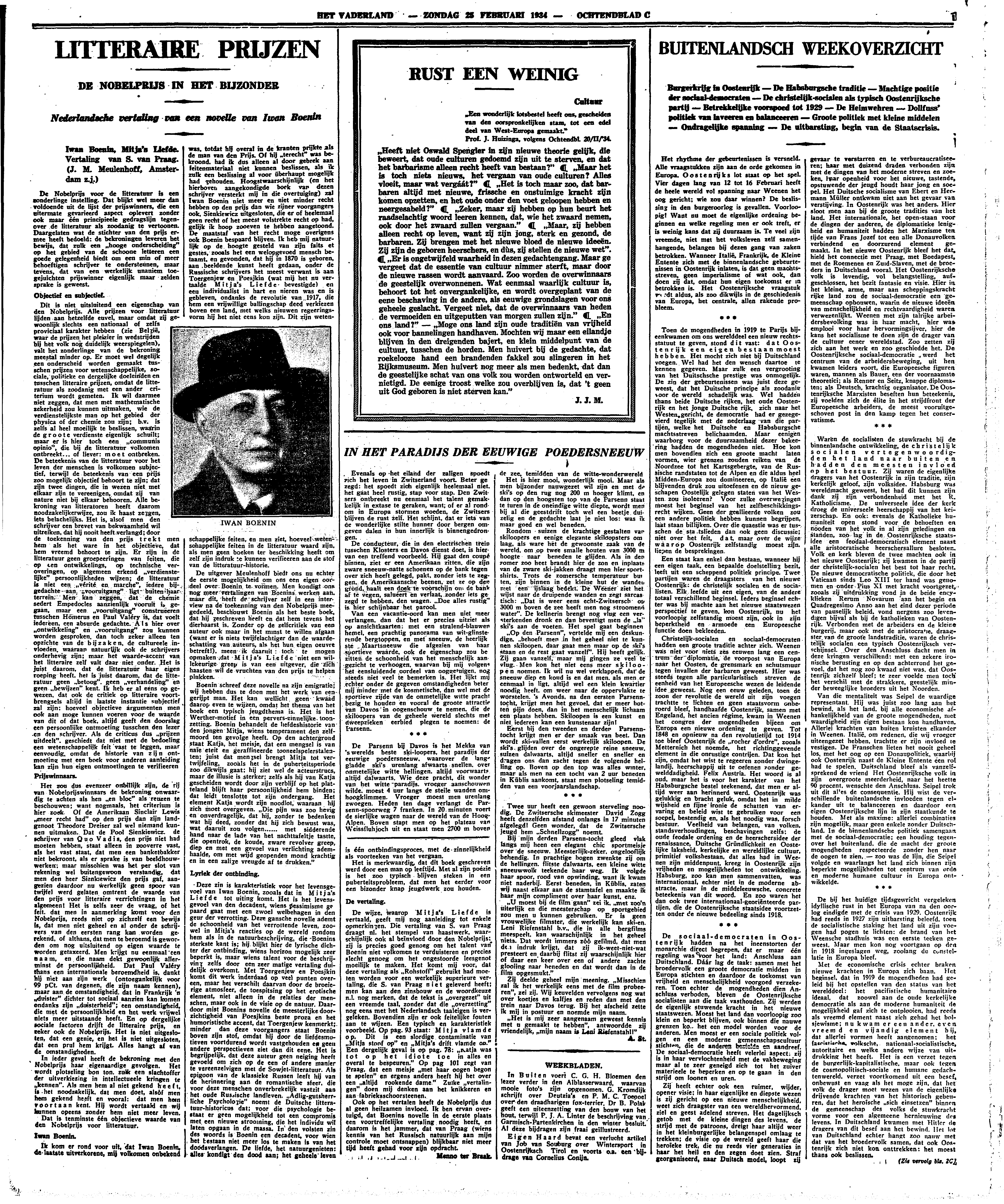 Ik kom er rond voor uit, dat Iwan Boenin, de laatste uitverkorene, mij volkomen onbekend was, totdat hij overal in de kranten prijkte als de man van den Prijs. Of hij ‘terecht’ was bekroond, had ik dus alleen al door gebrek aan feitenmateriaal niet kunnen beslissen, als ik zulk een beslissing al voor überhaupt mogelijk had gehouden. Hoogstwaarschijnlijk (en het hierboven aangekondigde boek van dezen schrijver versterkt mij in die overtuiging) zal Iwan Boenin niet meer en niet minder recht hebben op den prijs dan wie zijner voorgangers ook, Sienkiewicz uitgesloten, die er of heelemaal geen recht of het meest volstrekte recht op had, gelijk ik hoop zooeven te hebben aangetoond. De maatstaf van het recht moge overigens ook Boenin bespaard blijven. Ik heb mij natuurlijk op de hoogste gesteld van zijn faits et gestes, zooals het een welopgevoed mensch betaamt, en gevonden, dat hij in 1870 is geboren, aan beeldende kunst heeft gedaan, onder de Russische schrijvers het meest verwant is aan Toergenjew en Poesjkin (wat mij het nu vertaalde Mitja's Liefde bevestigde) en een individualist in hart en nieren was en is gebleven ondanks de revolutie van 1917, die hem een vrijwillige ballingschap deed verkiezen boven een land, met welks nieuwen regeeringsvorm hij het niet eens kon zijn. Dit zijn wetenschappelijke feiten, en men ziet, hoeveel wetenschappelijke feiten in de litteratuur waard zijn, als men geen boeken ter beschikking heeft om zelf zijn indruk te kunnen verifieeren aan de stof van de litteratuur-historie.