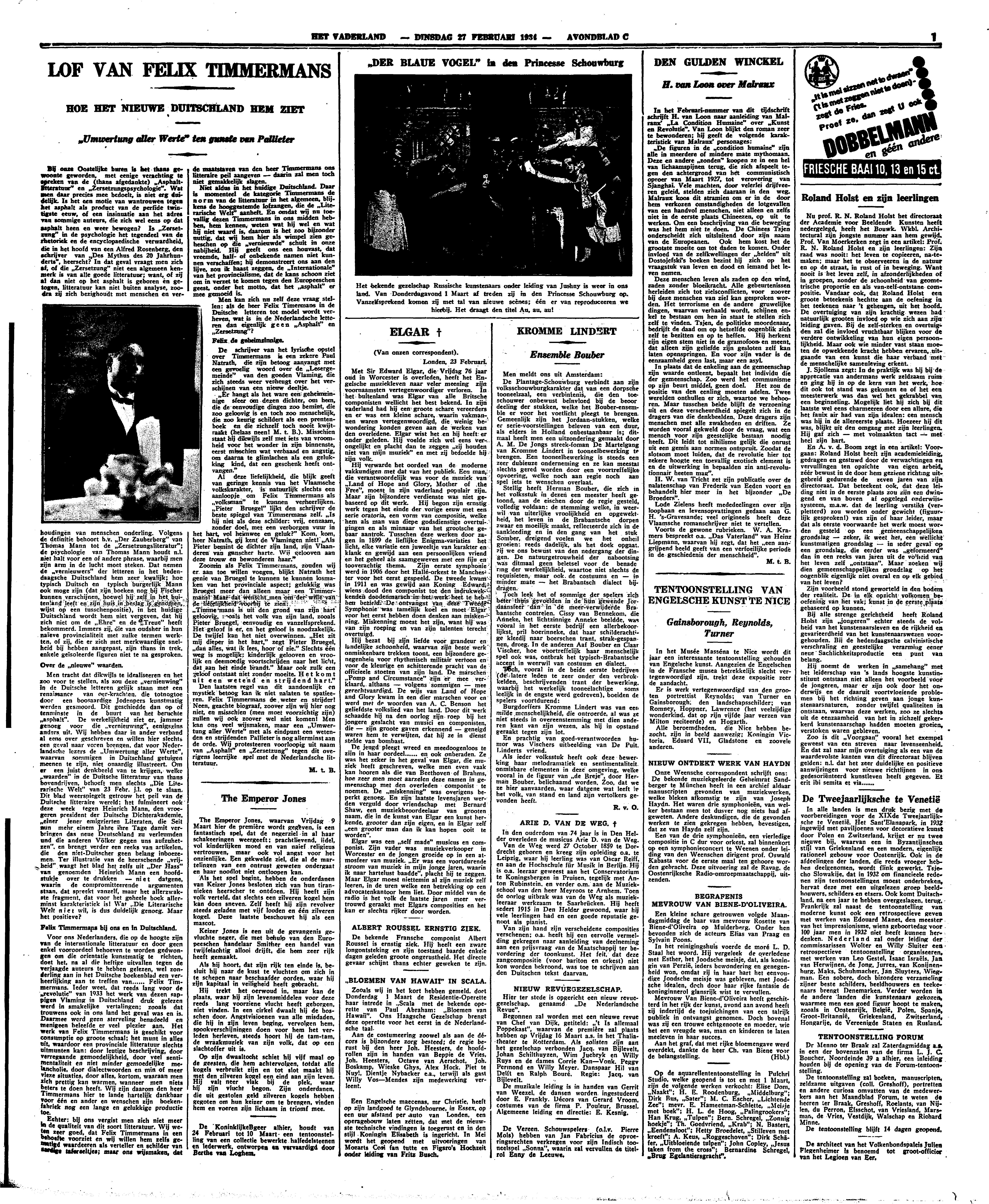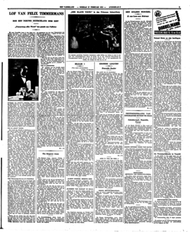 Voor ons Nederlanders, die op de hoogte zijn van de internationale litteratuur en door geen enkel vooroordeel behoeven te worden gedwongen om die orientatie kunstmatig te richten, doet het, na al die heftige uitvallen tegen de verjaagde auteurs te hebben gelezen, wel zonderling aan in het Duitsche boekenblad een verheerlijking aan te treffen van... Felix Timmermans. Ieder weet, dat reeds lang voor de ‘revolutie’ van 1933 het werk van dezen sappigen Vlaming in Duitschland druk gelezen werd in smakelijke vertalingen; zooals dat trouwens ook in ons land het geval was en is. Daarmee werd geen sterveling benadeeld en menigeen beleefde er veel plezier aan. Het werk van Felix Timmermans is geschikt voor consumptie op groote schaal; het munt in alles uit, waardoor een provinciale litteratuur slechts uitmunten kan: door leutige beschrijving, door verregaande gemoedelijkheid, door veel sentimentaliteit en niet minder gemoedelijke melancholie, door dialectwoorden en min of meer vieze situaties, door alles, kortom, waaraan men zich prettig kan warmen, wanneer men niets beters te doen heeft. Wij zijn daarom den heer Timmermans hier te lande hartelijk dankbaar voor één en ander en wenschen zijn boekenfabriek nog een lange en gelukkige productie toe.