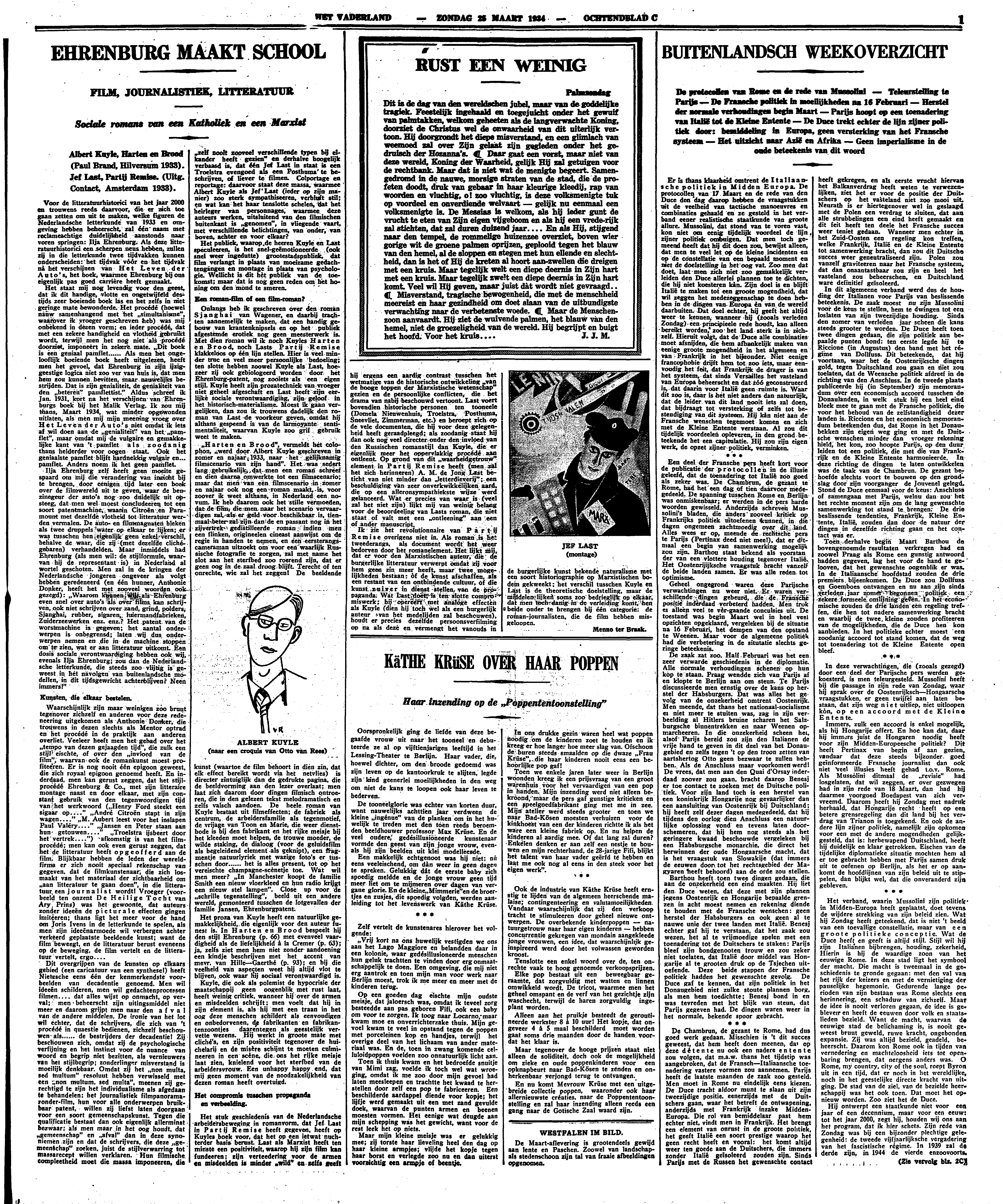 Onlangs heb ik geschreven over den roman Sjanghai van Wagener, en daarbij trachten aannemelijk te maken, dat een handig gebouw van krantenknipsels en op het publiek afgestemde erotiek nog geen meesterwerk is. Met dien roman wil ik noch Kuyles Harten en Brood noch Lasts Parij Remise klakkeloos op één lijn stellen. Hier is veel minder truc en veel meer persoonlijke bedoeling; ten slotte hebben zoowel Kuyle als Last, hoezeer zij ook gebiologeerd worden door het Ehrenburg-patent, nog zooiets als een eigen stijl. Kuyle heeft zijn prozatechniek van vroeger niet geheel afgeschaft en Last heeft zijn eerlijke sociale verontwaardiging, zijn geloof in het historisch-materialisme. Moest ik gaan vergelijken, dan zou ik trouwens dadelijk den roman van Last de voorkeur geven, omdat hij althans gespeend is van de larmoyante sentimentaliteit, waarvan Kuyle zoo grif gebruik weet te maken.