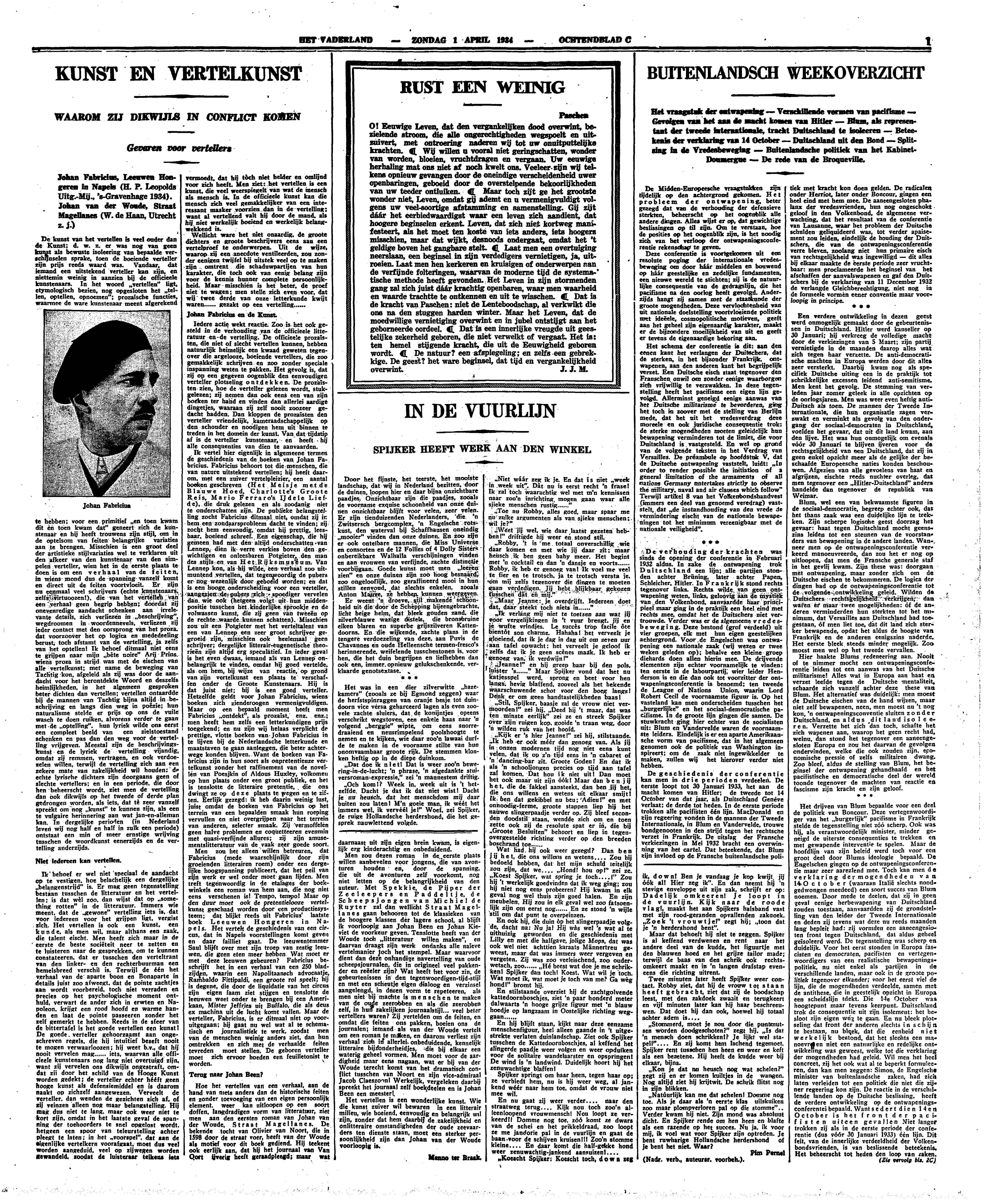 Men zou het alleen willen betreuren, dat Fabricius (mede waarschijnlijk door zijn groeienden litterairen roem) onder een dergelijke hoogspanning publiceert, dat het peil van zijn werk er wel onder moet gaan lijden. Men treft tegenwoordig in de etalages der boekwinkels een roman van hem aan, die nog niet eens verschenen is! Tempo, tempo! Maar op den duur moet ook de pretentielooze vertelkunst geschaad worden door een productiesysteem; dat blijkt reeds uit Fabricius' laatste boek Leeuwen Hongeren in Napels. Het vertelt de geschiedenis van een circus, dat in Napels voorstellingen komt geven en daar failliet gaat. De leeuwentemmer Saul blijft over met zijn troep van zestig leeuwen, die geen eten meer hebben. Wat moet er met deze leeuwen gebeuren? Fabricius beschrijft het in een verhaal van een 250 bladzijden, waarin een Napolitaansch advocaatje, Rambaldo Fittipaldi, een groote rol speelt; hij is degene, die door de liquidatie van het circus zijn eigen faam ziet stijgen en tenslotte de leeuwen weet onder te brengen bij een Amerikaan, Mister Jeffries uit Buffalo, die als deus ex machina uit de lucht komt vallen. Maar de verteller, Fabricius, is er ditmaal niet op vooruit gegaan; hij gaat nu wel wat al te schematisch en journalistiek te werk, zoodat men van de menschen weinig anders ziet, dan hun omtrekken en zich met de verhaalde feiten tevreden moet stellen. De geboren verteller moet zich ervoor hoeden een feuilletonist te worden.