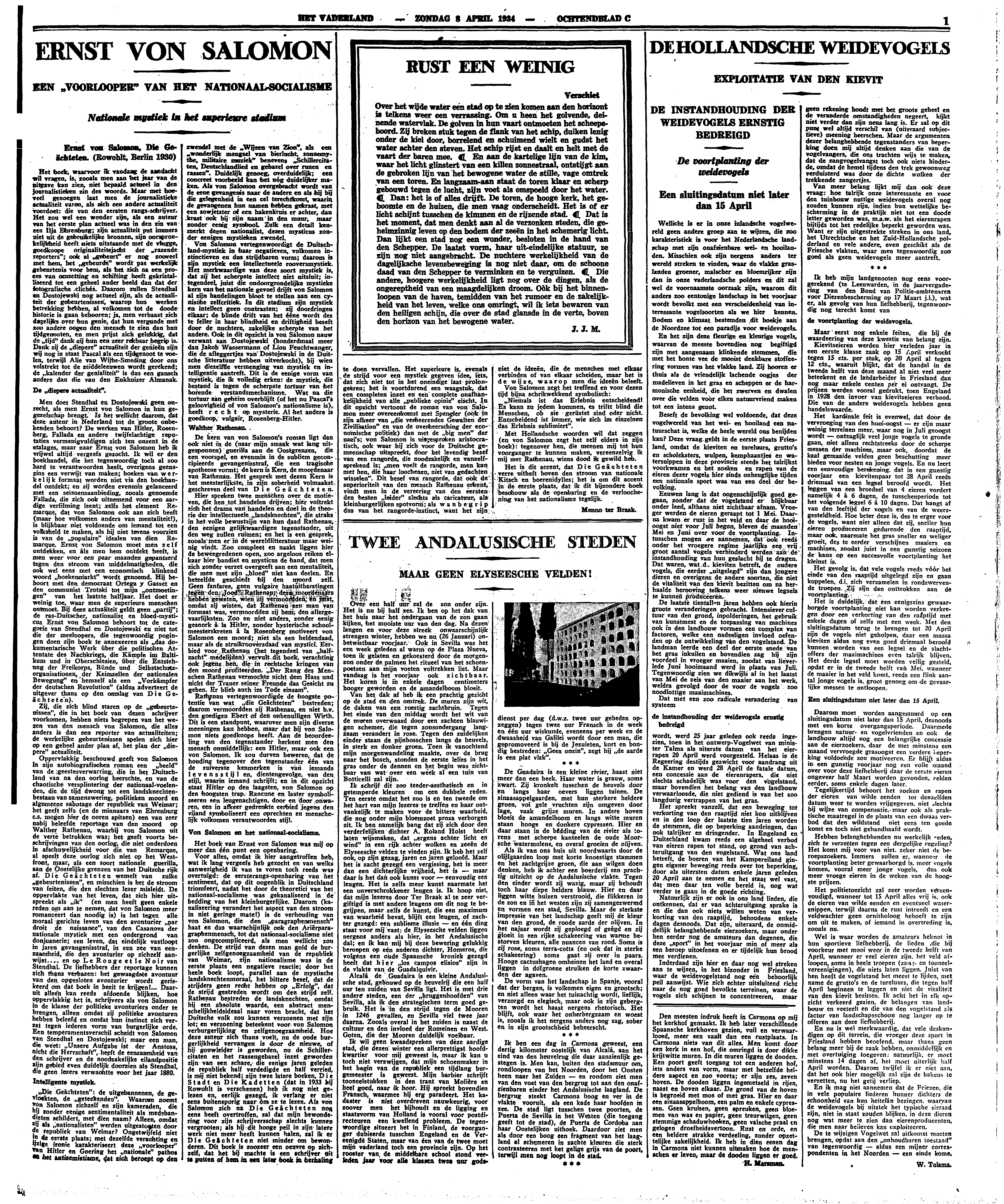 Men doet Stendhal en Dostojewski geen onrecht, als men Ernst von Salomon in hun gezelschap brengt. Is het wellicht daarom, dat deze auteur in Nederland tot de groote onbekenden behoort? De werken van Hitler, Rosenberg, Fallada en andere twijfelachtige reputaties vermenigvuldigen zich ten onzent in de etalages, maar naar Ernst von Salomon heb ik vrijwel altijd vergeefs gezocht. Ik wil er den boekhandel, die het tegenwoordig toch al zoo hard te verantwoorden heeft, overigens geenszins een verwijt van maken; boeken van werkelijk formaat worden niet via den boekhandel ontdekt; en zij worden evenmin gelanceerd met een seizoensaanbieding, zooals genoemde Fallada, die zich ook uitnemend voor een aardige verfilming leent; zelfs het element Remarque, dat Von Salomon ook aan zich heeft (maar hoe volkomen anders van mentaliteit!), is blijkbaar niet voldoende om iemand tot een volksheld te maken, als hij niet tevens voorzien is van de ‘populaire’ idealen van dien Remarque. Ernst von Salomon moet men zelf ontdekken, en áls men hem ontdekt heeft, is men weer voor een paar maanden gepantserd tegen den stroom van middelmatigheden, die ook wel eens met een economisch klinkend woord ‘boekenmarkt’ wordt genoemd. Hij behoort met den democraat Ortéga y Gasset en den communist Trotski tot mijn ‘ontmoetingen’ van het laatste halfjaar. Het doet er weinig toe, waar men de superieure menschen ontmoet. Bij deze actualiteit geldt geen ‘partij’; de ras-Duitscher, nationalist en bloed-mysticus Ernst von Salomon behoort tot de categorie van Stendhal en Dostojewski en niet tot die der meeloopers, die tegenwoordig pogingen doen zijn boek te annexeeren als ‘das dokumentarische Werk über die politischen Attentate des Nachkriegs, die Kämpfe im Baltikum und in Oberschlesien, über die Entstehung der Freikorps, Bünde und Selbstschutzorganisationen; der Keimzellen der nationalen Bewegung’ en hemzelf als een ‘Vorkämpfer der deutschen Revolution’ (aldus adverteert de uitgever thans op den omslag van Die Geächteten).
