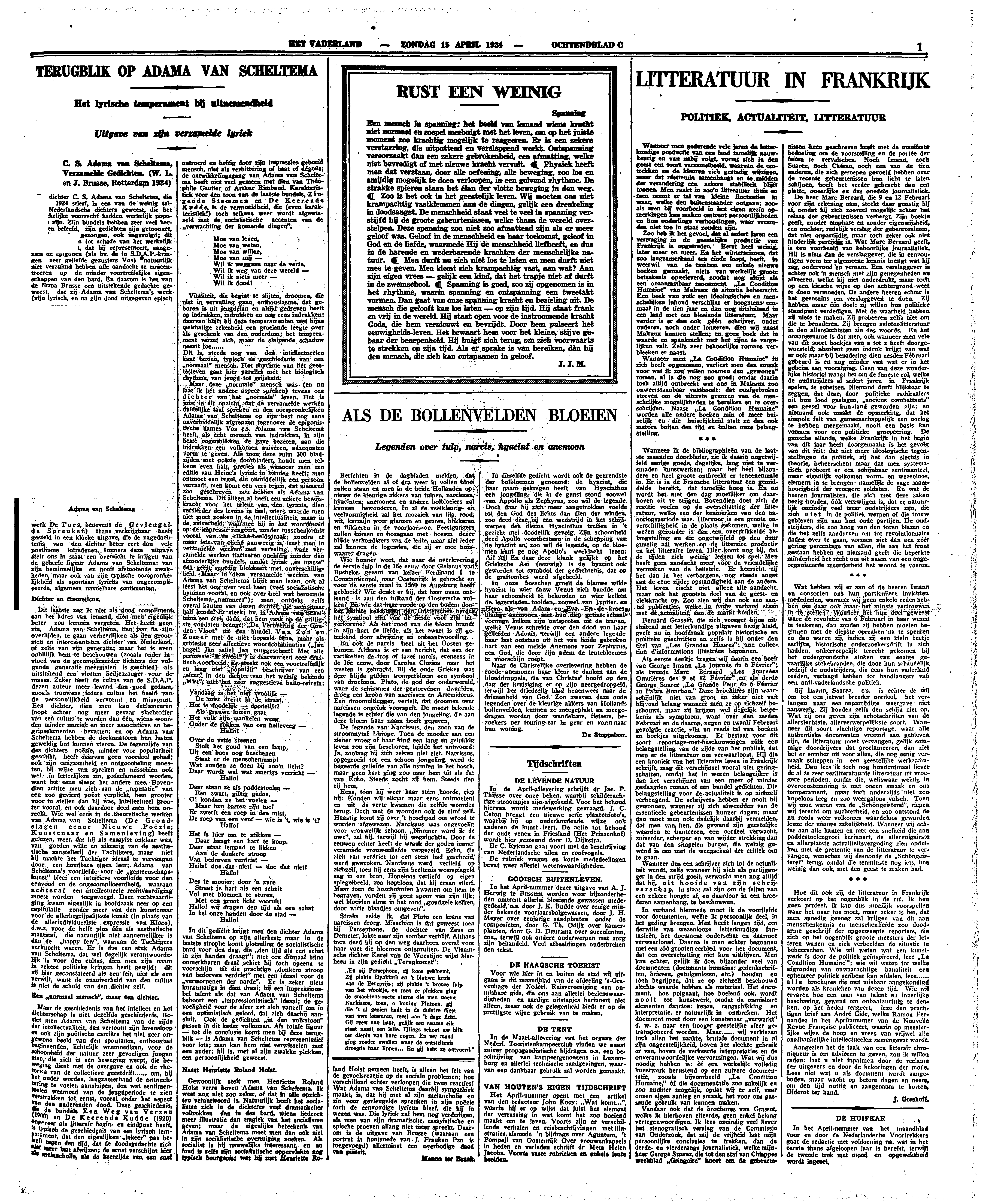 De dichter C.S. Adama van Scheltema, die 6 Mei 1924 stierf, is een van de weinig talrijke Nederlandsche dichters geweest, die het betrekkelijke voorrecht hadden werkelijk populair te zijn. Zijn bundels hebben zeer veel herdrukken beleefd, zijn gedichten zijn getoonzet, gedeclameerd, gezongen, ook nagevolgd; dit laatste niet dan tot schade van het werkelijk poëtisch talent, dat hij representeert, aangezien de epigonen (als bv. de in S.D.A.P.-kringen zeer geliefde gezusters Vos) natuurlijk niet verzuimd hebben alle aandacht te concentreeren op de minder voortreffelijke eigenschappen van den bard. En daarom is het van de firma Brusse een uitstekende gedachte geweest, dat zij Adama van Scheltema's werk (zijn lyrisch, en na zijn dood uitgegeven episch werk De Tors, benevens de Gevleugelde Spreuken) thans verkrijgbaar heeft gesteld in een kloeke uitgave, die de nagedachtenis van de dichter beter eert dan vele posthume lofredenen. Immers deze uitgave stelt ons in staat een overzicht te krijgen van de geheele figuur Adama van Scheltema; van zijn beminnelijke en nooit afstotende zwakheden, maar ook van zijn typische oorspronkelijkheid als spontaan lyricus van ongecompliceerde, algemeen navoelbare sentimenten.
