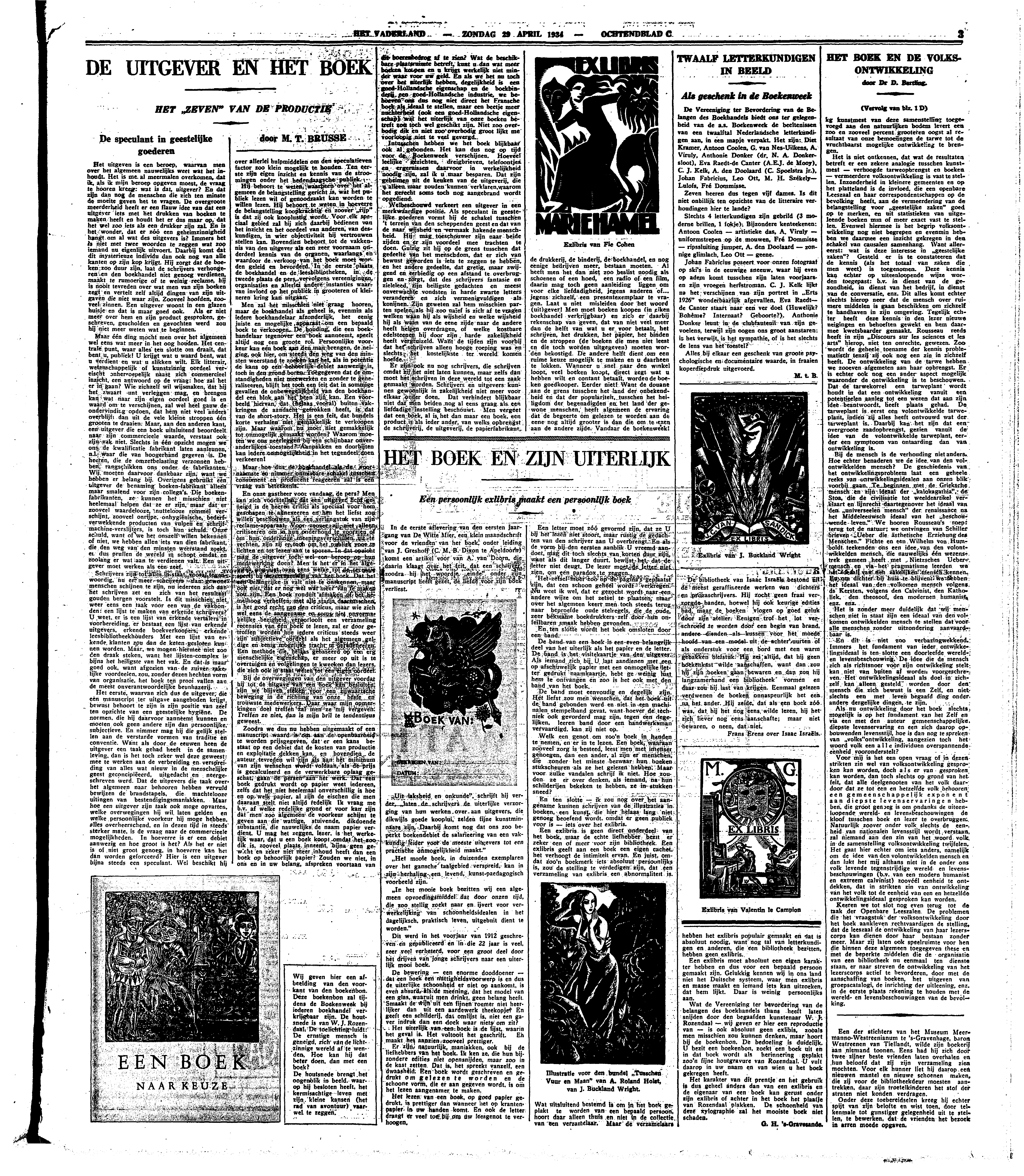 De Vereeniging ter Bevordering van de Belangen des Boekhandels biedt ons ter gelegenheid van de a.s. Boekenweek de beeltenissen van een twaalftal Nederlandsche letterkundigen aan, in een mapje verpakt. Het zijn: Diet Kramer, Antoon Coolen, G. van Nes-Uilkens, A.Viruly, Anthonie Donker (dr. N.A. Donkersloot), Eva Raedt-de Canter (A.E.J. de Mooy), C.J. Kelk, A. den Doolaard (C. Spoelstra jr.), Johan Fabricius, Leo Ott, M.H. Székely-Lulofs, Fré Dommisse.