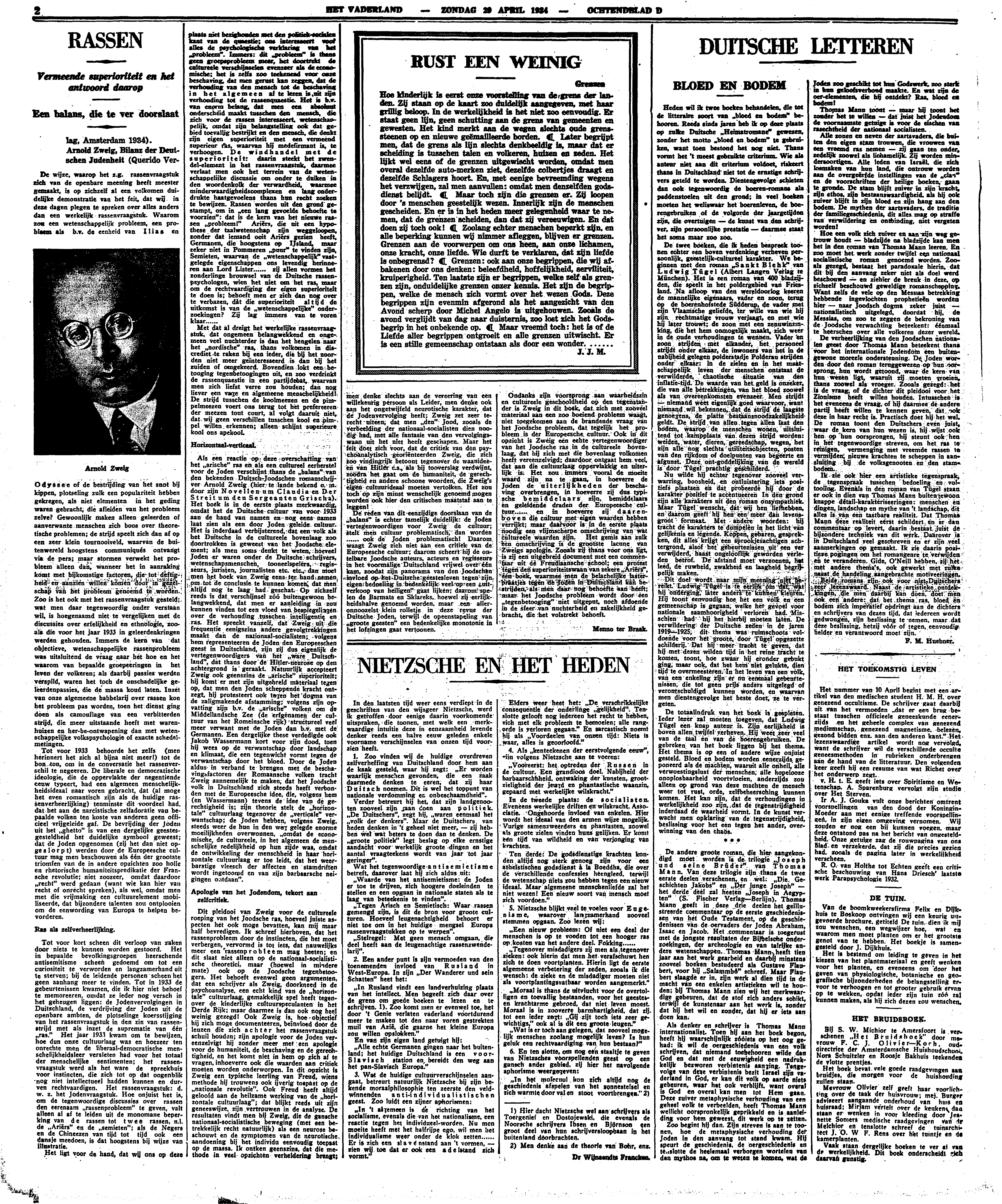 Als een reactie op deze overschatting van het ‘arische’ ras en als een cultureel eerherstel voor de Joden verschijnt thans de ‘balans’ van den bekenden Duitsch-Joodschen romanschrijver Arnold Zweig (hier te lande bekend o.m. door zijn Novellen um Claudia en Der Streit um den Sergeanten Grischa). Het boek is in de eerste plaats merkwaardig, omdat het de Duitsche cultuur van voor 1933 aan de hand van namen en nog eens namen laat zien als een door Joden geleide cultuur. Het is inderdaad verbijsterend, dat een volk als het Duitsche in de cultureele bovenlaag zoo doortrokken is geweest van het Joodsche element; als men soms denkt te weten, hoeveel Joden er waren onder de Duitsche schrijvers, wetenschapsmenschen, tooneelspelers, regisseurs, juristen, journalisten etc. etc., dan moet men het boek van Zweig eens ter hand nemen om tot de conclusie te kunnen komen, dat men altijd nog te laag had geschat. Op zichzelf reeds is dat verschijnsel zóó buitengewoon belangwekkend, dat men er aanleiding in zou kunnen vinden tot een vloed van bespiegelingen over de verhouding tusschen intelligentie en ras. Het spreekt vanzelf, dat Zweig uit die frequentie eenigszins andere gevolgtrekkingen maakt dan de nationaal-socialisten; volgens hem representeeren de Joden den Europeeschen geest in Duitschland, zijn zij dus eigenlijk de vertegenwoordigers van het ‘ware Duitschland’, dat thans door de Hitler-neurose op den achtergrond is geraakt. Natuurlijk accepteert Zweig ook geenszins de ‘arische’ superioriteit; hij komt er met zijn uitgebreid materiaal tegen op, dat men den Joden scheppende kracht ontzegt, hij protesteert ook tegen het dogma van de zaligmakende afstamming; volgens zijn opvatting zijn b.v. de ‘arische’ volken om de Middellandsche Zee (de erfgenamen der cultuur van het Romeinsche rijk) structureel veel meer verwant met de Joden dan b.v. met de Germanen. Een dergelijke these verdedigde ook Jakob Wassermann kort voor zijn dood, toen hij wees op de verwantschap door landschap en klimaat, die een tegenwicht vormt tegen de verwantschap door het bloed. Door de Joden aldus in verband te brengen met de beschavingsfactoren der Romaansche volken tracht Zweig aannemelijk te maken, dat het Joodsche volk in Duitschland zich steeds heeft verbonden met de Europeesche idee, die, volgens hem (en Wassermann) tevens de idee van de gerechtigheid is; zijn theorie stelt de ‘horizontale’ cultuurlaag tegenover de ‘verticale’ verwantschap; de Joden hebben, volgens Zweig, steeds weer de hun in den weg gelegde enorme moeilijkheden overwonnen, ‘omdat de economische, de cultureele, in het algemeen de menschelijke redelijkheid op hun zijde was, omdat de ontwikkeling der menschheid in haar horizontale cultuurlaag er toe leidt, dat het weerbarstige vleesch der affecten en stamdriften wordt ingetoomd en van zijn barbaarsche neigingen ontdaan’.