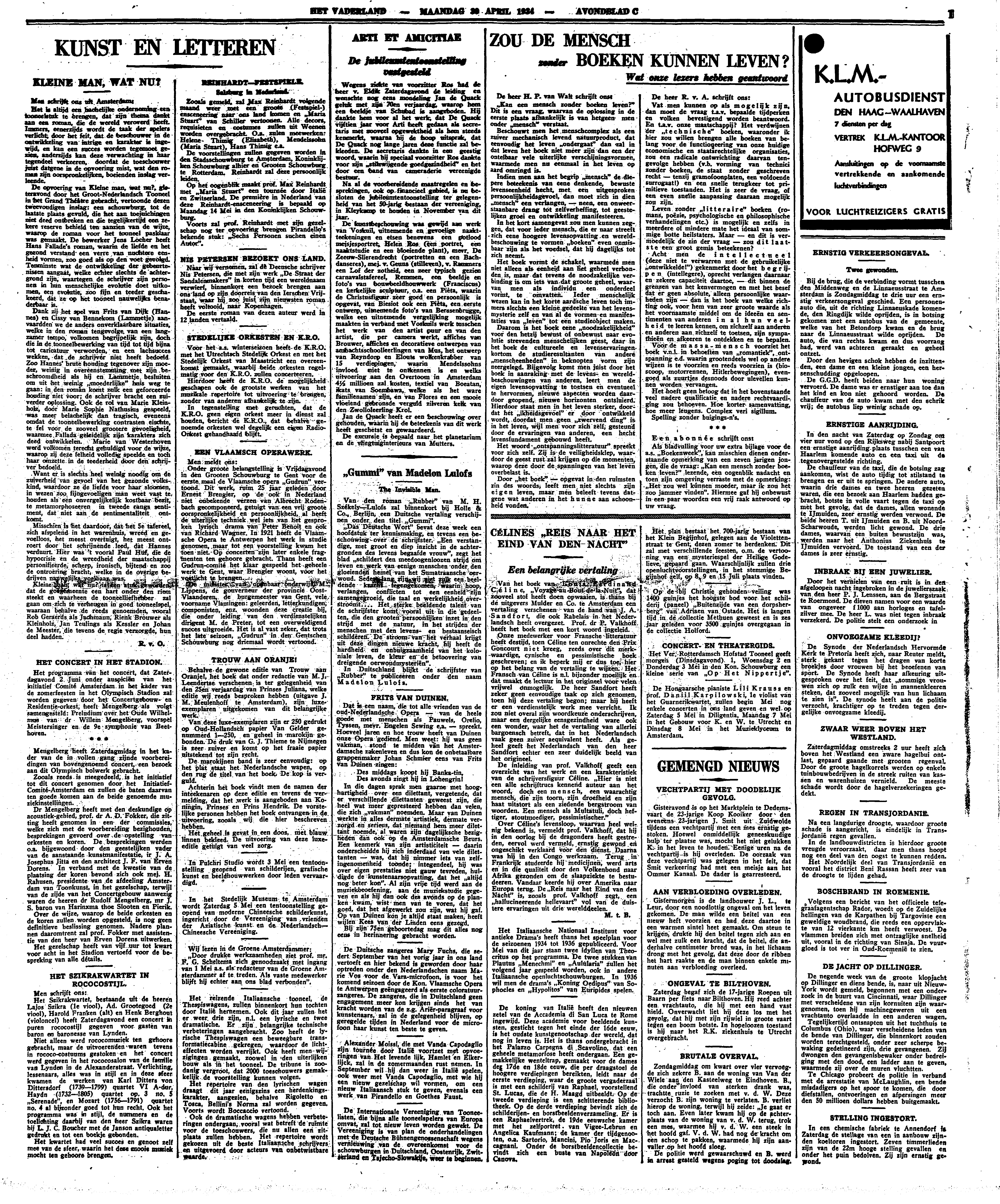Van het boek van Louis Ferdinand Céline, Voyage au Bout de la Nuit, dat zooveel stof heeft doen opwaaien, is thans bij de uitgevers Mulder en Co. te Amsterdam een vertaling verschenen van de hand van J.A. Sandfort, die ook Rabelais in het Nederlandsch heeft overgezet. Prof. dr. P. Valkhoff heeft het boek met een kort woord ingeleid.
