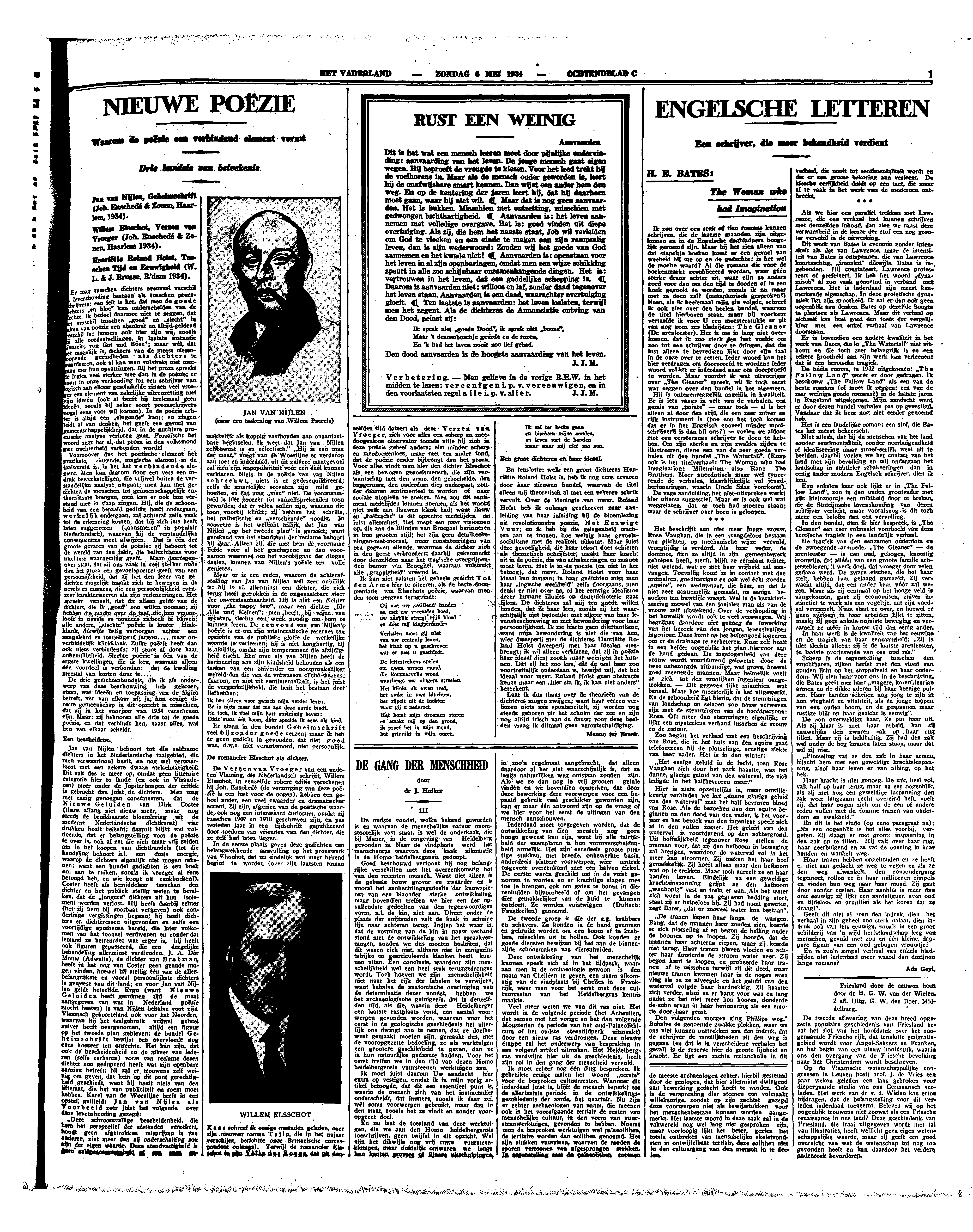 Jan van Nijlen behoort tot die zeldzame dichters in het Nederlandsche taalgebied, die men verwaarloosd heeft, en nog wel verwaarloost met een zekere dwaze stelselmatigheid. Dit valt des te meer op, omdat geen litteraire categorie hier te lande (en ook in Vlaanderen) meer onder de Jupiterlampen van de critiek is gebracht dan juist de dichters. Men mag met eenig genoegen constateeren, dat de Nieuwe Geluiden van Dirk Coster (thans allang niet nieuw meer, maar nog steeds de bruikbaarste bloemlezing uit de moderne Nederlandsche dichtkunst) vier drukken heeft beleefd; daaruit blijkt wel voldoende, dat er belangstelling voor de poëzie te over is, ook al zet die zich maar vrij zelden om in het koopen van dichtbundels (tot die handeling behoort n.l. een dosis energie, waarop de dichters eigenlijk niet mogen rekenen; want een bundel gedichten is een boek om aan te ruiken, zooals ik vroeger al eens betoogd heb, en wie koopt nu reukboeken!). Coster heeft als bemiddelaar tusschen den dichter en het publiek stellig weten te bereiken, dat de ‘jongere’ dichters uit hun isolement werden verlost. Hij heeft daarbij echter (het zij hem bij voorbaat vergeven) ook zonderlinge vergissingen begaan; hij heeft dichters en dichteressen uitgevonden en zelfs een voortijdige apotheose bereid, die later volkomen van het tooneel verdwenen en zonder dat iemand ze betreurde; wat erger is, hij heeft ook figuren gepasseerd, die een dergelijke behandeling allerminst verdienden. J.A. Dèr Mouw (Adwaita), de dichter van Brahman, heeft in het oog van Coster geen genade mogen vinden, hoewel hij stellig één van de allerbelangrijkste en vooral persoonlijkste dichters is geweest van dit land; en voor Jan van Nijlen geldt hetzelfde. Ergo (want Nieuwe Geluiden heeft geruimen tijd de maat aangegeven van wat in Nederland poëzie mocht heeten) is Van Nijlen behalve voor zijn Vlaamsch geboorteland ook voor het Noorden, waarvan hij het taalgebruik vrijwel geheel zuiver heeft overgenomen, altijd een figuur op het tweede plan gebleven; de bundel Geheimschrift bewijst ten overvloede nog eens hoezeer ten onrechte. Het kan zijn, dat ook de bescheidenheid en de afkeer van iederen (zelfs eerbaren) vorm van reclame dezen dichter zoo gedupeerd heeft wat zijn openbare aanzien betreft; hij zal er trouwens zelf weinig om geven, dat hem op dit punt gerechtigheid geschiedt, want hij heeft niets van den litteraat, die het van publiciteit en roem moet hebben. Karel van de Woestijne heeft in een opstel, getiteld: Jan van Nijlen als Voorbeeld zeer juist het volgende over deze levenshouding gezegd: