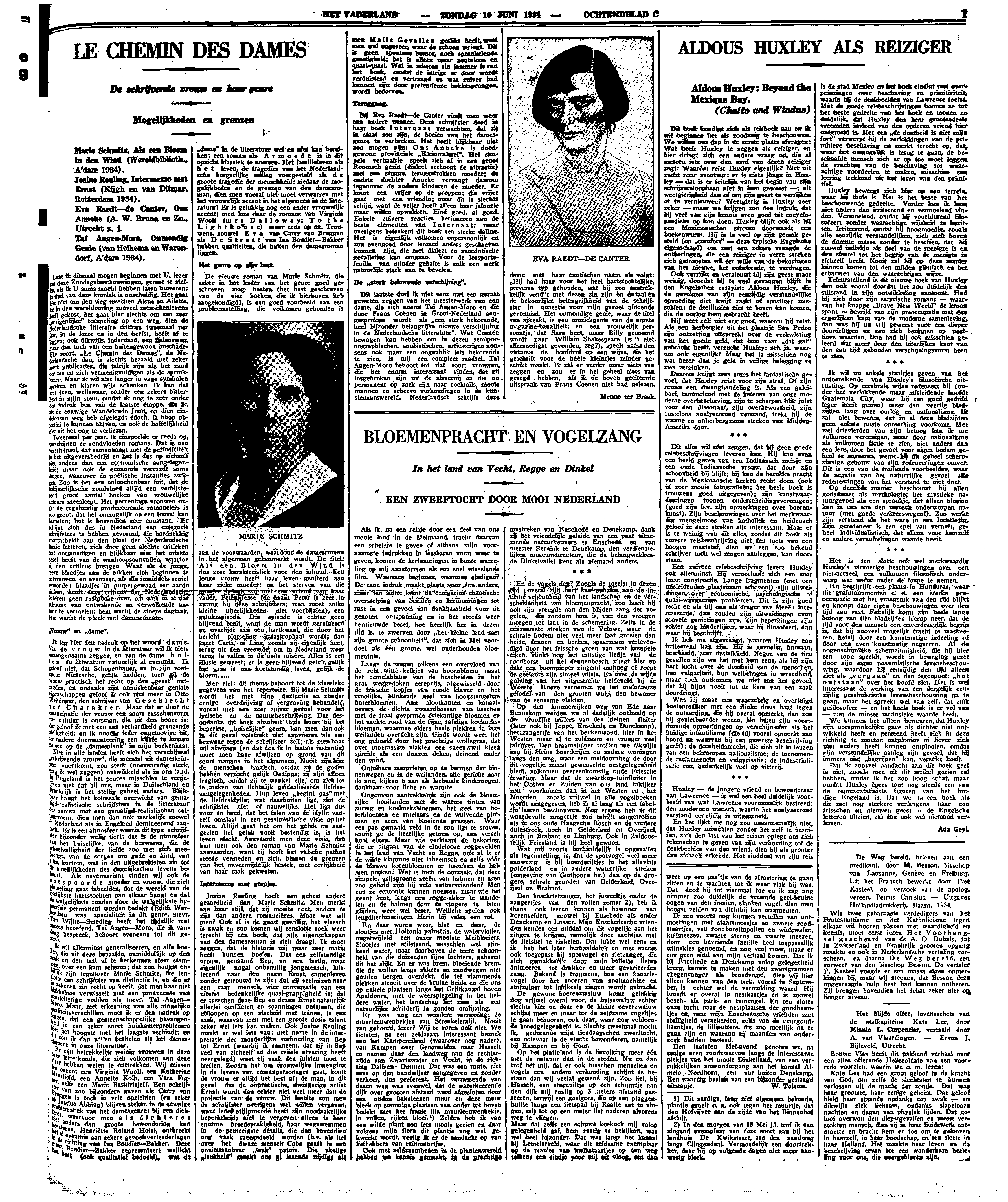 Ik wil allerminst generaliseeren, en alle boeken, die uit deze bepaalde onmiddellijk op den reuk en den tast af te herkennen sfeer stammen, over een kam scheren; dat zou hoogst onbillijk zijn tegenover Marie Schmitz, die tenslotte een schrijfster van distinctie is, en die er in zekeren zin recht op heeft, dat men haar niet klakkeloos verwisselt met een producente van aanstellerige vodden als mevr. Taï Aagen-Moro. Maar, met erkenning van alle mogelijke qualiteitsverschillen, moet ik er den nadruk op leggen, dat een gemeenschappelijke bevangenheid in een zeker soort huiskamerproblemen hier het hoogste met het laagste verbindt; en dit zou ik dan willen betitelen als het dameselement in onze litteratuur.