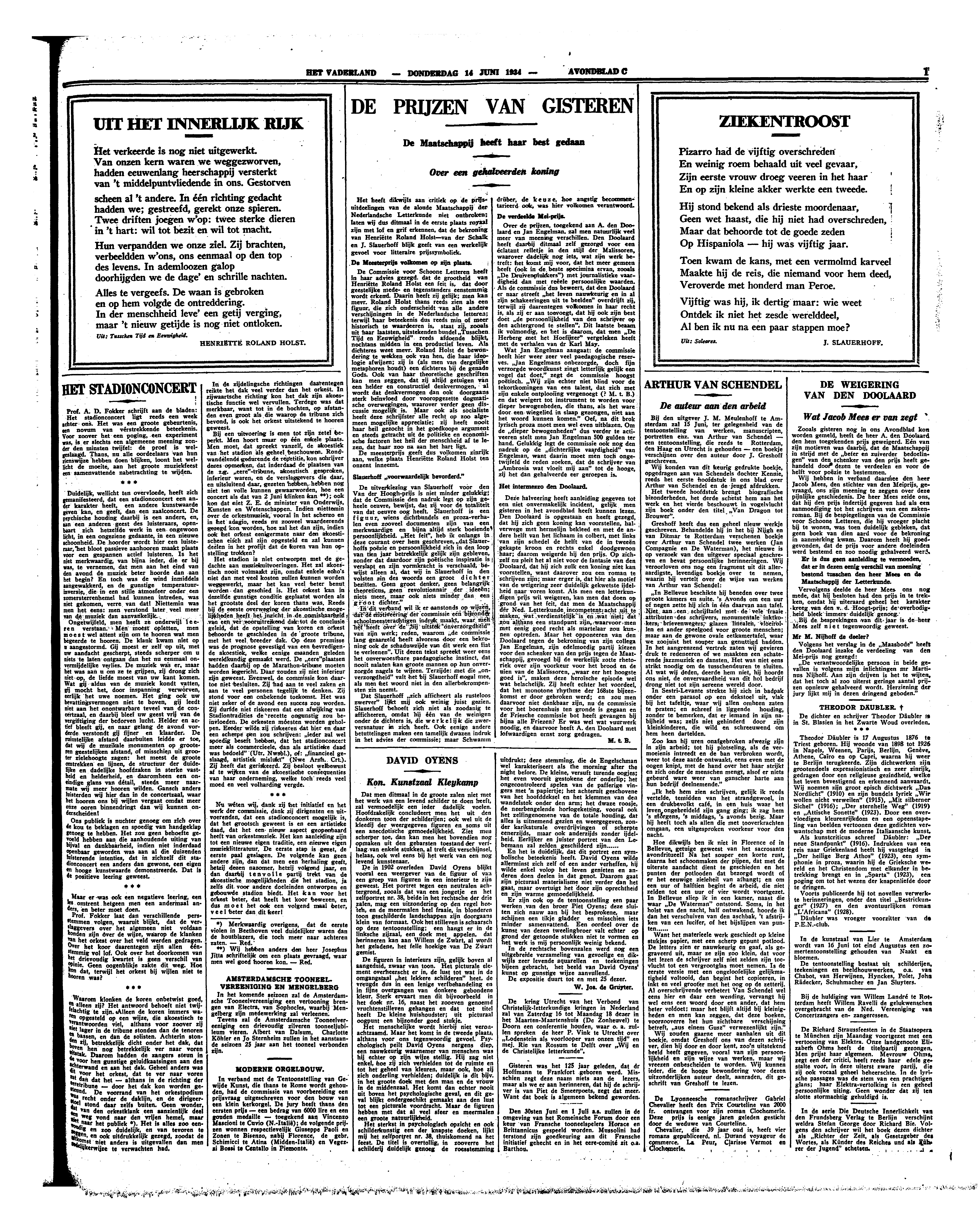 De uitverkiezing van Slauerhoff voor den Van der Hoogh-prijs is niet minder gelukkig; dat de Commissie den nadruk legt op zijn geheele oeuvre, bewijst, dat zij voor de totaliteit van dat oeuvre oog heeft. Slauerhoff is een figuur, wiens dichtbundels en proza-verhalen even zooveel documenten zijn van een merkwaardige en bijna altijd sterk boeiende persoonlijkheid. ‘Het feit’, heb ik onlangs in deze courant over hem geschreven, ‘dat Slauerhoffs poëzie en persoonlijkheid zich in den loop van tien jaar betrekkelijk gelijk zijn gebleven, zonder dat daardoor zijn poëtische inspiratie is verslapt en zijn vormkracht is verschaald, bewijst alleen al, dat wij in Slauerhoff in den volsten zin des woords een groot dichter bezitten. Geen groot denker, geen belangrijk theoreticus, geen revolutionnair der ideeën; niets meer, maar ook niets minder dan een groot dichter.’