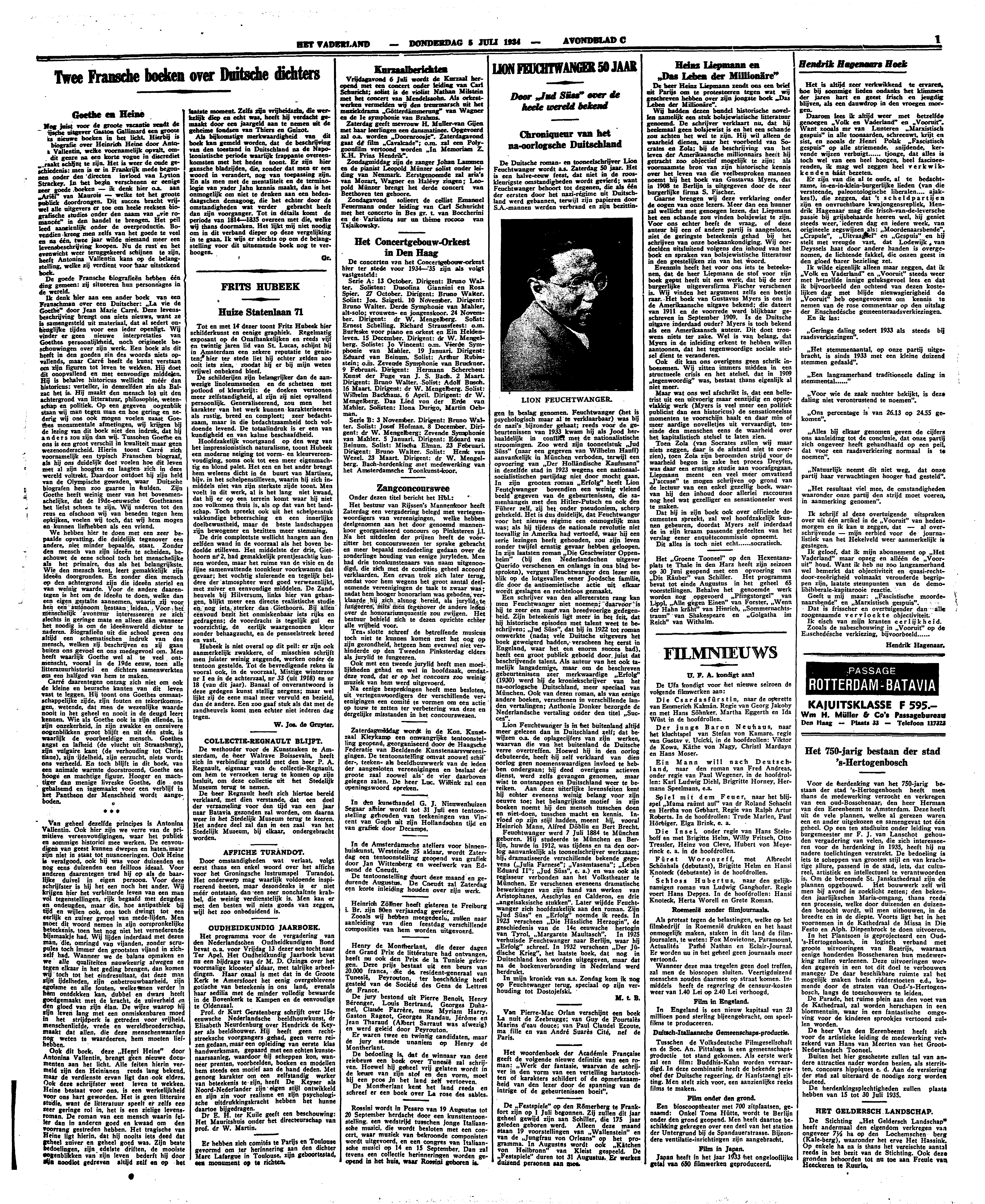 De Duitse roman- en toneelschrijver Lion Feuchtwanger wordt a.s. zaterdag 50 jaar. Het is een halve-eeuw feest dat niet in de rooskleurigste omstandigheden wordt gevierd; want Feuchtwanger behoort tot degenen die als een der eersten door het nazi-regime uit Duitsland werd gebannen, terwijl zijn papieren door S.A.-mannen werden verbrand en zijn bezittingen in beslag genomen. Feuchtwanger (het is psychologisch maar al te verklaarbaar) was bij de nazi's bijzonder gehaat; reeds voor de gebeurtenissen van 1933 kwam hij als Jood herhaaldelijk in conflict met de nationalistische stromingen. Zo werd zijn toneelstuk Jud Süss (naar een gegeven van Wilhelm Hauff) aanvankelijk in München verboden, terwijl een opvoering van Der holländische Kaufmann in dezelfde stad in 1923 wegens een nationaal-socialistische partijdag niet door mocht gaan. In zijn grote roman Erfolg heeft Lion Feuchtwanger bovendien een weinig vleiend beeld gegeven van de gebeurtenissen die samenhangen met de Hitler-Putsch en ook de Führer zelf, zij het onder pseudoniem, scherp gehekeld. Het is dus duidelijk dat Feuchtwanger voor het nieuwe regime een onmogelijk man was; als hij tijdens de nationale revolutie niet toevallig in Amerika had vertoefd, waar hij een serie lezingen heeft gehouden, zou zijn leven zonder twijfel ernstig gevaar hebben gelopen. In zijn laatste roman Die Geschwister Oppenheim (bij de Nederlandse uitgever Querido verschenen en onlangs in ons blad besproken) vergunt Feuchtwanger de lezer een blik op de lotgevallen ener Joodse familie die door de antisemitische actie uit elkaar wordt geslagen en rechteloos gemaakt.