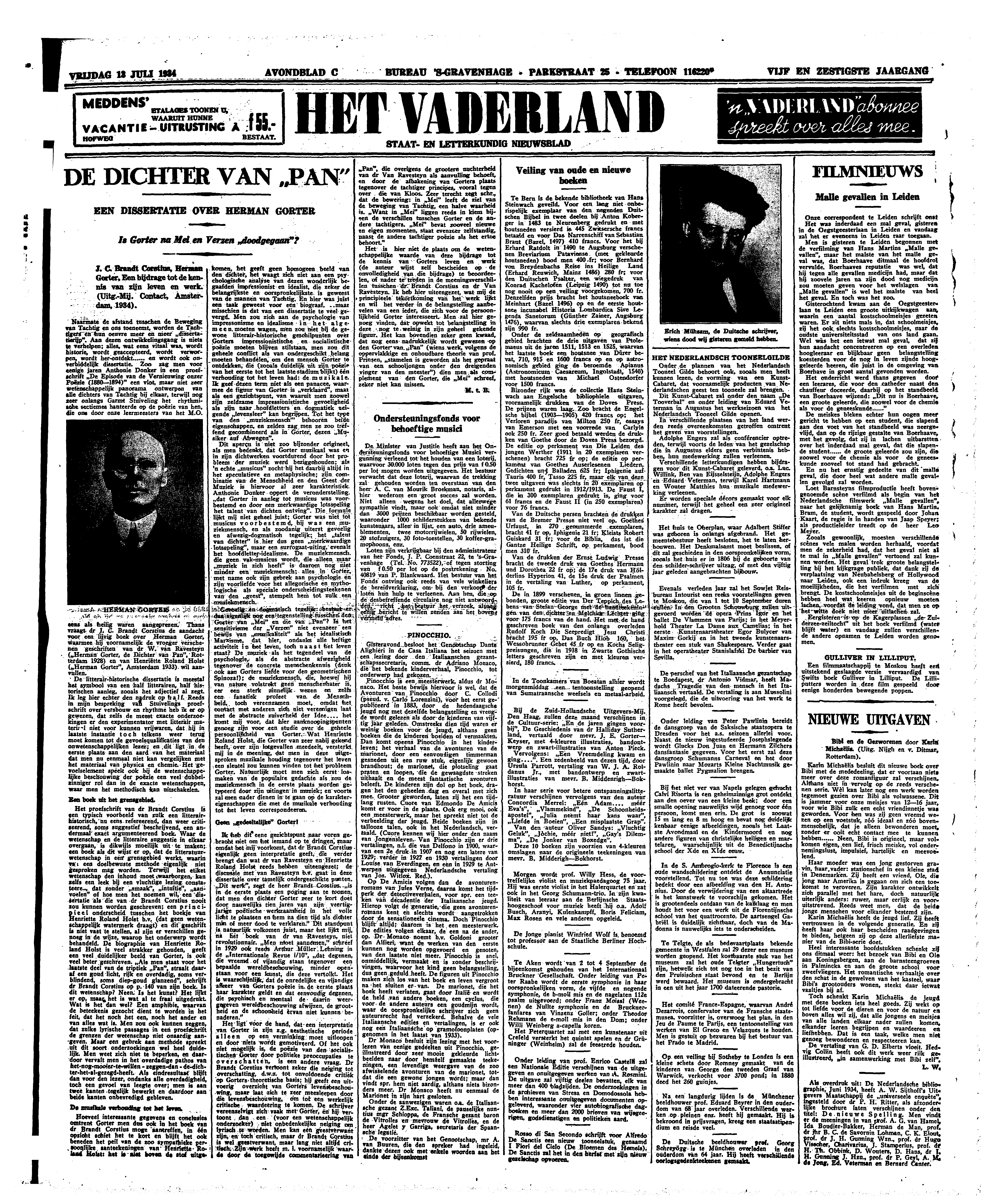 Naarmate de afstand tusschen de Beweging van Tachtig en ons toeneemt, worden de Tachtigers en hun oeuvre meer en meer ‘dissertatierijp’. Aan dezen ontwikkelingsgang is niets te verhelpen; alles, wat eens vitaal was, wordt historie, wordt geaccepteerd, wordt verworpen, wordt her-ontdekt... en wordt ook onverbiddelijk dissertatie. Zoo zag men voor eenige jaren Anthonie Donker in een proefschrift De Episode van de Vernieuwing onzer Poëzie (1880-1894) een vlot, maar niet zeer wetenschappelijk panorama ontwerpen van alle dichters van Tachtig bij elkaar, terwijl nog zeer onlangs Garmt Stuiveling het rhythmische sectiemes hanteerde op de poëzie van hen, die ons door onze leermeesters van het M.O. eens als heilig waren aangeprezen. Thans vraagt dr. J.C. Brandt Corstius de aandacht voor een lijvig boek over Herman Gorter, waarmee hij voornamelijk de vroeger verschenen geschriften van dr. W. van Ravensteyn (Herman Gorter, de Dichter van ‘Pan’, Rotterdam, 1928) en van Henriëtte Roland Holst (Herman Gorter, Amsterdam, 1933) wil aanvullen.