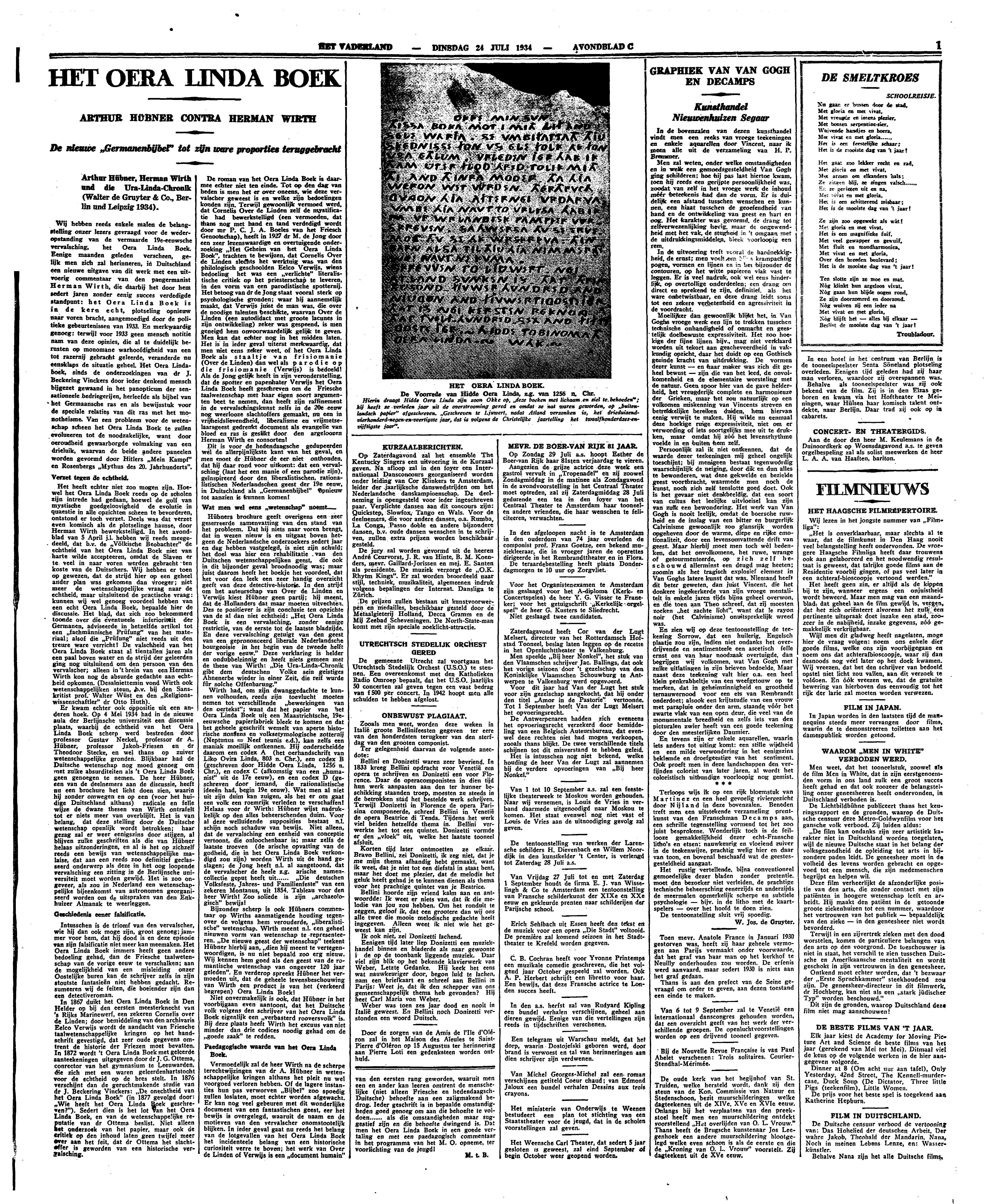 Wij hebben reeds enkele malen de belangstelling onzer lezers gevraagd voor de wederopstanding van de vermaarde 19e-eeuwsche vervalsching, het Oera Linda Boek. Eenige maanden geleden verscheen, gelijk men zich zal herinneren, in Duitschland een nieuwe uitgave van dit werk met een uitvoerig commentaar van den pangermanist Herman Wirth, die daarbij het door hem sedert jaren zonder eenig succes verdedigde standpunt: het Oera Linda Boek is in de kern echt, plotseling opnieuw naar voren bracht, aangemoedigd door de politieke gebeurtenissen van 1933. En merkwaardig genoeg: terwijl voor 1933 geen mensch notitie nam van deze opinies, die al te duidelijk berusten op monomane warhoofdigheid van een tot razernij gebrachte geleerde, veranderde nu eensklaps de situatie geheel. Het Oera Linda Boek, sinds de onderzoekingen van dr. J. Beckering Vinckers door ieder denkend mensch bijgezet gewaand in het panopticum der sensationeele bedriegerijen, herleefde als bijbel van het Germaansche ras en als bewijsstuk voor de speciale relaties van dit ras met het monotheïsme. Van een probleem voor de wetenschap scheen het Oera Linda Boek te zullen evolueeren tot de noodzakelijke, want door oeroudheid gewaarborgde volmaking van een drieluik, waarvan de beide andere paneelen worden gevormd door Hitlers Mein Kampf en Rosenbergs Mythus des 20. Jahrhunderts.