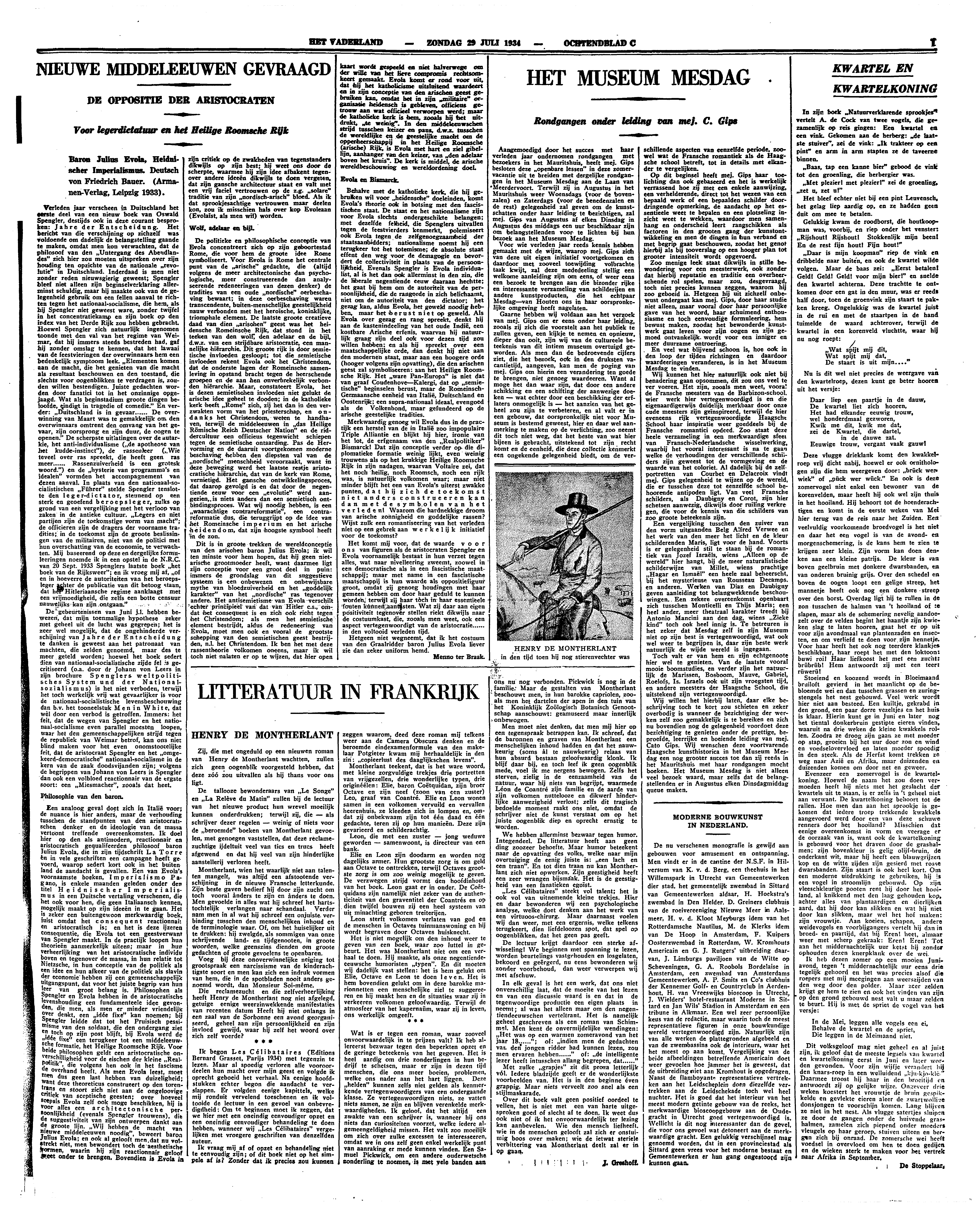 Een analoog geval doet zich in Italië voor; de nuance is hier anders, maar de verhouding tusschen het standpunt van den aristocratischen denker en de ideologie van de massa vertoont treffende overeenkomsten. Ik doel hier op den als antimodern, reactionnair en aristocratisch gequalificeerden philosoof baron Julius Evola, die in zijn tijdschrift La Torre en in vele geschriften een campagne heeft gevoerd, waarop sedert kort ook in het buitenland de aandacht is gevallen. Een van Evola's voornaamste boeken, Imperialismo Pagano, is enkele maanden geleden onder de titel Heidnischer Imperialismus in een Duitsche vertaling verschenen, die het ook voor hen, die geen Italiaansch kennen, mogelijk maakt op zijn ideeën in te gaan. Het is zeker een buitengewoon merkwaardig boek, juist omdat het consequent reactionnair en aristocratisch is; en het is deze ijzeren consequentie, die Evola tot een geestverwant van Spengler maakt. In de practijk loopen hun theorieën aanmerkelijk uiteen; maar in hun verheerlijking van het aristocratische individu boven en tegenover de massa, in hun relatie tot Nietzsche, in hun conceptie van de politiek als een idee en hun afkeer van de politiek als slavin der economie hebben zij een gemeenschappelijk uitgangspunt, dat voor het juiste begrip van hun leer van groot belang is. Philosophen als Spengler en Evola hebben in de aristocratische levenshouding een fundamenteele idee gevonden, die men, als men er minder vriendelijk over denkt, een ‘idée fixe’ kan noemen; bij Spengler leidde dat tot het Pruisisch pessimisme van de soldaat, die de ondergang ziet en toch op zijn post blijft, bij Evola werd de ‘idée fixe’ een terugkeer tot een middeleeuwsche formatie, het Heilige Roomsche Rijk. Voor beide philosophen geldt een aristocratische onverschilligheid voor de eischen der kleine ‘Realpolitik’, die volgens hen ook in het fascisme de overhand heeft. Als men Evola leest, moet men dus ook geen last hebben van duizeligheid; want deze theoreticus construeert op de torentrans en stoort zich niet aan de ongeloovige critiek van sceptische geesten; over hoeveel scepsis Evola zelf ook moge beschikken, hij is voor alles een architectonische persoonlijkheid (evenals Spengler trouwens), die de suggestiviteit van zijn ontwerpen dankt aan de grote lijn. ‘Wij hebben de macht van nieuwe middeleeuwen noodig’, beweert baron Julius Evola; en ook al gelooft men dat nu volstrekt niet, men bewondert toch de aesthetische vormen, waarin hij zijn reactionnair geloof weet onder te brengen. Bovendien is Evola in zijn critiek op de zwakheden van tegenstanders dikwijls op zijn best; hij weet ons door de scherpte, waarmee hij zijn idee afbakent tegenover andere ideeën dikwijls te doen vergeten, dat zijn gansche architectuur staat en valt met een vrij faciel vertrouwen op de z.g. ‘solare’ traditie van zijn ‘nordisch-arisch’ bloed. Als ik dat sprookjesachtige vertrouwen maar deelen kon, zou ik misschien hals over kop Evoleaan (Evolaïst, als men wil) worden.