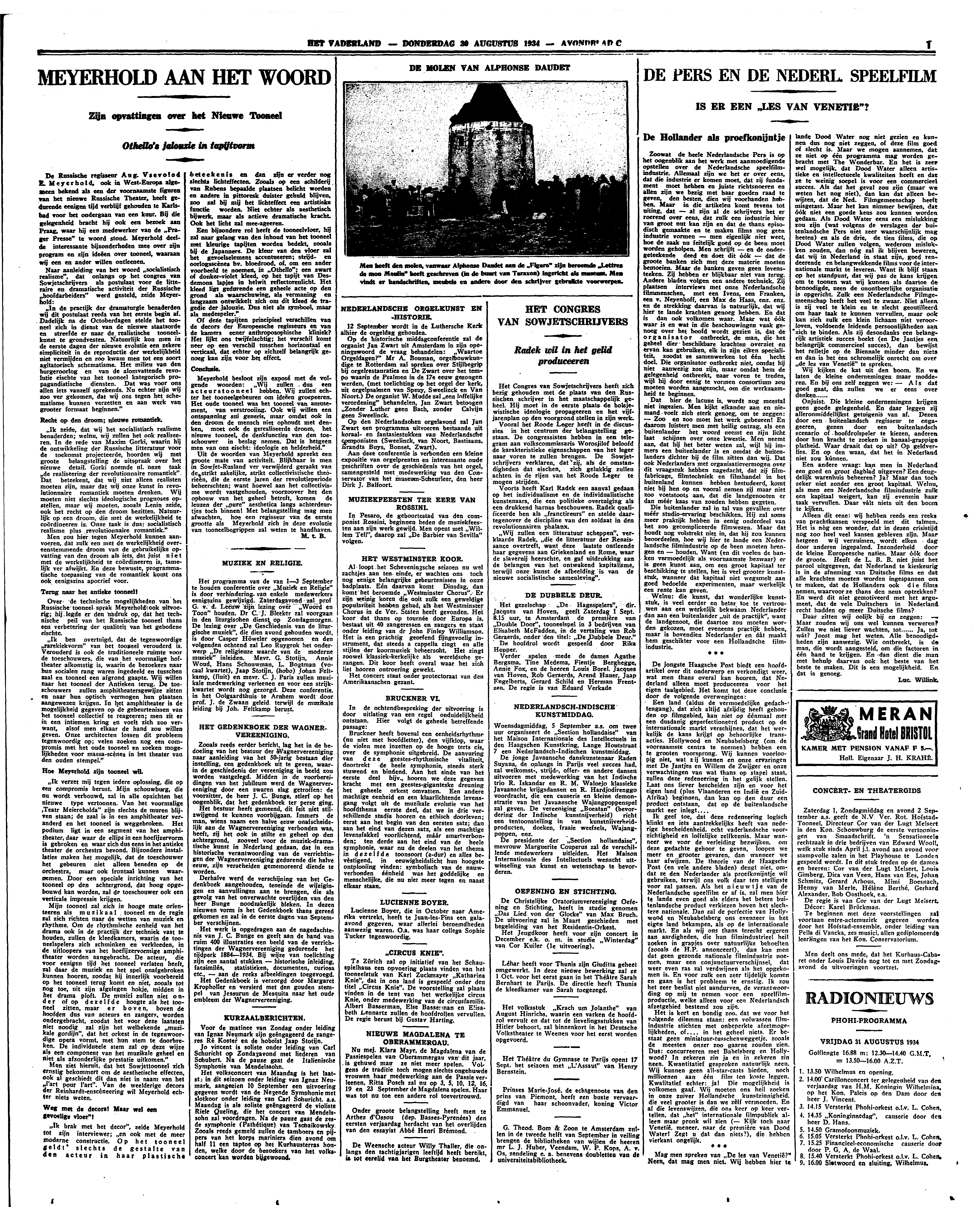 De Russische regisseur Aug. Vsevolod E. Meyerhold, ook in West-Europa algemeen bekend als een der voornaamste figuren van het nieuwe Russische Theater, heeft gedurende eenigen tijd verblijf gehouden te Karlsbad voor het ondergaan van een kuur. Bij die gelegenheid bracht hij ook een bezoek aan Praag, waar hij een medewerker van de Prager Presse te woord stond. Meyerhold deelde interessante bijzonderheden mee over zijn program en zijn ideëen over tooneel, waaraan wij een en ander willen ontleenen.
