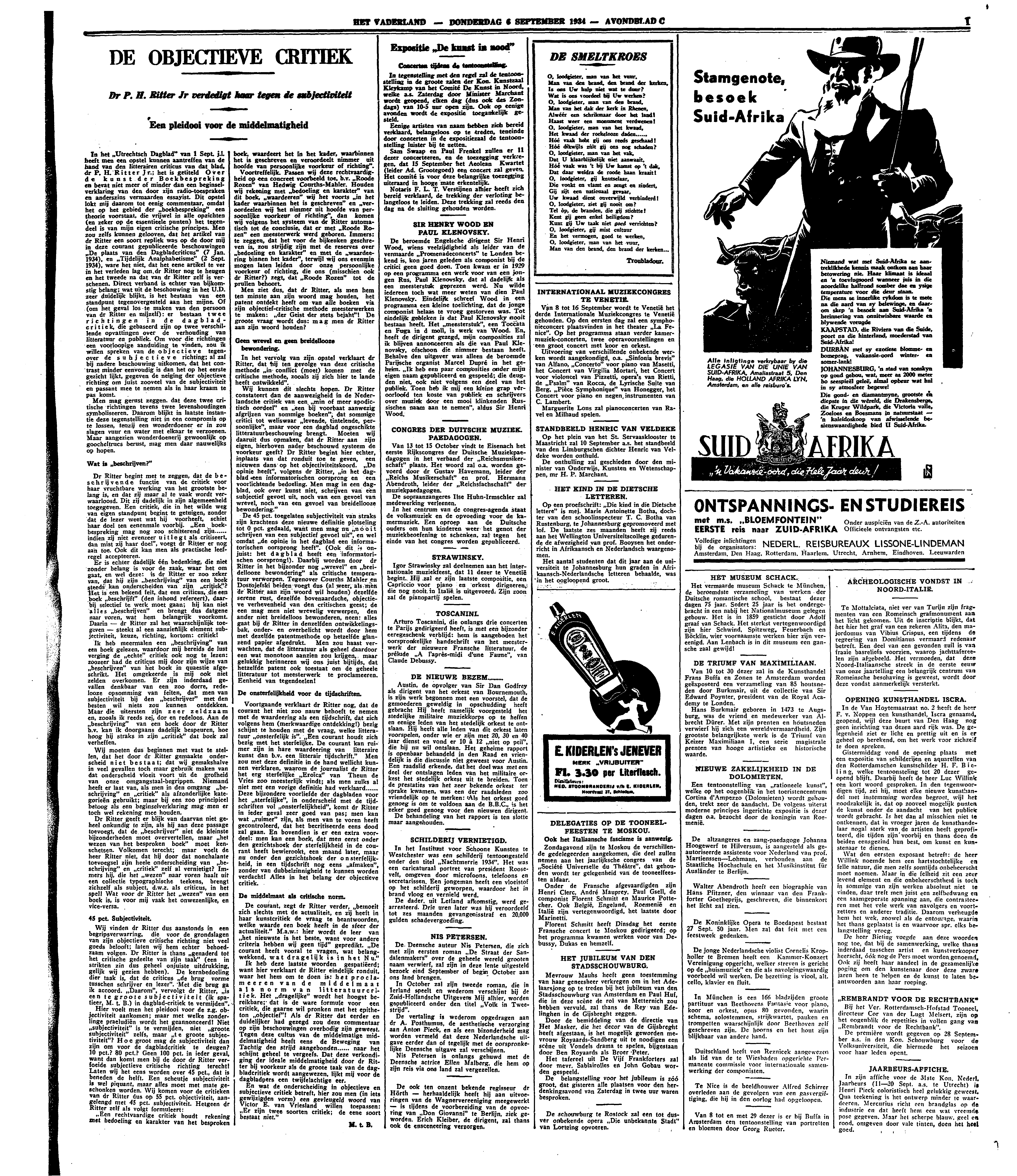 Wij kunnen dit slechts hopen. Dr. Ritter constateert dan de aanwezigheid in de Nederlandsche critiek van een ‘min of meer apodictisch oordeel’ en ‘een bij voorbaat aanwezig afgrijzen van sommige boeken’, dat sommige critici tot weliswaar ‘levende, tintelende, persoonlijke’, maar voor een dagblad ongeschikte litteratuurbeschouwing brengt. Moeten wij daaruit dus opmaken, dat dr. Ritter aan zijn eigen, hierboven nader beschouwd systeem de voorkeur geeft? Dr. Ritter begint hier echter, in plaats van dat ronduit toe te geven, een nieuwen dans op het objectiviteitskoord. ‘De opinie heeft’, volgens dr. Ritter, ‘in het dagblad een informatorischen oorsprong en een voorlichtende bedoeling. Men mag in een dagblad, ook over kunst niet, schrijven van een subjectief gevoel uit, noch van een gevoel van wrevel, noch van een gevoel van breidellooze bewondering’.