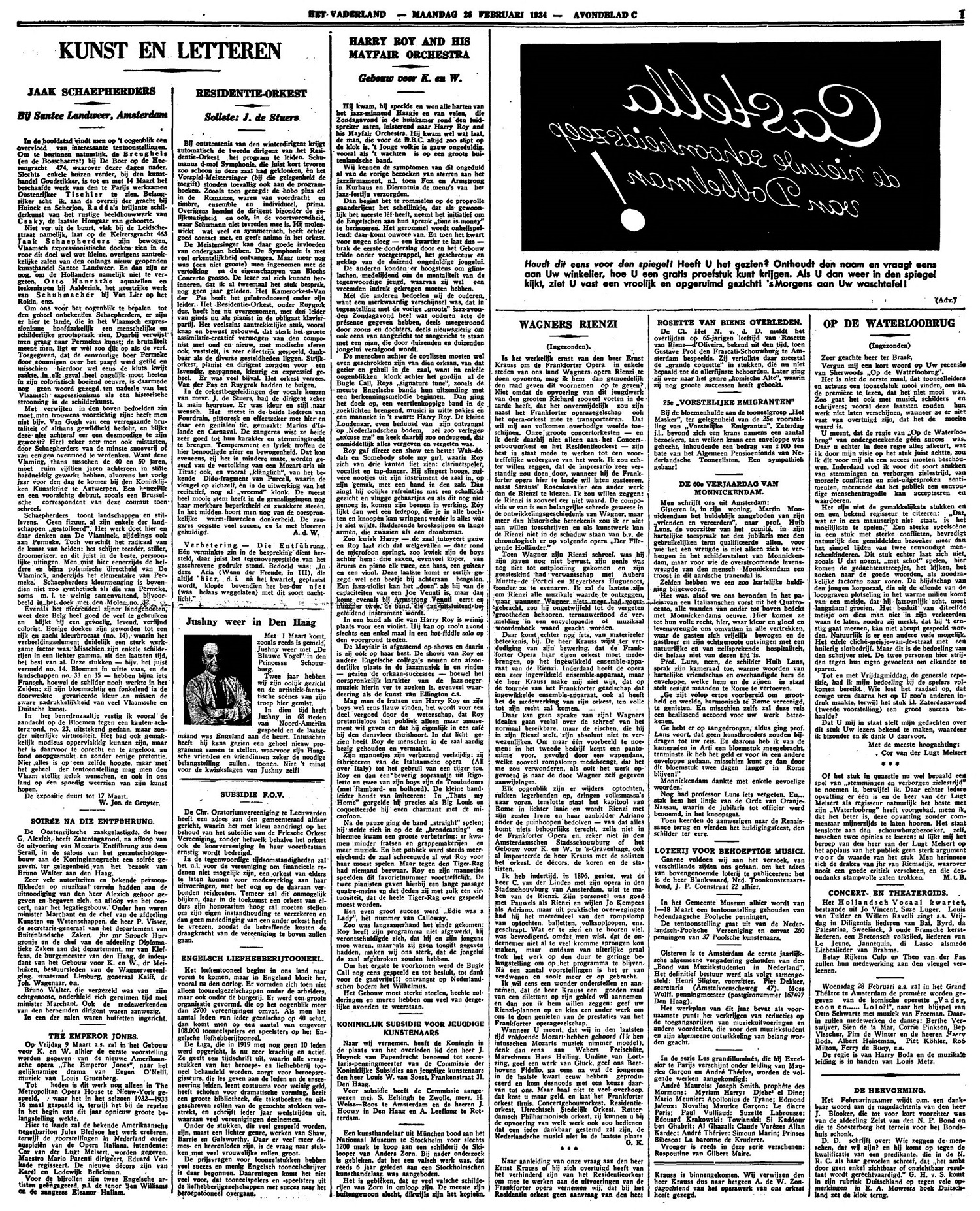 Of het stuk in quaestie nu wel bepaald een spel van ‘stemmingen en verborgen zielestrijd’ te noemen is, betwijfel ik. Daar echter iedere opvatting er één is en de heer van der Lugt Melsert als regisseur natuurlijk het beste met zijn ‘Waterloobrug’ heeft voorgehad, meen ik, dat het beter is, deze opvatting zonder commentaar mijnerzijds te laten hooren. Het staat tenslotte aan den schouwburgbezoeker, zelf, tusschen twee opinies te kiezen; al lijkt mij het beroep van den heer van der Lugt Melsert op het applaus van het publiek geen sterk argument voor de waarde van het stuk. Men herinnere zich de draken van jhr van Riemsdijk, waarover nooit een goede critiek verscheen, en die desondanks stampvolle zaten trokken.