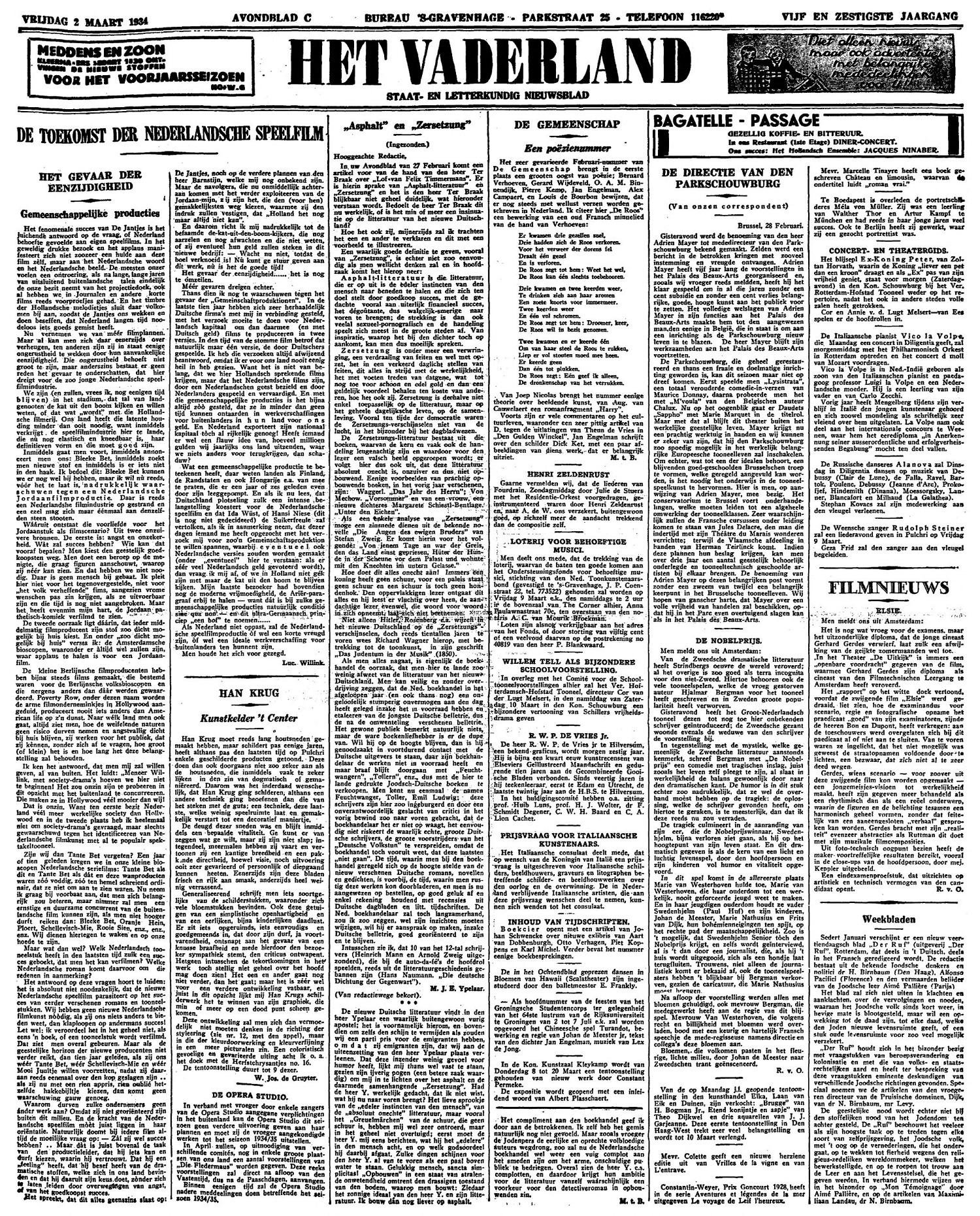 Het compliment aan den boekhandel geef ik door aan de betrokkenen. Ik zelf heb het gemis natuurlijk nog niet gevoeld. Maar zooals vroeger de Jodenpers de eerlijke en oprechte volbloedige auteurs wegdrong, zoo zal nu de Nederlandsche boekhandel wel weer een vuig complot aan het smeden zijn om het arme, onschuldige publiek te bedriegen. Overal zien de heer Y. c.s. complotten, en daardoor krijgt hun ambitie voor de litteratuur vanzelf waarschijnlijk een voorkeur voor den detectiveroman in opbouwenden zin.