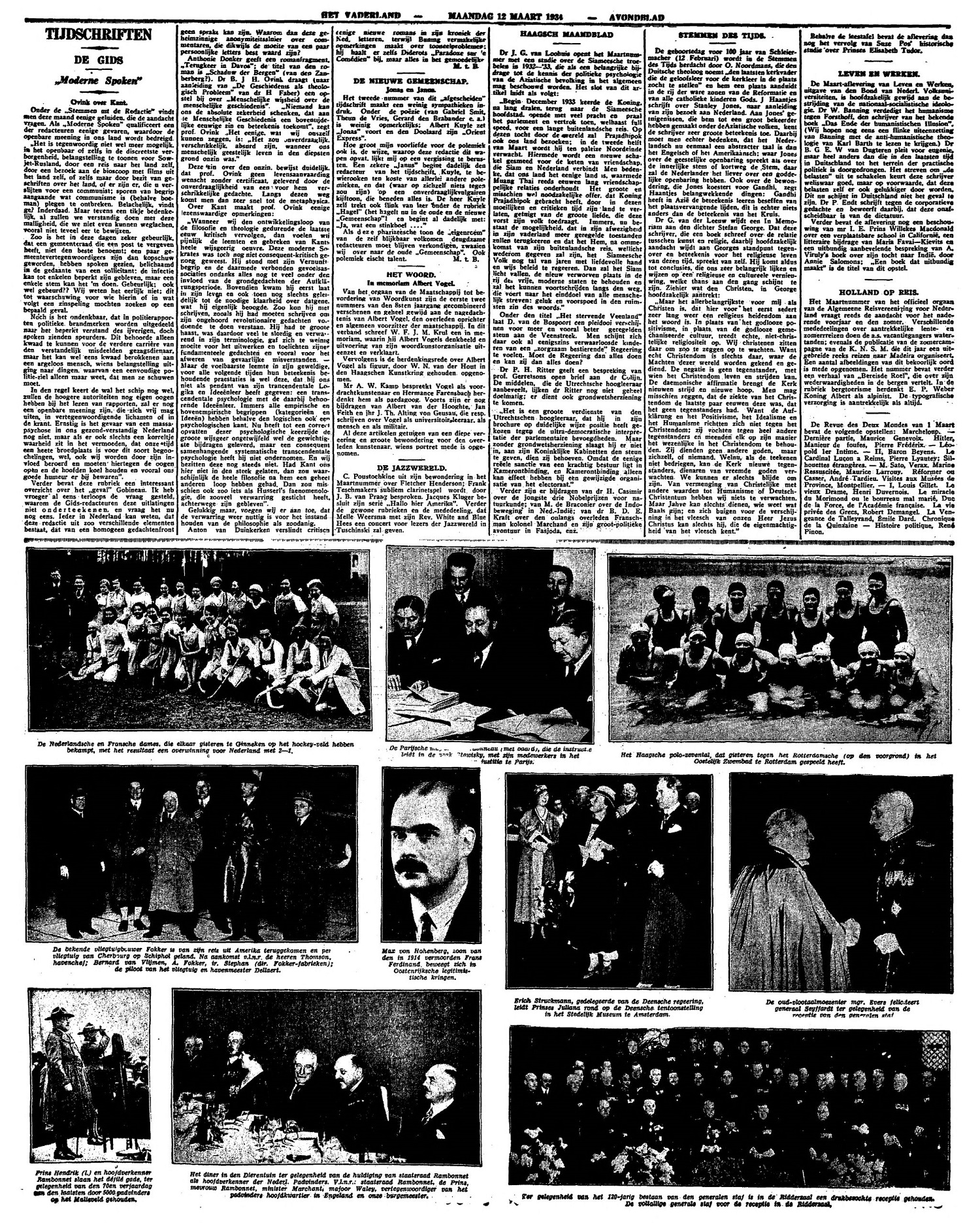 Anthonie Donkers geeft een romanfragment ‘Terugkeer in Davos’; de titel van de roman is ‘Schaduw der Bergen’ (van den Zanberberg?). Dr B. J H. Ovink draagt (naar aanleiding van ‘De Geschieden als theologisch probleem’ van dr H. Faber) een op stel bij over ‘Menschelijke wijsheid over de menschelijke geschiedenis’. ‘Niemand kan ons de absolute zekerheid schenken, dat aan de Menschelijke Geschiedenis een boventijdelijke eeuwige zin en beteekenis toekomt’, zegt prof. Ovink. Het eenige wat wij onszelf kunnen zeggen, is: ‘Het zou onverdraaglijk, verschrikkelijk, absurd zijn, wanneer ons menschelijk geestelijk leven in den diepste grond onzin was.’