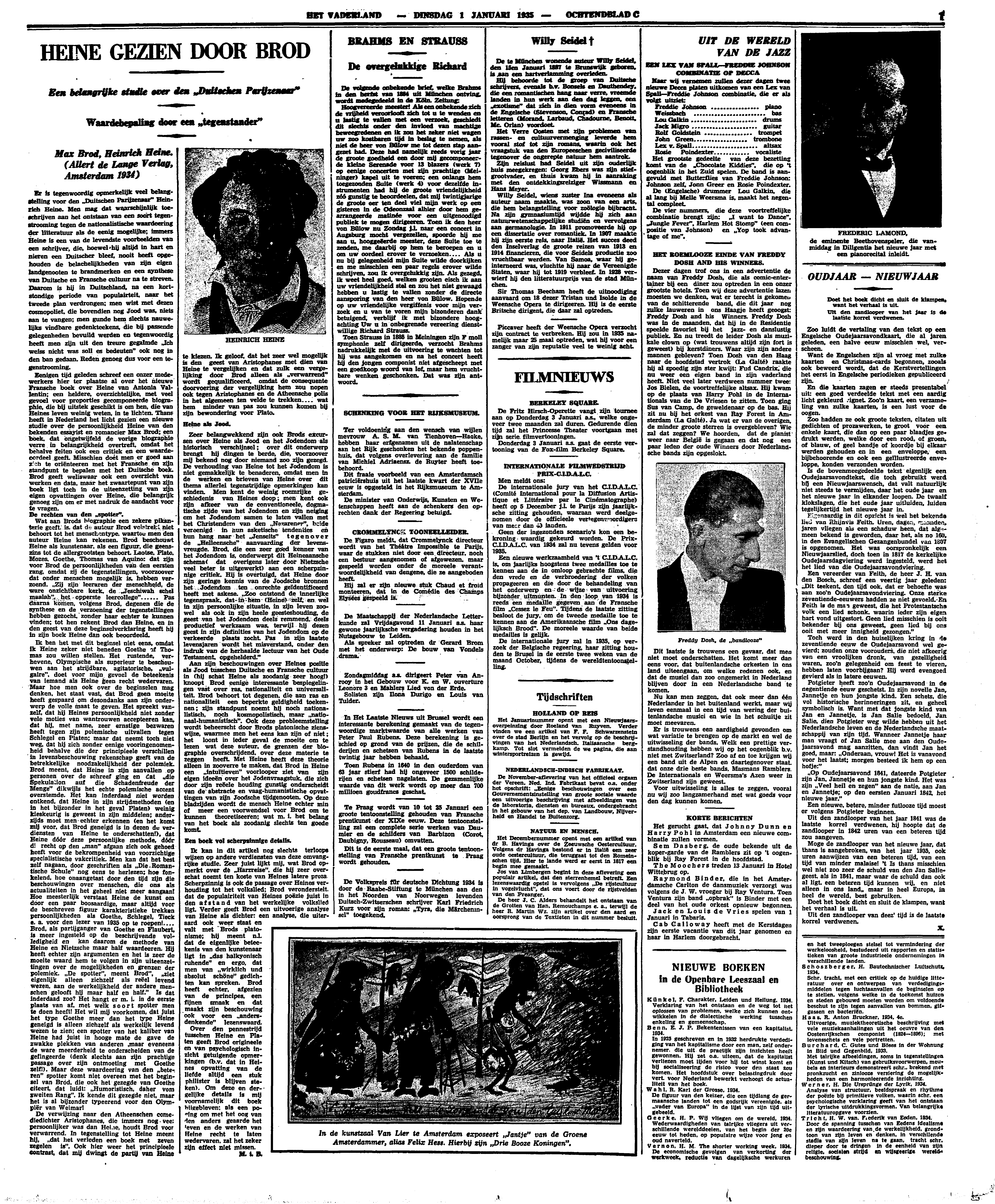 Eenigen tijd geleden schreef een onzer medewerkers hier ter plaatse al over het nieuwe Fransche boek over Heine van Antonia Vallentin; een heldere, overzichtelijke, met veel gevoel voor proporties gecomponeerde biographie, die bij uitstek geschikt is om hen, die van Heines leven weinig weten, in te lichten. Thans heeft in Nederland het licht gezien een nieuwe studie over de persoonlijkheid Heine van den bekenden essayist en romancier Max Brod; een boek, dat ongetwijfeld de vorige biographie verre in belangrijkheid overtreft, omdat het behalve feiten ook een critiek en een waardeoordeel geeft. Misschien doet men er goed aan zich te oriënteeren met het Fransche en zijn standpunt te bepalen met het Duitsche boek. Brod geeft weliswaar ook een overzicht van werken en data, maar het zwaartepunt van zijn boek ligt toch in de uiteenzetting van zijn eigen opvattingen over Heine, die belangrijk genoeg zijn om er met nadruk de aandacht voor te vragen.