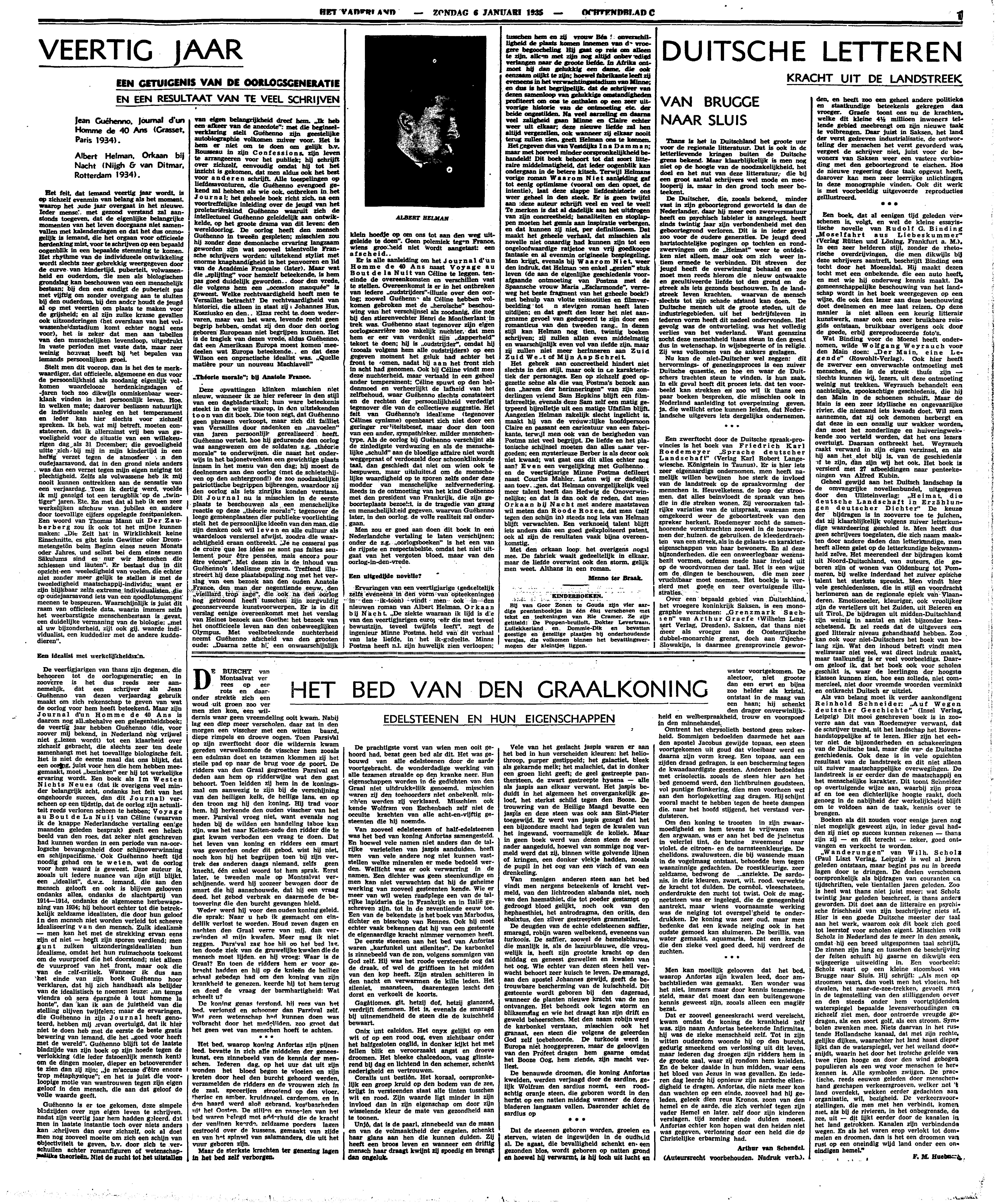 Het gebrek aan concreetheid hindert niet slechts in den stijl, maar ook in de karakteristiek der personages. Een op zichzelf goed opgezette scène als die van Postma's bezoek aan den ‘harem der herinneringen’ van zijn zonderlingen vriend Sam Hopkins blijft een filmtafereeltje, evenals deze Sam zelf een matig getypeerd bijrolletje uit een matige Ufafilm blijft. Aangezien Helman zakelijk slecht ingelicht is, maakt hij van de vrouwelijke hoofdpersoon Claire en passant een caricatuur van een fabrikante, terwijl men ook van de bezigheden van Postma niet veel begrijpt. De liefde en het platonische schijnsel moeten dan alles maar vergoeden; een mysterieuze Berber is als decor ook niet kwaad; wat gaat ons dit alles echter nog aan? Even een vergelijking met Guéhenno en de veertigjarige Minne Postma defileert naast Courths Mahler. Laten wij er dadelijk aan toevoegen, dat Helman onvergelijkelijk veel meer talent heeft dan Hedwig de Onoverwinnelijke; en dat is dan ook de reden, dat men Orkaan bij Nacht met andere maatstaven wil meten dan Roode Rozen, dat men (zelf tegen den schijn in) steeds nog iets van Helman blijft verwachten. Een verknoeid talent blijft iets anders dan een goed geëxploiteerd patent, ook al zijn de resultaten vaak bijna overeenkomstig.