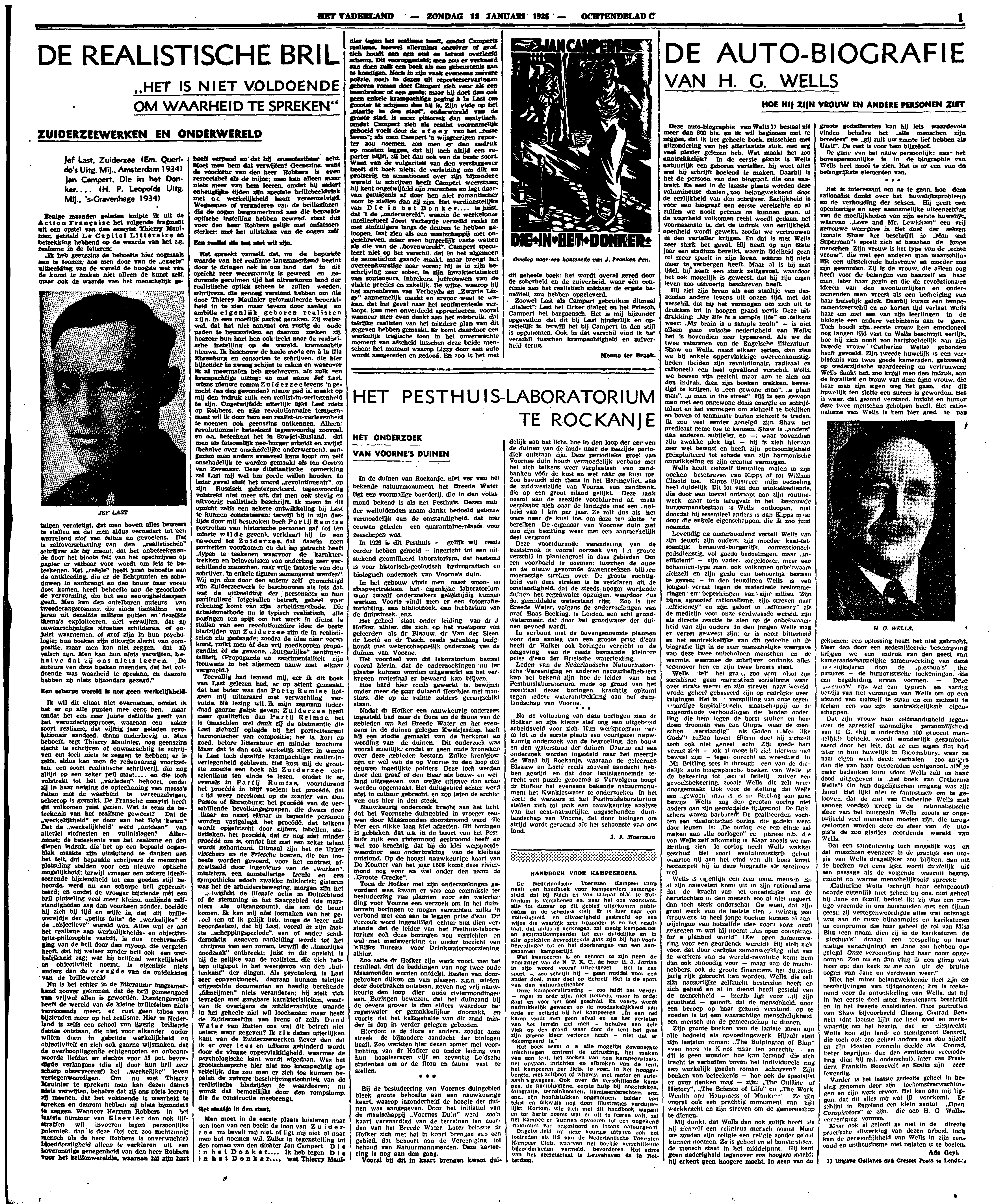 Men moet in de eerste plaats luisteren naar den toon van een boek; de toon van Zuiderzee nu bevalt mij niet of ligt mij niet al naar men het noemen wil. Zulks in tegenstelling tot den roman van den dichter Jan Campert. Die in het Donker.... Ik heb tegen Die in het Donker.... wat Thierry Maulnier tegen het realisme heeft, omdat Camperts realisme, hoewel allerminst onzuiver of grof. zich houdt aan een oud en ietwat overleefd schema. Dit vooropgesteld; men zou er verkeerd aan doen zulk een boek als een gebeurtenis aan te kondigen. Noch in zijn vaak eveneens zuivere poëzie, noch in dezen uit reporterservaringen geboren roman doet Campert zich voor als een baanbreker of een genie; maar hij doet dan ook geen enkele krampachtige poging à la Last om grooter te shijnen dan hij is. Zijn visie op het ‘staatje in den staat’, onderwereld van de groote stad. is meer pittoresk dan analytisch omdat Campert zich als realist voornamelijk geboeid voelt door de sfeer van het ‘rosse leven"’; als men Campert 'n wijsgeerigen reporter zou noemen, zou men er den nadruk op moeten leggen, dat hij toch altijd een reporter blijft, zij het dan ook van de beste soort. Want van de vulgariteit van den verslaggever heeft dit boek niets; de verleiding om dik en protserig en sensationeel over zijn bijzondere wereld te schrijven heeft Campert weerstaan; hij kent ongetwijfeld zijn menschen en legt daarvan getuigenis af door hen niet romantischer voor te stellen dan zij zijn. Het verdienstelijke van Die in het Donker.... is juist, dat 't de ‘onderwereld’, waarin de werkelooze intellectueel Joost Verheyde verzeild raakt na met stofzuigers langs de deuren te hebben geloopen. laat zien als een maatschappij met ongeschreven, maar even burgerlijk vaste wetten als die van de ‘bovenwereld’. Campert speculeert niet op het verschil, dat in het algemeen de sensatielust gaande maakt, maar brengt het overeenkomstige naar voren; hij is in zijn beschrijving zeer sober, in zijn karakteristieken van souteneurs, inbrekers, juffrouwen van de vlakte precies en zakelijk. De wijze, waarop hij het samenleven van Verheyde en ‘Zwarte Lizzy’ aannemelijk maakt en ervoor weet te waken, dat het geval naar het sentimenteele verloopt. kan men onverdeeld apprecieeren. vooral wanneer men even denkt aan het misbruik dat talrijke realisten van het mindere plan van dit gegeven hebben gemaakt. Er komt daardoor een werkelijk tragische toon in het onverwachte moment van afscheid tusschen deze beide menschen: het moment waarop Lizzy door een auto wordt aangereden en gedood. En zoo is het met dit geheele boek: het wordt overal gered door de soberheid en de zuiverheid. waar één concessie aan het realistisch misbaar de ergste banaliteit zou hebben opgeleverd.