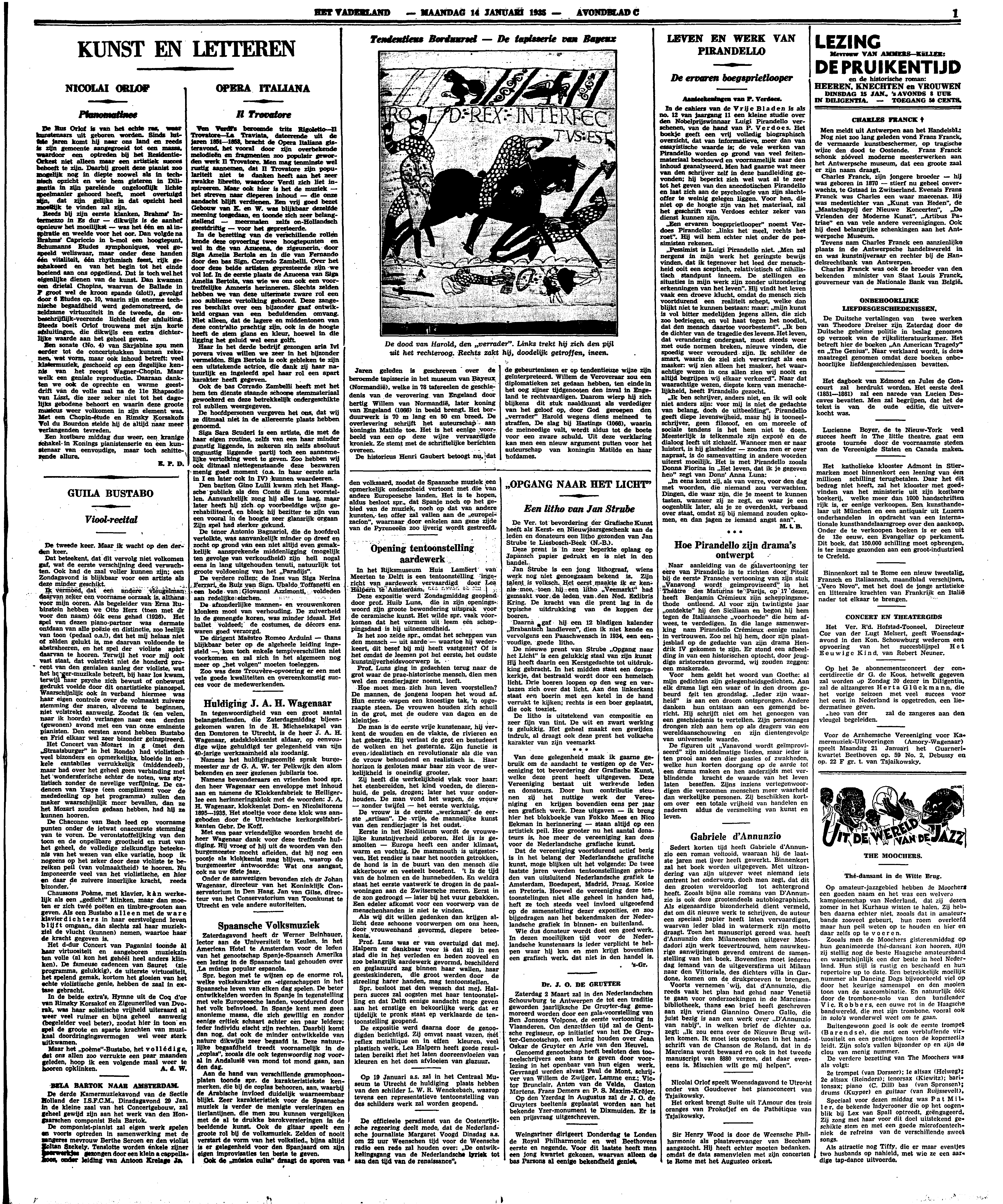 In de cahiers van de Vrije Bladen is als no. 12 van jaargang 11 een kleine studie over den Nobelprijswinnaar Luigi Pirandello verschenen, van de hand van P. Verdoes. Het boekje geeft een vrij volledig biographisch overzicht, dat van informatieve, meer dan van essayistische waarde is; de vele werken van Pirandello worden op grond van veel feitenmateriaal beschouwd en voornamelijk naar den inhoud geanalyseerd. Men had gaarne wat meer van den schrijver zelf in deze handleiding gevonden; hij beperkt zich wel wat al te zeer tot het geven van den anecdotischen Pirandello en laat zich aan de psychologie van zijn slachtoffer te weinig gelegen liggen. Voor hen, die niet op de hoogte zijn van het materiaal, zal het geschrift van Verdoes echter zeker van dienst kunnen zijn.