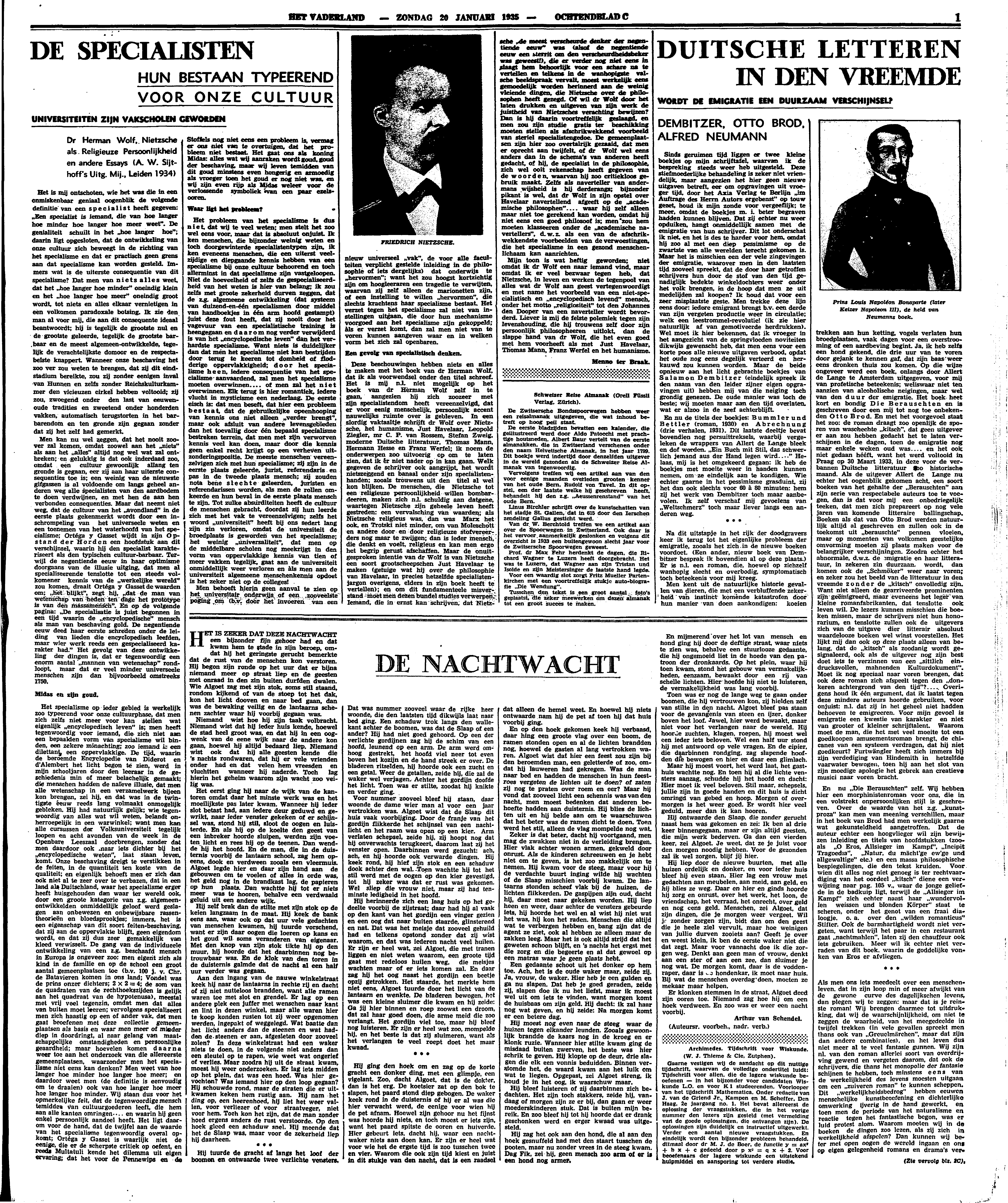 Deze beschouwingen hebben niets en alles te maken met het boek van dr Herman Wolf, dat ik als voorwendsel onder den titel schreef. Het is mij n.l. niet mogelijk op het boek van dr Herman Wolf zelf in te gaan, aangezien hij zich zoozeer met zijn specialistendom heeft vereenzelvigd, dat er voor eenig menschelijk, persoonlijk accent nauwelijks ruimte over is gebleven. In een slordig vaktaaltje schrijft dr Wolf over Nietzsche, het humanisme, Just Havelaar, Leopold Ziegler, mr C.P. van Rossem, Stefan Zweig, moderne Duitsche litteratuur, Thomas Mann, Hermann Hesse en Frans Werfel; ik noem de onderwerpen zoo uitvoerig op om te laten zien, dat ik er niet nader op in kan gaan. Welk gegeven de schrijver ook aangrijpt, het wordt nietszeggend en banaal onder zijn specialistenhanden; zooals trouwens uit den titel al wel kon blijken. De menschen, die Nietzsche tot een religieuze persoonlijkheid willen bombardeeren, maken zich n.l. schuldig aan datgene, waartegen Nietzsche zijn geheele leven heeft gestreden: een vervalsching van waarden; als Nietzsche religieus was, dan was Marx het ook, en Trotski niet minder, om van Moleschott en andere door en door religieuze stofvereerders nog maar te zwijgen; dan is ieder mensch, die denkt en voelt, religieus en kan men ergo het begrip gerust afschaffen. Maar de onuitgesproken intentie van dr Wolf is van Nietzsche een soort grootscheepschen Just Havelaar te maken (getuige wat hij over de philosophie van Havelaar, in precies hetzelfde specialistenjargon overigens, elders in zijn boek heeft te vertellen); en om dit fundamenteele misverstand moet men dezen bundel studies verwerpen. Iemand, die in ernst kan schrijven, dat Nietschze ‘de meest verscheurde denker der negentiende eeuw’ was (alsof de negentiende eeuw een sterrit om den verscheurdheidsbeker was geweest!), die er verder nog niet eens in slaagt hem behoorlijk voor een schare na te vertellen en telkens in de wanhopigste valsche beeldspraak vervalt, moet werkelijk eens gemoedelijk worden herinnerd aan de weinig vleiende dingen, die Nietzsche over de philosophen heeft gezegd. Of wil dr Wolf door het laten drukken en uitgeven van zijn werk de juistheid van Nietschzes verachting bewijzen? Dan is hij daarin voortreffelijk geslaagd en men zou zijn studie gratis ter beschikking moeten stellen als afschrikwekkend voorbeeld van steriel specialistengedoe. De gemeenplaatsen zijn hier zoo overtalrijk gezaaid, dat men er oprecht aan twijfelt, of dr Wolf wel eens anders dan in de schema's van anderen heeft gedacht, of hij, de specialist in de philosophie, zich wel ooit rekenschap heeft gegeven van de woorden, waarvan hij zoo critiekloos gebruik maakt. Zelfs als navertelier van andermans wijsheid is hij derderangs; bijzonder pikant is wel, dat dr Wolf in zijn opstel over Havelaar navertellend afgeeft op de ‘academische philosophen’… waar hij zelf alleen maar niet toe gerekend kan worden, omdat hij niet eens een goed philosoof is; men zou hem moeten klasseeren onder de ‘academische navertellers’, d.w.z. als een van de afschrikwekkendste voorbeelden van de verwoestingen, die het specialisme in een gezond menschenlichaam kan aanrichten.
