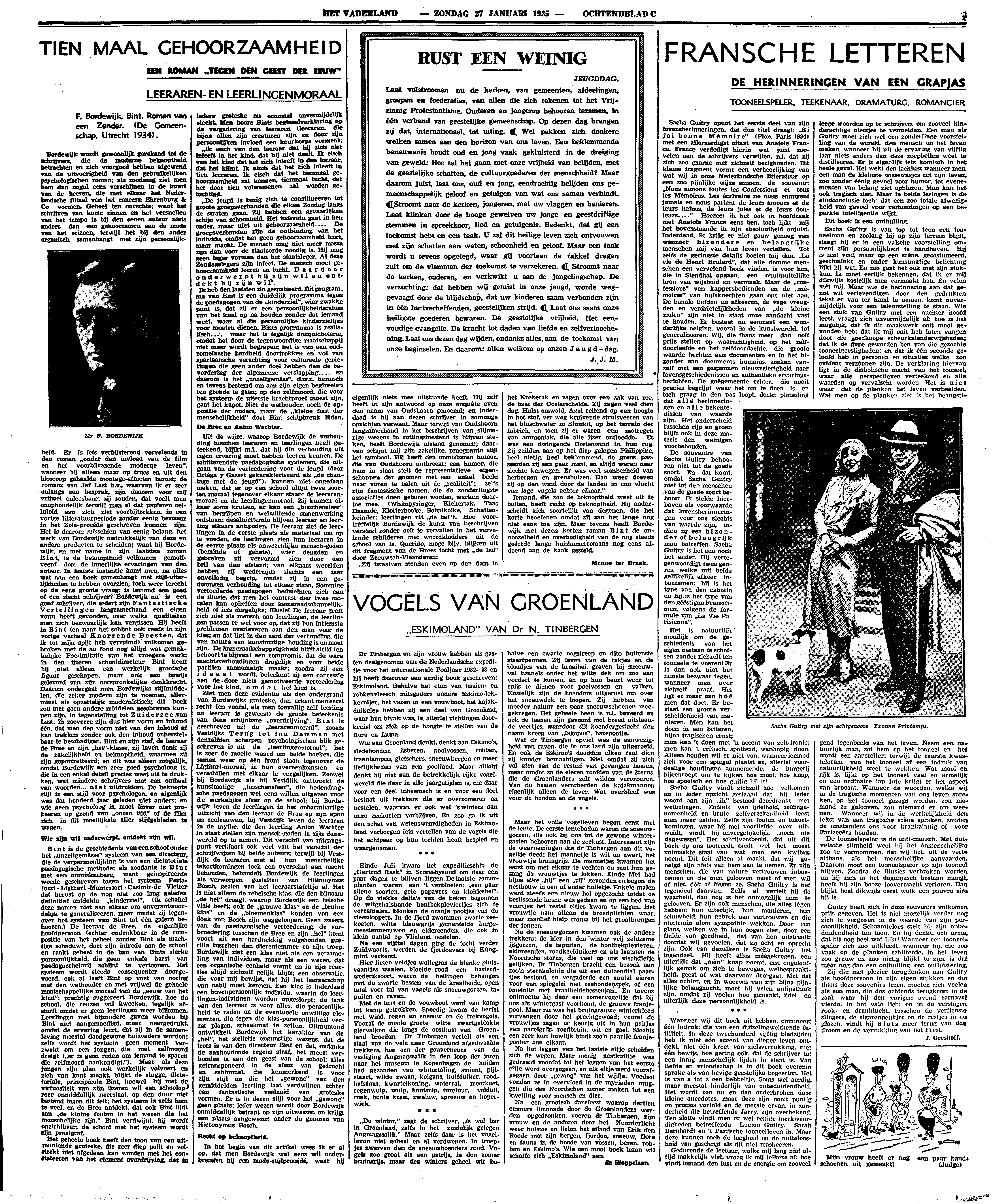 Bordewijk wordt gewoonlijk gerekend tot de schrijvers, die de moderne beknoptheid betrachten en zich voorgoed hebben afgewend van de uitvoerigheid van den gebruikelijken psychologischen roman; als zoodanig ziet men hem dan nogal eens verschijnen in de buurt van de heeren, die met elkaar het Nederlandsche filiaal van het concern Ehrenburg & Co vormen. Geheel ten onrechte; want het schrijven van korte zinnen en het versnellen van het tempo is bij den eenen auteur niets anders dan een gehoorzamen aan de mode van het seizoen, terwijl het bij den ander organisch samenhangt met zijn persoonlijkheid. Er is iets verbijsterend vervelends in den roman ‘onder den invloed van de film en het voorbijrazende moderne leven’, wanneer hij alleen maar op trucs en uit den bioscoop gehaalde montage-effecten berust; de romans van Jef Last b.v., waarvan ik er zeer onlangs een besprak, zijn daarom voor mij vrijwel onleesbaar; zij zouden, dat voelt men onophoudelijk terwijl men al dat papieren celluloïd aan zich ziet voorbijtrekken, in een vorige litteratuurperiode zonder eenig bezwaar in het Zola-procédé geschreven kunnen zijn. Het is daarom misschien van eenig belang, het werk van Bordewijk nadrukkelijk van deze en andere producten te scheiden; want bij Bordewijk, en met name in zijn laatsten roman Bint, is de beknoptheid volkomen gemotiveerd door de innerlijke ervaringen van den auteur. In laatste instantie komt men, na alles wat aan een boek samenhangt met stijl-uiterlijkheden te hebben overzien, toch weer terecht op de eene groote vraag: is iemand een goed of een slecht schrijver? Bordewijk nu is een goed schrijver, die sedert zijn Fantastische Vertellingen langzamerhand een eigen vorm heeft gevonden, over welks qualiteiten men zich bezwaarlijk kan vergissen. Hij heeft in Bint (en naar het schijnt ook reeds in zijn vorige verhaal Knorrende Beesten, dat ik tot mijn spijt heb verzuimd) volkomen gebroken met de au fond nog altijd wat gemakkelijke Poe-imitatie van het vroegere werk; in den ijzeren schooldirecteur Bint heeft hij niet alleen een werkelijk grootsche figuur geschapen, maar ook een bewijs geleverd van zijn oorspronkelijke denkkracht. Daarom ondergaat men Bordewijks stijlmiddelen, die zeker modern zijn te noemen, allerminst als opzettelijk modernistisch; dit boek zou met geen andere middelen geschreven kunnen zijn, in tegenstelling tot Zuiderzee van Last; in zooverre zijn dus hier vorm en inhoud één, dat men den vorm niet van den inhoud af kan trekken zonder ook den inhoud onherstelbaar te beschadigen. Bint en zijn staf, de leeraar de Bree en zijn ‘hel’-klasse, zij leven dank zij de zakelijkheid en beknoptheid, waarmee zij zijn geportretteerd; en dit was alleen mogelijk, omdat Bordewijk een zeer goed psycholoog is, die in een enkel detail precies weet uit te drukken, wat mindere schrijvers met een omhaal van woorden... niet uitdrukken. De beknopte stijl is een stijl voor psychologen, en eigenlijk was dat honderd jaar geleden niet anders; en wie geen psycholoog is, moet liever niet probeeren op grond van ‘onzen tijd’ of de film zich in dit moeilijkste aller stijlgebieden te wagen.