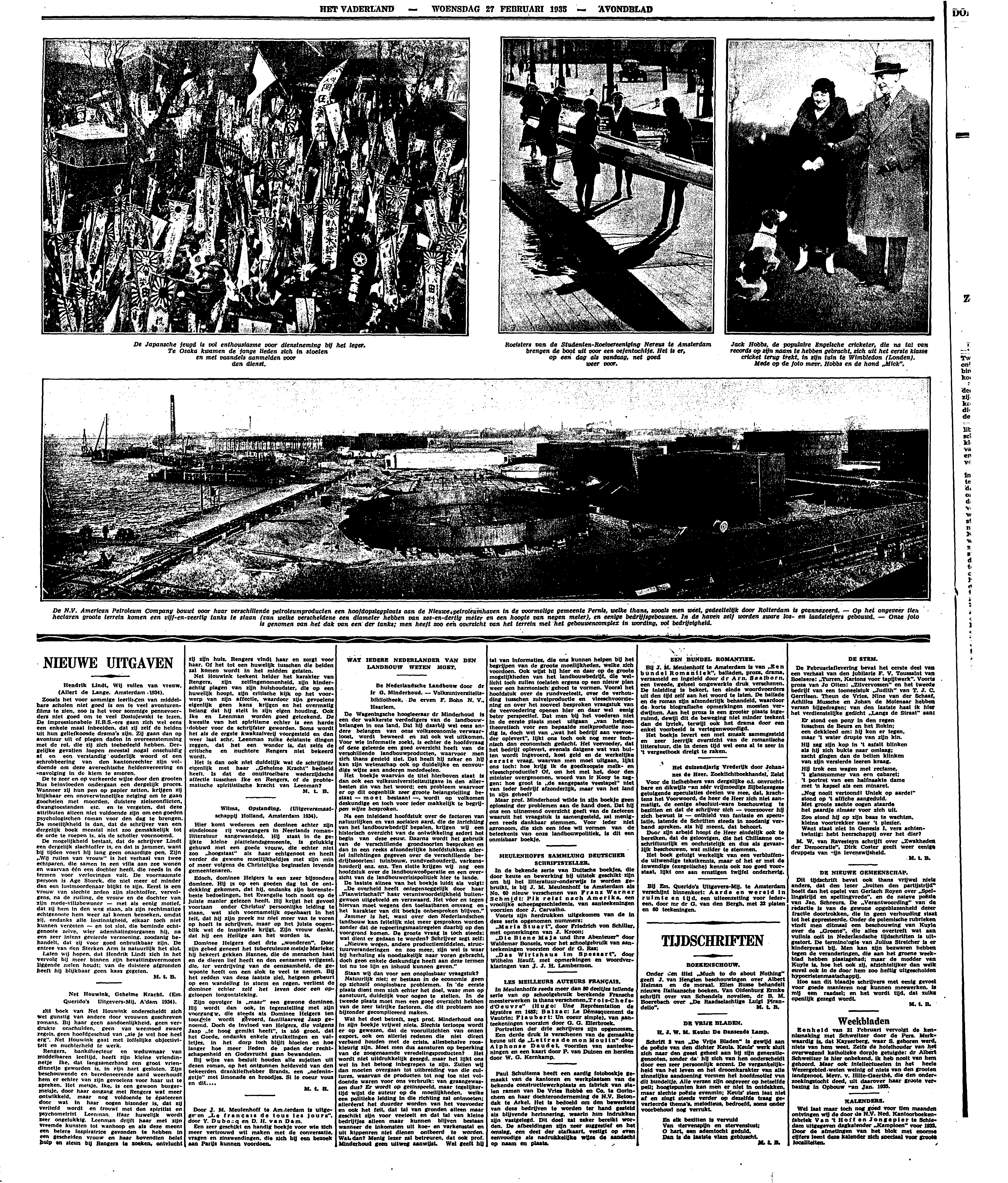 De mogelijkheid bestaat, dat de schrijver Lindt een dergelijk slachtoffer is, en dat is jammer, want bij tijden voert hij lang geen onaardige pen. Zijn ‘Wij ruilen van vrouw’ is het verhaal van twee echtparen, die samen in een villa aan zee wonen en waarvan één een dochter heeft, die reeds in de termen voor verlovingen valt. De voornaamste persoon is Age Storck, die niet meer of minder dan een lustmoordenaar blijkt te zijn. Eerst is een vrouw van slechte zeden zijn slachtoffer, vervolgens, na de ruiling, de vrouw en de dochter van zijn mede-villabewoner - met als eenig motief, dat zij hem in den weg staan, als zijn rechtmatige echtgenoote hem weer zal komen bezoeken, omdat zij, ondanks alle loszinnigheid, elkaar toch niet kunnen vergeten - en tot slot, die beminde echtgenoote zelve, wier ademhalingsorganen hij, na een zeer intens gevierde verzoening, zoodanig behandelt, dat zij voor goed onbruikbaar zijn. De entree van den Sterken Arm is natuurlijk het slot.