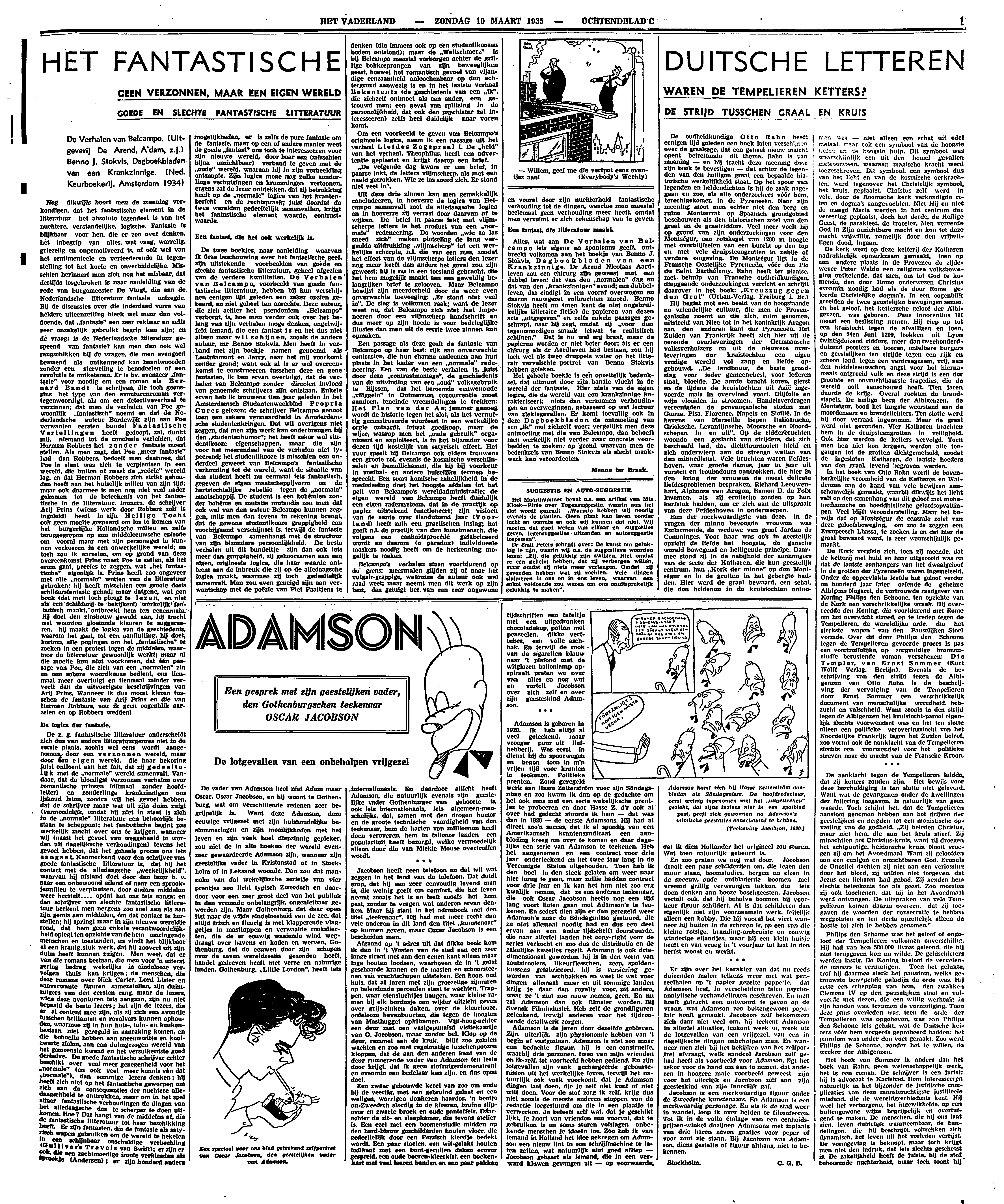 De z.g. fantastische litteratuur onderscheidt zich dus van andere litteratuurgenres niet in de eerste plaats, zooals wel eens wordt aangenomen, door een verzonnen wereld, maar door een eigen wereld, die haar bekoring juist ontleent aan het feit, dat zij gedeeltelijk met de ‘normale’ wereld samenvalt. Vandaar, dat de bloedigst verzonnen verhalen over romantische prinsen (ditmaal zonder hoofdletter) en zonderlinge krankzinnigen ons ijskoud laten, zoodra wij het gevoel hebben, dat de schrijver maar wat uit zijn duim zuigt (vermoedelijk, omdat hij niet in staat is zich in de ‘normale’ litteratuur een behoorlijk bestaan te scheppen); het fantastische begint pas werkelijk macht over ons te krijgen, wanneer wij (naast het gevoel van weggehaald te worden uit dagelijksche verhoudingen) tevens het gevoel hebben, dat het geheele proces ons iets aangaat. Kenmerkend voor den schrijver van goede fantastische litteratuur is, dat hij het contact met de alledaagsche ‘werkelijkheid’, waarvan hij afstand doet door den lezer b.v. naar een onbewoond eiland of naar een sprookjesmilieu te verplaatsen, door andere middelen weer herstelt.... opdat het ons iets aanga; en den schrijver van slechte fantastische litteratuur herkent men nergens zoo snel aan als aan zijn gemis aan middelen, óm dat contact te herstellen; hij springt maar in zijn nieuwe wereldje rond, dat hem geen enkele verantwoordelijkheid oplegt ten opzichte van de hem omringende menschen en toestanden, en vindt het blijkbaar al een kranig stuk werk, dat hij zooveel uit zijn duim heeft kunnen zuigen. Men weet, dat er van die romans bestaan, die men voor 'n uiterst gering bedrag wekelijks in eindelooze vervolgen thuis kan krijgen; de menschen, die deze romans over Nick Carter, Lord Lister en aanverwante figuren samenstellen, zijn duimzuigers van den eersten rang, maar de lezers, wien deze avonturen iets aangaan, zijn nu niet bepaald de beste lezers; het zijn de lezers, die er al content mee zijn, als zij zich een avondje tusschen brillanten en revolvers kunnen ophouden, waarmee zij in hun huis-, tuin- en keukenbestaan niet geregeld in aanraking komen, en die behoefte hebben aan sneeuwwitte en koolzwarte zielen, aan een duimgezogen wereld van het gemeenste kwaad en het versuikerdste goed derhalve. De goede fantastische schrijver echter beschikt over veel meer genegenheid voor het ‘normale’ (en ook veel meer kennis vàn dat ‘normale’), dan sommige lezers denken; hij heeft zich niet op het fantastische geworpen om zich aan de consequenties der nuchtere alledaagschheid te onttrekken, maar om in het spel zijner fantastische verhoudingen de dingen van het alledaagsche des te scherper te doen uitkomen. Hoe? Dat hangt van de middelen af, die de fantastische litteratuur tot haar beschikking heeft. Er zijn fantasten, die de fantasie als satyrisch wapen gebruiken om de wereld te hekelen in een schijnbaar onschuldige verbeelding (Gulliver's Travels van Swift); er zijn er ook, die een zachtmoedige ironie verkleeden als sprookje (Andersen); er zijn honderd andere mogelijkheden, er is zelfs de pure fantasie om de fantasie, maar op een of andere manier weet de goede ‘fantast’ ons toch te interesseeren voor zijn nieuwe wereld, door haar een (misschien bijna onzichtbaar) verband te geven met de ‘oude’ wereld, waaraan hij in zijn verbeelding ontsnapte. Zijn logica moge nog zulke zonderlinge verbuigingen en krommingen vertoonen, ergens zal de lezer ontdekken, dat zij betrekking heeft op de ‘normale’ logica van het krantenbericht en de rechtspraak; juist doordat de twee werelden gedeeltelijk samenvallen, krijgt het fantastische element waarde, contrastwaarde.