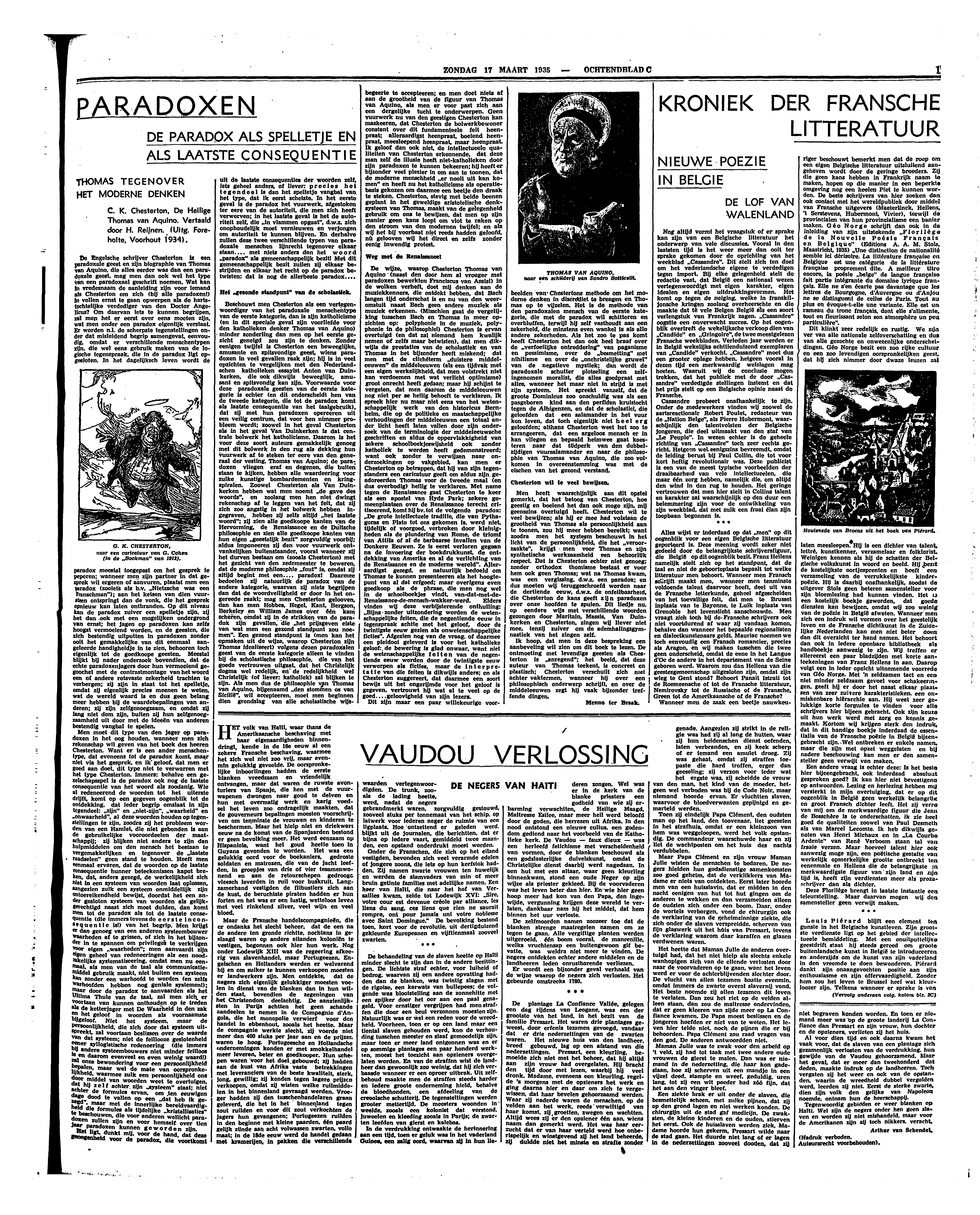 De Engelsche schrijver Chesterton is een paradoxale geest en zijn biographie van Thomas van Aquino, die alles eerder was dan een paradoxale geest, mag men dan ook wel het type van een paradoxaal geschrift noemen. Wat kan in vredesnaam de aanleiding zijn voor iemand als Chesterton om zich (bij alle paradoxen!) in vollen ernst te gaan opwerpen als de hartstochtelijke verdediger van den Doctor Angelicus? Om daarvan iets te kunnen begrijpen, zal men het er eerst over eens moeten zijn, wat men onder een paradox eigenlijk verstaat. Er worden n.l. de scherpste tegenstellingen onder dat misleidend begrip samengevat, eenvoudig, omdat er verschillende menschentypen zijn, die wel eens gebruik maken van de logische tegenspraak, die in de paradox ligt opgesloten. In het dagelijksch leven wordt de paradox meestal toegepast om het gesprek te peperen; wanneer men zijn partner in dat gesprek wil ergeren of aanvuren, plaatst men een paradox (zooiets als b.v. ‘Nietzsche was een Franschman’); aan het ketsen van dien vuursteen ontspringt dan de vonk, die het gesprek opnieuw kan laten ontbranden. Op dit niveau kan de paradox zuiver een spelletje zijn, zij het dan ook met een mogelijken ondergrond van ernst; het jagen op paradoxen kan zelfs hoogst vermoeiend worden, en de geesten, die zich bestendig uitputten in paradoxen zonder ooit het gemakkelijke van dit eenmaal aangeleerde handigheidje in te zien, behooren toch eigenlijk tot de goedkoope geesten. Meestal blijkt bij nader onderzoek bovendien, dat de echte paradoxenjagers door hun vermoeiend gegoochel met de contrastmontage van het woord een of andere rotsvaste zekerheid trachten te verbergen; zij zijn in staat tot het spelletje, omdat zij eigenlijk precies meenen te weten, wat de wereld waard is en dus geen belang meer hebben bij de waardebepalingen van anderen; zij zijn zelfgenoegzaam, en omdat zij lang niet dom zijn, buiten zij hun zelfgenoegzaamheid uit door met de ideeën van anderen bestendig vangbal te spelen.