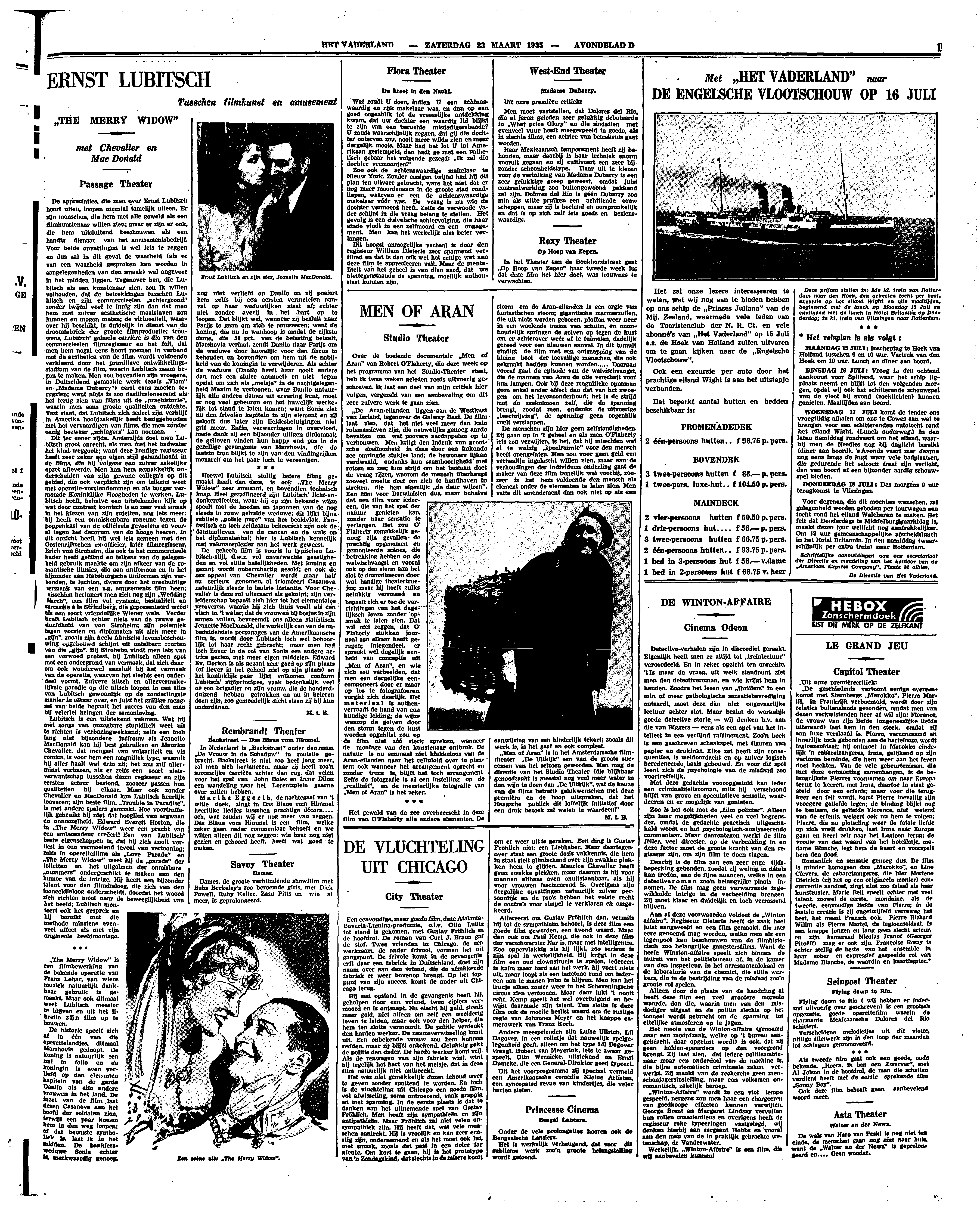 Lubitsch is een uitstekend vakman. Wat hij met songs van onzegbare stupiditeit weet uit te richten is verbazingwekkend; zelfs een toch lang niet bijzondere juffrouw als Jeanette MacDonald kan hij best gebruiken en Maurice Chevalier, dat mengsel van vulgariteit en vis comica, is voor hem een magnifiek type, waaruit hij alles haalt wat erin zit; het zou mij allerminst verbazen, als er zelfs een soort zielsverwantschap tusschen dezen regisseur en zijn eersten acteur bestond, zoozeer passen hun qualiteiten bij elkaar. Maar ook zonder Chevalier en MacDonald kan Lubitsch heerlijk tooveren; zijn beste film, ‘Trouble in Paradise’, is met andere spelers gemaakt. Hoe voortreffelijk gebruikt hij niet dat hooglied van argwaan en onnoozelheid, Edward Everett Horton, die in ‘The Merry Widow’ weer een pracht van een ambassadeur creëert! Een van Lubitsch' beste eigenschappen is, dat hij zich nooit verliest in een vermoeiend teveel van vertooning; zelfs in operettefilms als ‘Love Parade’ en ‘The Merry Widow’ weet hij de ‘parade’ der toiletten en het uitgalmen der onmisbare ‘nummers’ ondergeschikt te maken aan den humor van de intrige. Hij heeft een bijzonder talent voor den filmdialoog, die zich van den tooneeldialoog onderscheidt, doordat het woord zich richten moet naar de beweeglijkheid van het beeld; Lubitsch monteert ook het gesprek en hij bereikt met die methode minstens evenveel effect als met zijn origineele beeldmontage.