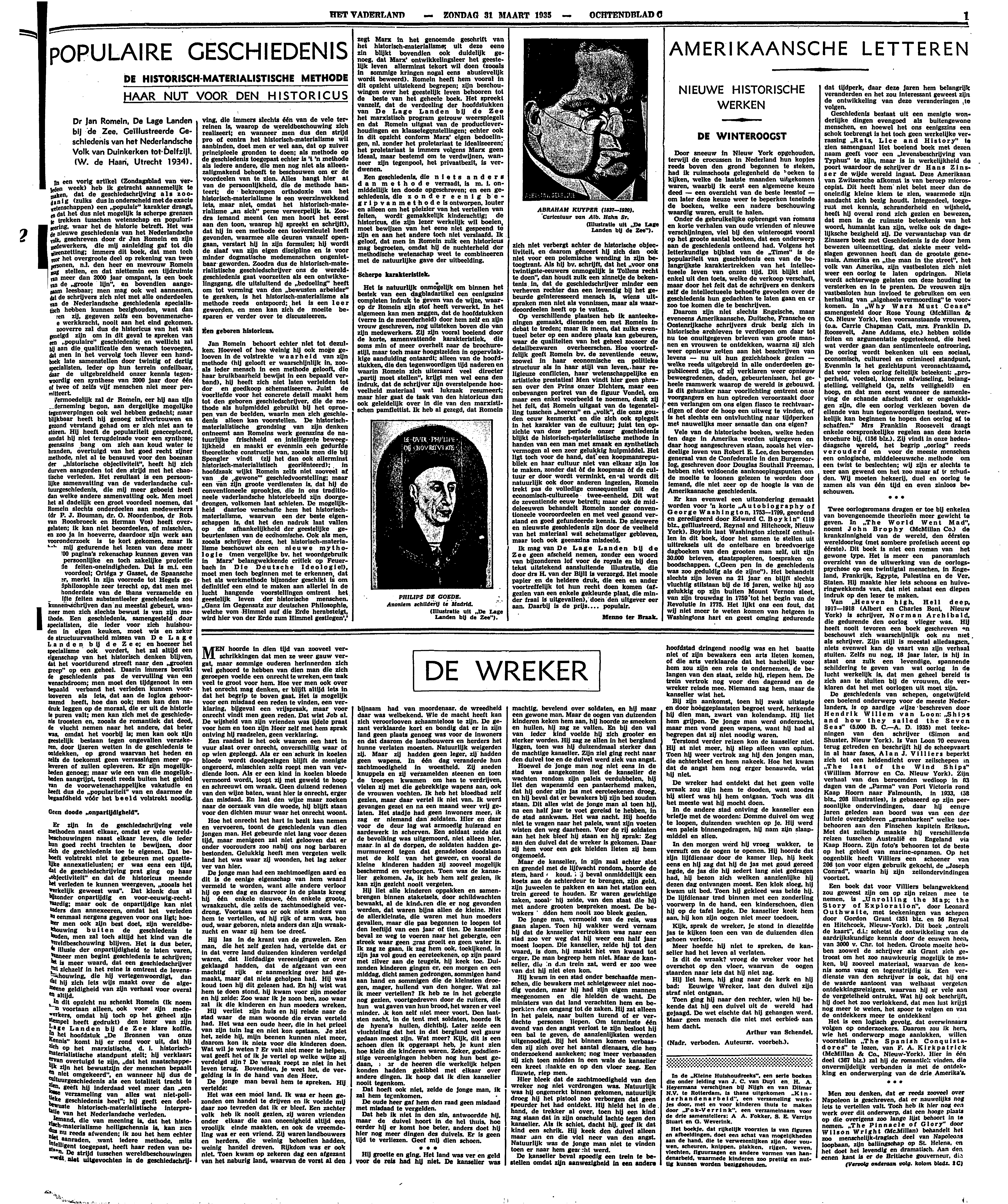 In een vorig artikel (Zondagsblad van verleden week) heb ik getracht aannemelijk te maken, dat de geschiedschrijving als zoodanig (zulks dus in onderscheid met de exacte wetenschappen) een ‘populair’ karakter draagt, en dat het dus niet mogelijk is scherpe grenzen te trekken tusschen wetenschap en populariseering, waar het de historie betreft. Het was de nieuwe geschiedenis van het Nederlandsche volk, geschreven door dr Jan Romein en zijn medewerkers, die mij aanleiding gaf tot die uiteenzetting; immers dit boek, dat men toch voor het overgroote deel op rekening van twee personen, n.l. den heer en mevrouw Romein mag stellen, en dat niettemin een tijdruimte van meer dan 2000 jaar omspant, is een boek van de ‘groote lijn’, en bovendien aangenaam leesbaar; men mag ook wel aannemen, dat de schrijvers zich niet met alle onderdeelen van de Nederlandsche geschiedenis specialistisch hebben kunnen bezighouden, want dan [war]en zij, gegeven zelfs een bovenmenschelijke werkkracht, nooit aan het eind gekomen. In zooverre zal dus de historicus van het vak geneigd zijn om in dit geval te spreken van een ‘populaire’ geschiedenis; en wellicht zal hij aan die qualificatie den wensch toevoegen, dat men in het vervolg toch liever een handboek late samenstellen door twintig of dertig specialisten, ieder op hun terrein onfeilbaar, daar de uitgebreidheid onzer kennis tegenwoordig een synthese van 2000 jaar door één of twee of zelfs vijf menschen niet meer permitteert.