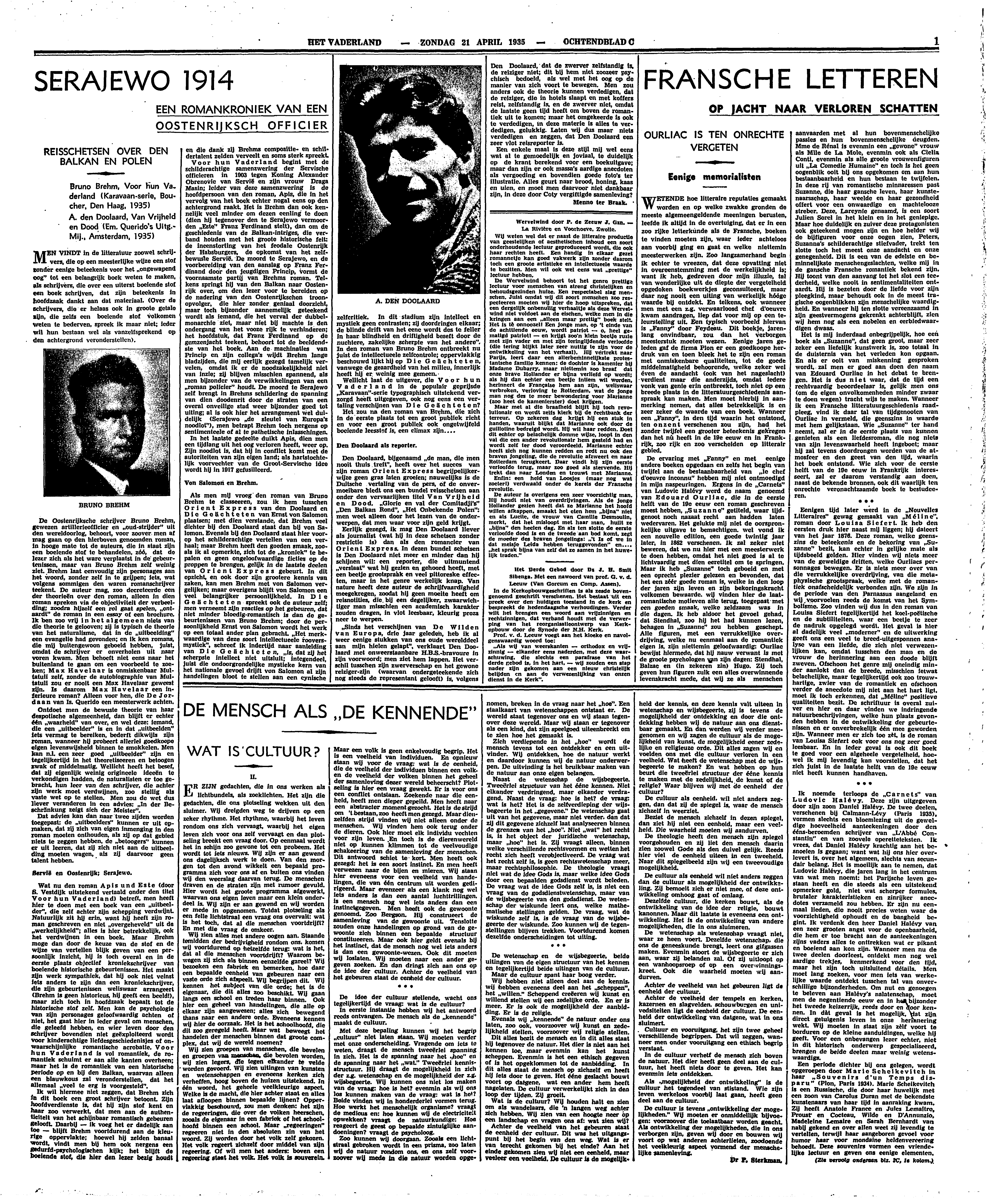 Voor hun Vaderland begint met de schilderachtige samenzwering der Servische officieren in 1903 tegen Koning Alexander Obrenovic van Servië en zijn vrouw Draga Masin; leider van deze samenzwering is de hoofdpersoon van den roman, Apis, die in het vervolg van het boek echter nogal eens op den achtergrond raakt. Het is Brehm dan ook kennelijk veel minder om dezen eenling te doen (dien hij tegenover den te Serajewo vermoorden ‘Este’ Franz Ferdinand stelt), dan om de geschiedenis van de Balkan-intriges, die verband houden met het groote historische feit: de ineenstorting van het feodale Oostenrijk der Habsburgers, de opkomst van het zelfbewuste Servië. De moord te Serajewo, en de voorbereiding van den aanslag op Franz Ferdinand door den jeugdigen Princip, vormt de voornaamste partij van Brehms roman. Telkens springt hij van den Balkan naar Oostenrijk over, om den lezer voor te bereiden op de nadering van den Oostenrijkschen troonopvolger, die hier zonder geniaal doorzicht, maar toch bijzonder aannemelijk geteekend wordt als iemand, die het verval der dubbelmonarchie ziet, maar niet bij machte is den ondergang van het vooze rijk te verhinderen; het hoofdstuk, dat Franz Ferdinand op de gemzenjacht teekent, behoort tot de beeldendste van het boek. Aan de machinaties van Princip en zijn collega's wijdt Brehm lange bladzijden, die mij eerlijk gezegd tamelijk vervelen, omdat ik er de noodzakelijkheid niet van inzie; zij blijven misschien spannend, als men bijzonder van de verwikkelingen van een ‘roman policier’ houdt. De moord te Serajewo zelf brengt in Brehms schildering de spanning van dien doodenrit door de straten van een overal onveilige stad weer bijzonder goed tot uiting; al is ook hier het arrangement wel duidelijk (Serajewo ‘de sleutel van Europa's noodlot’), men betrapt Brehm toch nergens op sentimenteele of al te pathetische inlasschingen.