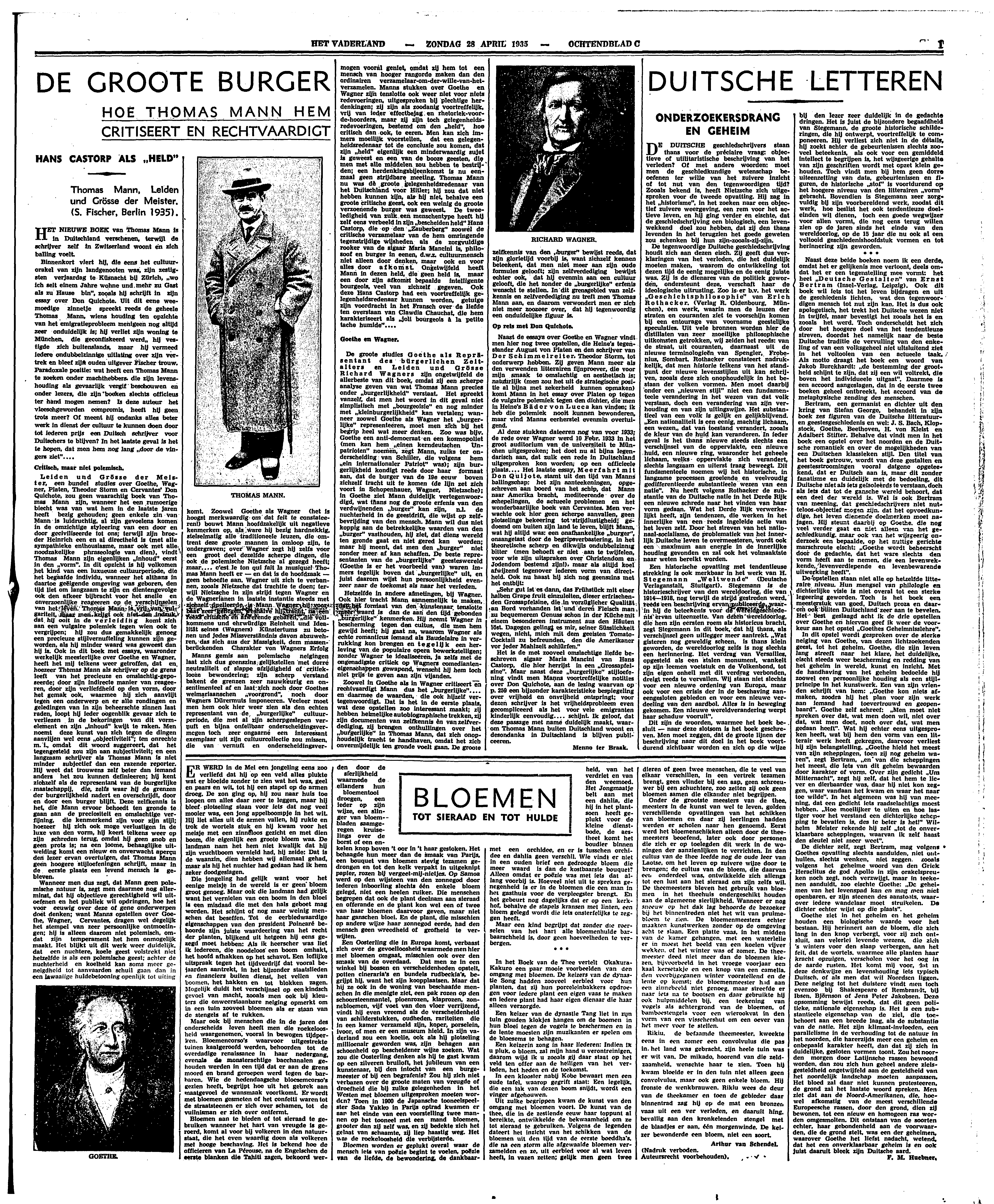 De groote studies Goethe als Repräsentant des bürgerlichen Zeitalters en Leiden und Grösse Richard Wagners zijn ongetwijfeld de allerbeste van dit boek, omdat zij een scherpe analyse geven van wat Thomas Mann precies onder ‘burgerlijkheid’ verstaat. Het spreekt vanzelf, dat men het woord in dit geval niet simplistisch met ‘bourgeoisie’ en nog minder met ‘kleinburgerlijkheid’ kan vertalen; wanneer zoowel Goethe als Wagner het ‘burgerlijke’ representeeren, moet men zich bij het begrip heel wat meer denken. Zoo was bijv. Goethe een anti-democraat en een kosmopoliet (men kan hem ‘einen kerndeutschen Unpatrioten’ noemen, zegt Mann, zulks ter onderscheiding van Schiller, die volgens hem ‘ein internationaler Patriot’ was); zijn burgerlijkheid kondigt reeds door haar formaat aan, dat de burger van de 19e eeuw boven zichzelf tracht uit te komen (de lijn zet zich voort in Schopenhauer, Wagner, Nietzsche); in Goethe ziet Mann duidelijk vertegenwoordigd, wat thans nog de groote erfenis van den verdwijnenden ‘burger’ kan zijn, n.l. de nuchterheid in de geestdrift, die wijst op zelfbevrijding van den mensch. Mann wil dus niet koppig aan de betrekkelijke waarden van den ‘burger’ vasthouden, hij ziet, dat diens wereld ten gronde gaat en niet gered kan worden; maar hij meent, dat men den ‘burger’ niet zonder meer af kan schaffen. De beste representanten van de ‘burgerlijke’ geesteswereld (Goethe is er het voorbeeld van) waren immers tegelijk boven dat ‘burgerlijke’ uit, en juist daarom wijst hun persoonlijkheid evenzeer naar de toekomst als naar het verleden.