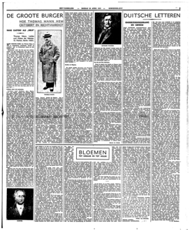 Binnenkort viert hij, die eens het cultuurorakel van zijn landgenooten was, zijn zestigsten verjaardag te Küsnacht bij Zürich, ‘wo ich seit einem Jahre wohne und mehr zu Gast als zu Hause bin’, zooals hij schrijft in zijn essay over Don Quichote. Uit dit eene weemoedige zinnetje spreekt reeds de geheele Thomas Mann, wiens houding ten opzichte van het emigratieprobleem menigeen nog altijd zeer onduidelijk is; hij verliet zijn woning te München, die geconfiskeerd werd’ hij vestigde zich buitenslands, maar hij vermeed iedere ondubbelzinnige uitlating over zijn vertrek en bleef zijn ouden uitgever Fischer trouw. Paradoxale positie: wat heeft een Thomas Mann te zoeken onder machthebbers die zijn levenshouding als gevaarlijk vergif beschouwen en onder lezers, die zijn boeken slechts officieus ter hand mogen nemen? Is deze auteur het vleeschgeworden compromis, heeft hij geen trots meer? Of meent hij ondanks alles beter werk in dienst der cultuur te kunnen doen door tot iederen prijs een Duitsch schrijver voor Duitschers te blijven? In het laatste geval is het te hopen, dat men hem nog lang ‘door de vingers ziet’....