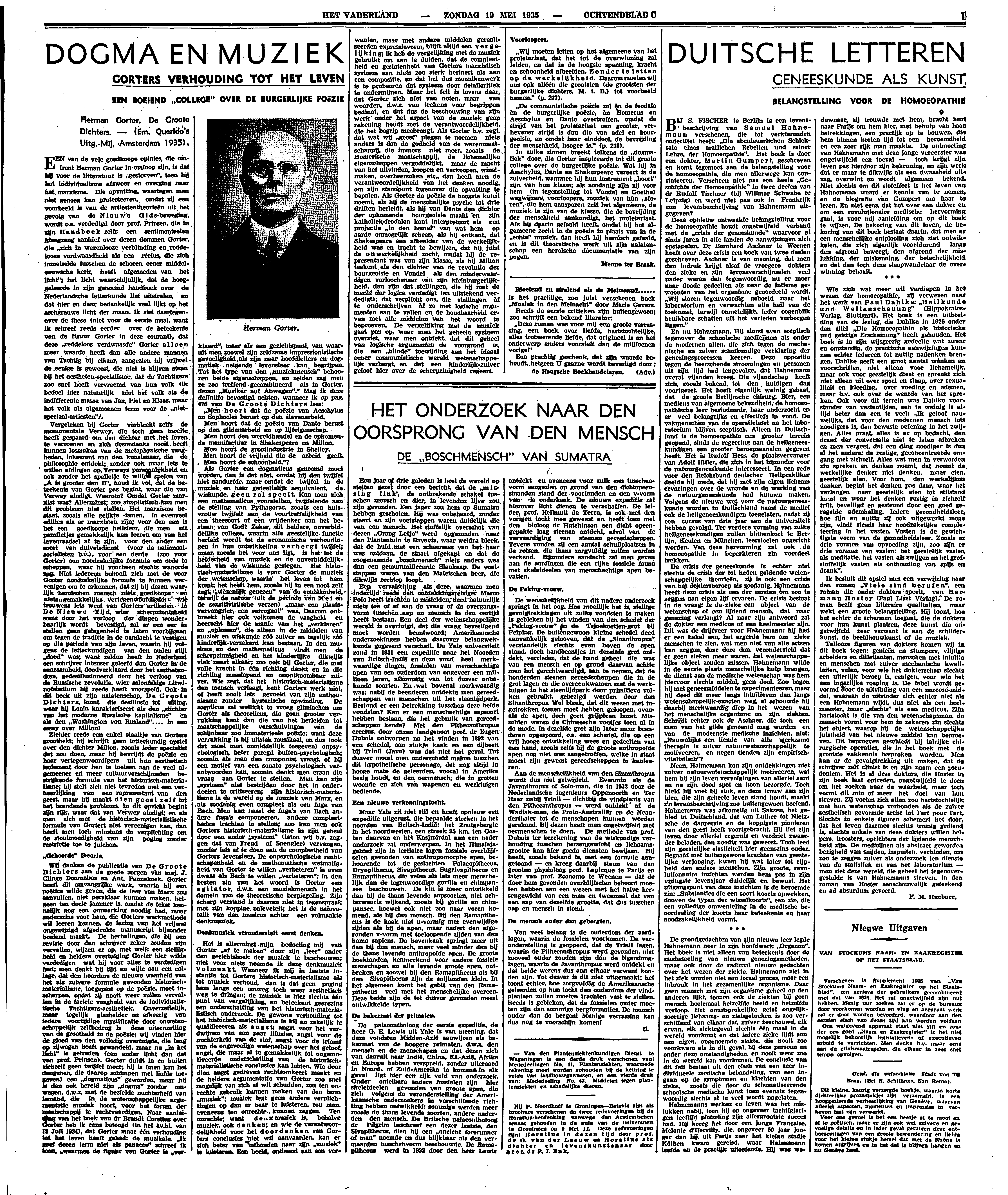 EEN van de vele goedkoope opinies, die omtrent Herman Gorter in omloop zijn, is dat hij voor de litteratuur is ‘gestorven’, toen hij het individualisme afzwoer en overging naar het marxisme. Die opvatting, waartegen men niet genoeg kan protesteeren, omdat zij een voorbeeld is van de artiestentheorieën uit het gevolg van de Nieuwe Gids-beweging, wordt o.a. verdedigd door prof. Prinsen, die in zijn Handboek zelfs een sentimenteelen klaagzang aanhief over dezen dommen Gorter, die ‘zich in wezenlooze verblinding en reddelooze verdwaasdheid als een réclus, die zich inmetselde tusschen de schoren eener middeleeuwsche kerk, heeft afgesneden van het licht’; het licht waarschijnlijk, dat de hooggeleerde in zijn genoemd handboek over de Nederlandsche letterkunde liet uitstralen, en dat hier en daar bedenkelijk veel lijkt op het aschgrauwe licht der maan. Ik stel daartegenover de these (niet voor de eerste maal, want ik schreef reeds eerder over de beteekenis van de figuur Gorter in deze courant), dat deze ‘reddeloos verdwaasde’ Gorter alleen meer waarde heeft dan alle andere mannen van Tachtig bij elkaar, aangezien hij vrijwel de eenige is geweest, die niet is blijven staan bij het aestheten-specialisme, dat de Tachtigers zoo snel heeft vervreemd van hun volk (ik bedoel hier natuurlijk niet het volk als de indifferente massa van Jan, Piet en Klaas, maar het volk als algemeenen term voor de ‘niet-speciaal-artiesten’/.
