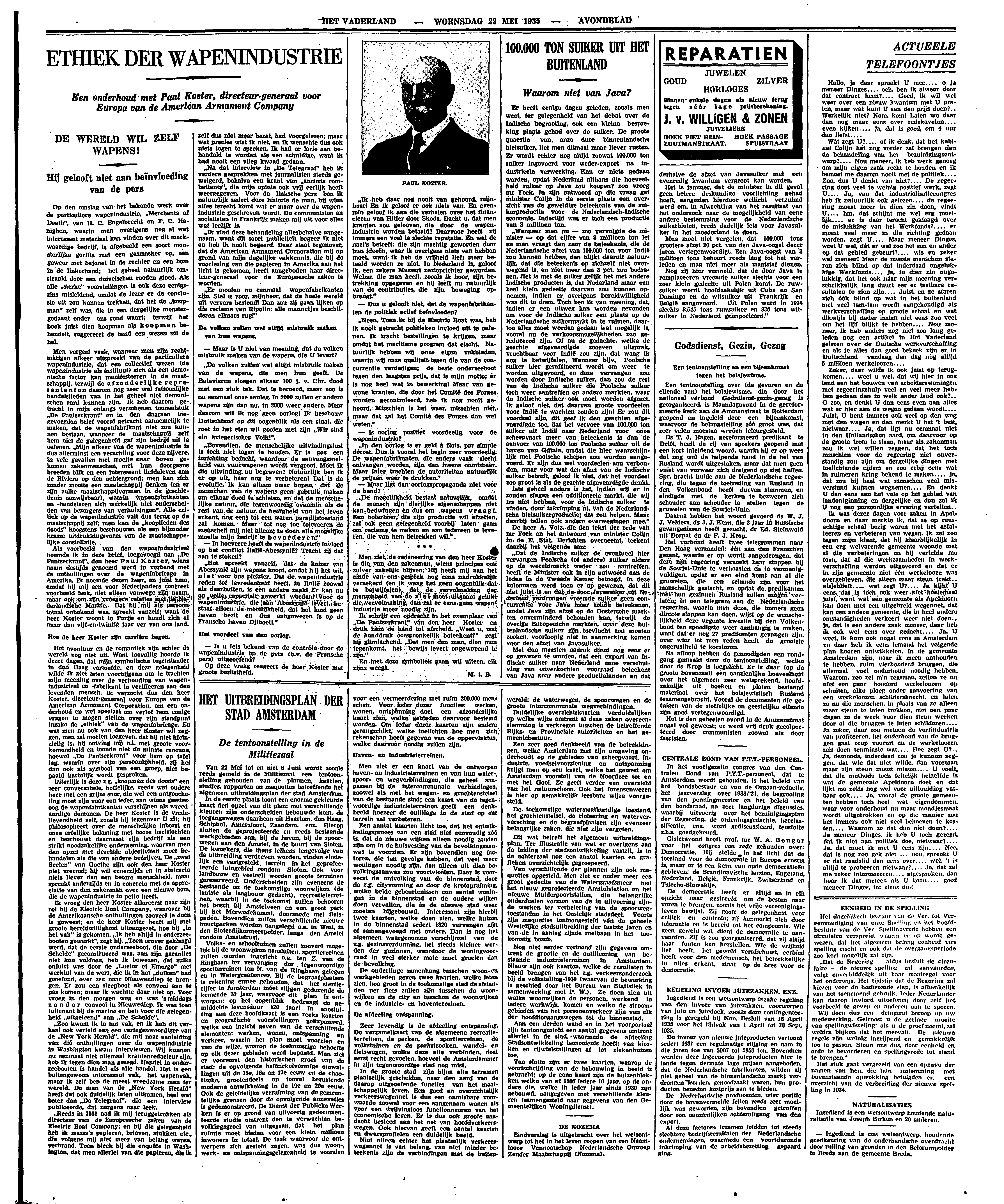 Uiterlijk is deze z.g. ‘koopman des doods’ een zeer conversabele, hoffelijke, reeds wat oudere heer met een grijze snor, die wel een ontgoocheling moet zijn voor een ieder, aan wiens geestesoog de wapenfabrikanten verschijnen als wreed aardige demonen. De heer Koster is de vredelievendheid zelf, zooals hij tegenover U zit; hij philosopheert over de menschelijke inborst en onze erfelijke belasting met booze hartstochten en beschouwt daarnaast zijn bedrijf als een strikt noodzakelijke onderneming, waarvan men den opzet met dezelfde objectiviteit moet behandelen als die van andere bedrijven. De ‘zwei Seelen’ van Goethe zijn ook den heer Koster niet vreemd; hij wil eenerzijds en in abstracto niets liever dan een betere menschheid, maar spreekt anderzijds en in concreto met de appreciatie van den zakenman over een nieuwe bom, die de wapenindustrie in petto heeft.
