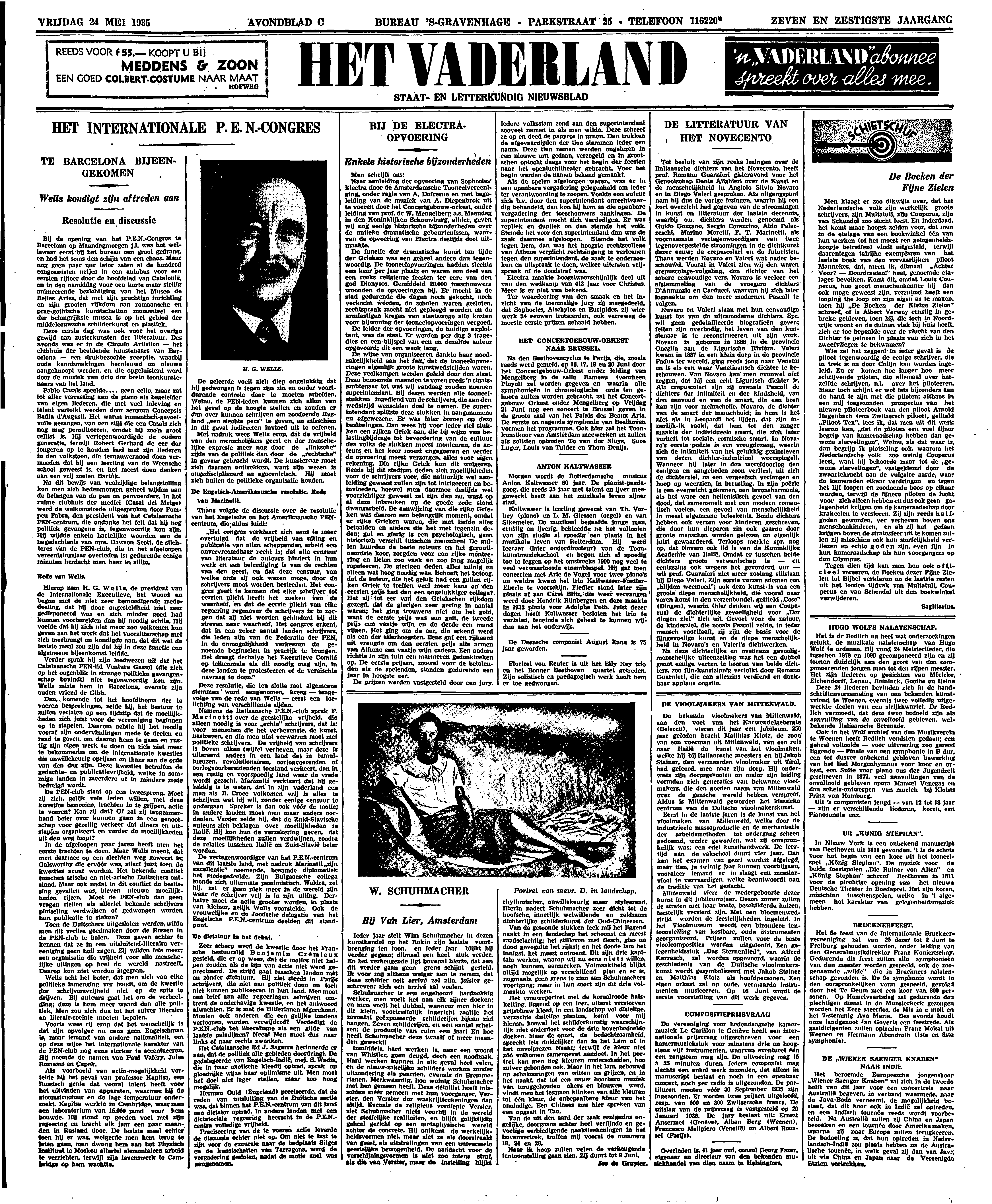 Men klaagt er zoo dikwijls over, dat het Nederlandsche volk zijn werkelijk groote schrijvers, zijn Multatuli, zijn Couperus, zijn van Schendel zoo slecht leest. En inderdaad, het komt maar hoogst zelden voor, dat men in de etalage van een boekwinkel één van hun werken (of het moest een gelegenheidskoopje betreffen) vindt uitgestald, terwijl daarentegen talrijke exemplaren van het laatste boek van den vervaarlijken piloot Mannekes, dat, meen ik, ditmaal ‘Achter Voor? - Doordraaien!’ heet, genoemde etalages bevolken. Komt dit, omdat Louis Couperus, hoe groot menschenkenner hij dan ook moge geweest zijn, verzuimd heeft een looping the loop om zijn eigen as te maken, toen hij ‘De Boeken der Kleine Zielen’ schreef, of is Albert Verwey ernstig in gebreke gebleven, toen hij, die toch in Noordwijk woont en de duinen vlak bij huis heeft, zich er toe bepaalde over de vlucht van den Dichter te peinzen in plaats van zich in het zweefvliegen te bekwamen?