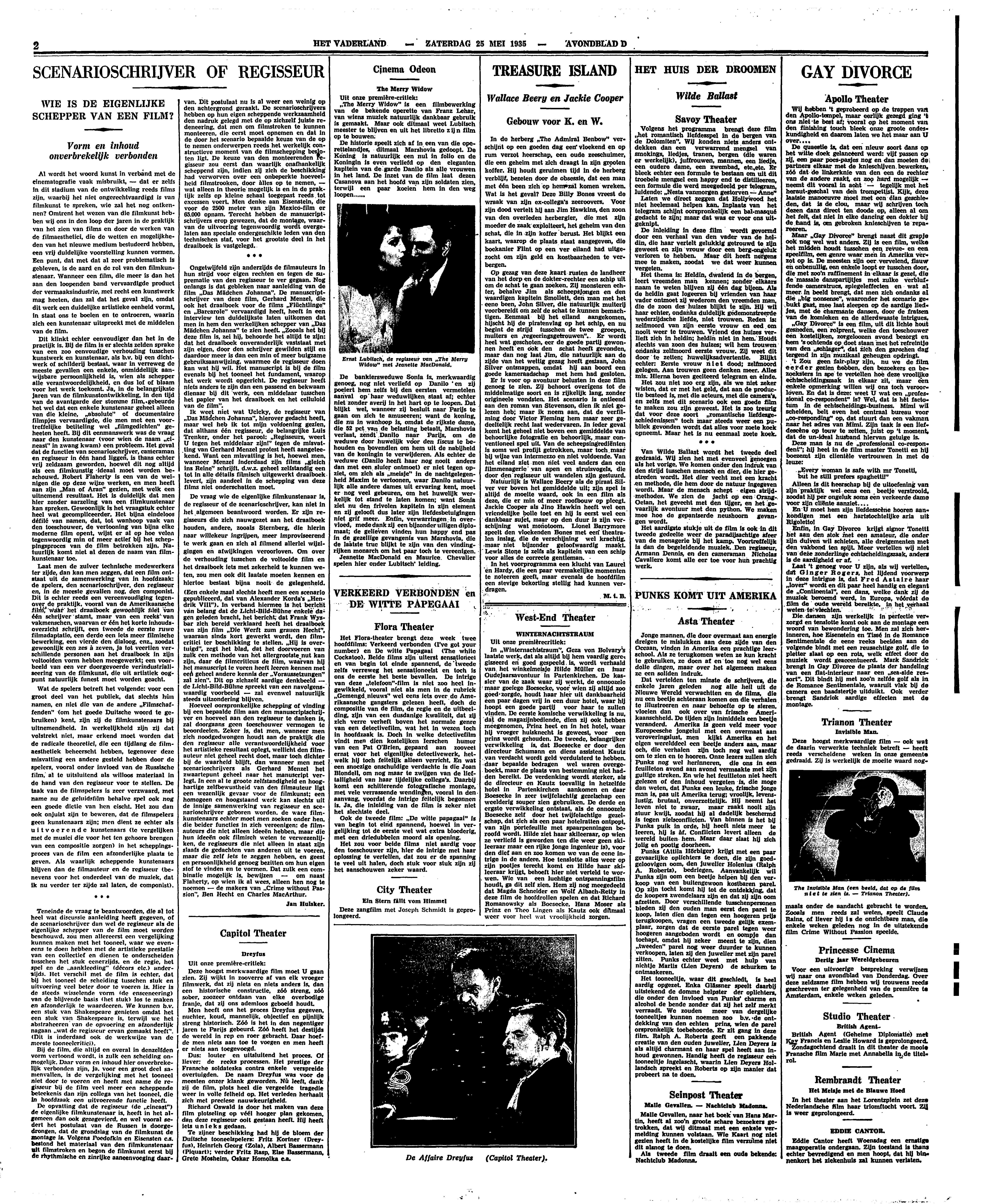 Er is voor op avontuur belusten in deze film genoeg te zien. Zij behoort overigens tot de middelmatige soort en is rijkelijk lang, zonder origineele vondsten. Het scenario is ontleend aan den roman van Stevenson, dien ik niet gelezen heb; maar ik neem aan, dat de verfilming door Victor Fleming hem maar zeer gedeeltelijk recht laat wedervaren. In ieder geval komt het geheel niet boven een gemiddelde van behoorlijke fotografie en behoorlijk, maar conventioneel spel uit. Van de scheepsingrediënten is soms wel profijt getrokken, maar toch maar bij wijze van intermezzo en niet voldoende. Van het eiland ziet men niet veel anders dan een filmmenagerie van apen en struisvogels, die door den regisseur uit wandelen zijn gestuurd.
