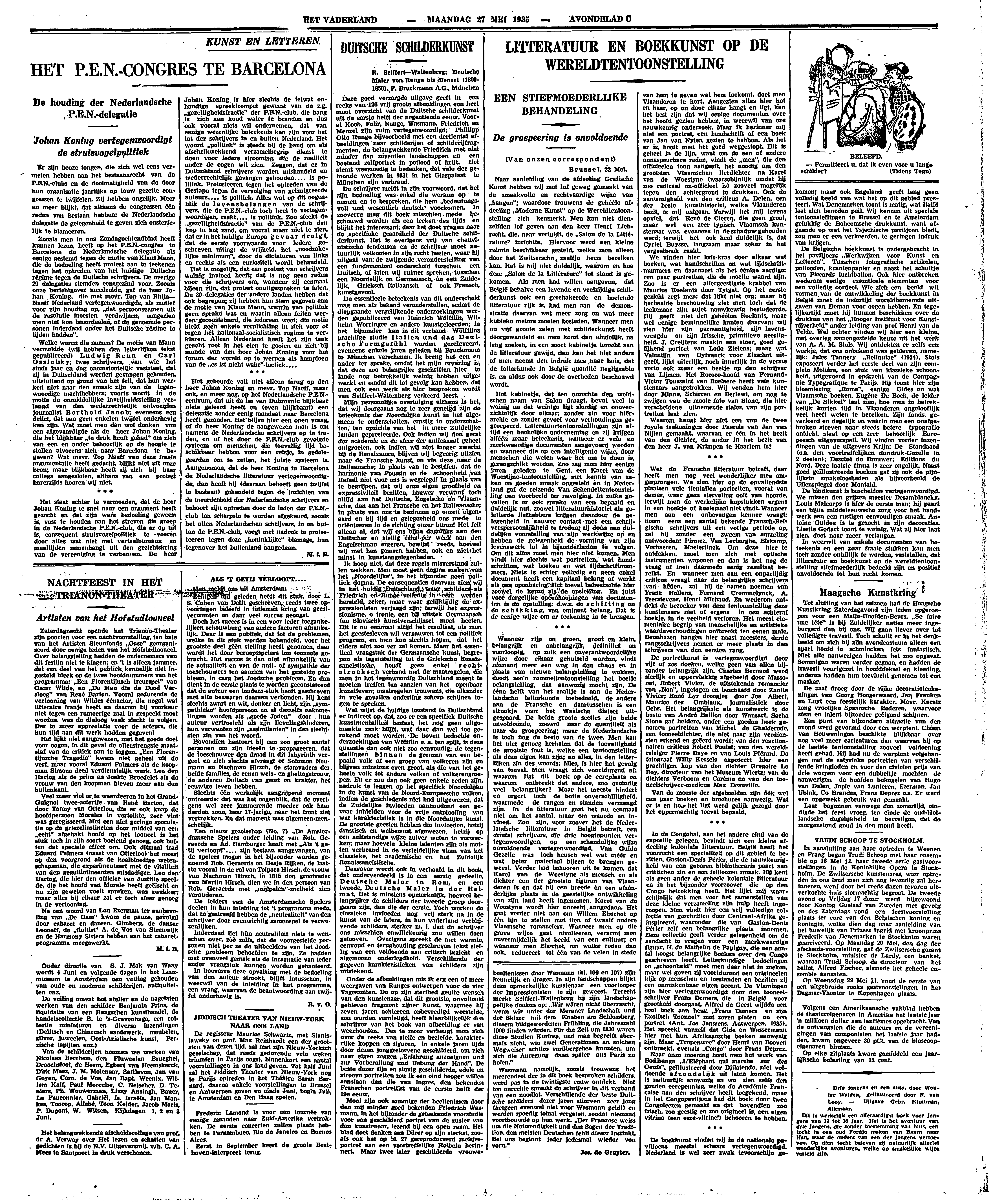 Zooals men in ons Zondagochtendblad heeft kunnen lezen, heeft op het P.E.N.-congres te Barcelona de Nederlandsche delegatie als eenige gestemd tegen de motie van Klaus Mann, die de bedoeling heeft protest aan te teekenen tegen het optreden van het huidige Duitsche régime tegen de Duitsche schrijvers. De overige 29 delegaties stemden eensgezind voor. Zooals onze berichtgever meedeelde, gaf de heer Johan Koning, die met mevr. Top van Rhijn - Naeff Nederland vertegenwoordigde, als motief voor zijn houding op, ‘dat persoonsnamen uit de resolutie moesten verdwijnen, aangezien men niet kon beoordeelen, of de genoemde personen inderdaad onder het Duitsche régime te lijden hadden’.