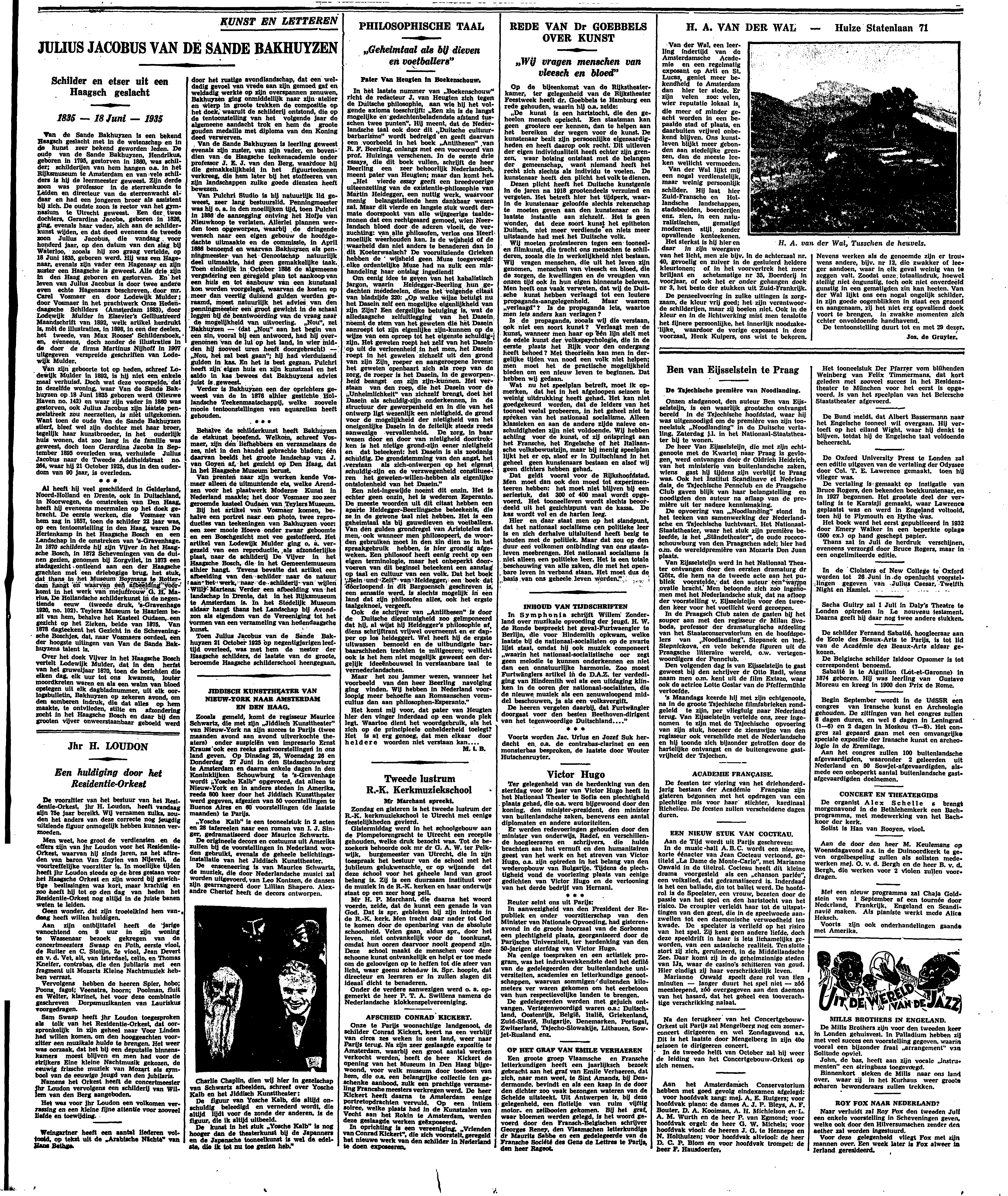 In het laatste nummer van ‘Boekenschouw’ richt de redacteur J. van Heugten zich tegen de Duitsche philosophie, aan wie hij het volgende axioma toeschrijft: ‘Een zin is de langst mogelijke en gedachtenbeladendste afstand tusschen twee punten’. Hij meent, dat de Nederlandsche taal ook door dit ‘Duitsche cultuurbarbarisme’ wordt bedreigd en geeft daarvan een voorbeeld in het boek ‘Antithesen’ van R.F. Beerling, onlangs met een voorwoord van prof. Huizinga verschenen. In de eerste drie essays, die dit boek vullen, schrijft de heer Beerling een zeer behoorlijk Nederlandsch, meent pater van Heugten; maar dan komt het.