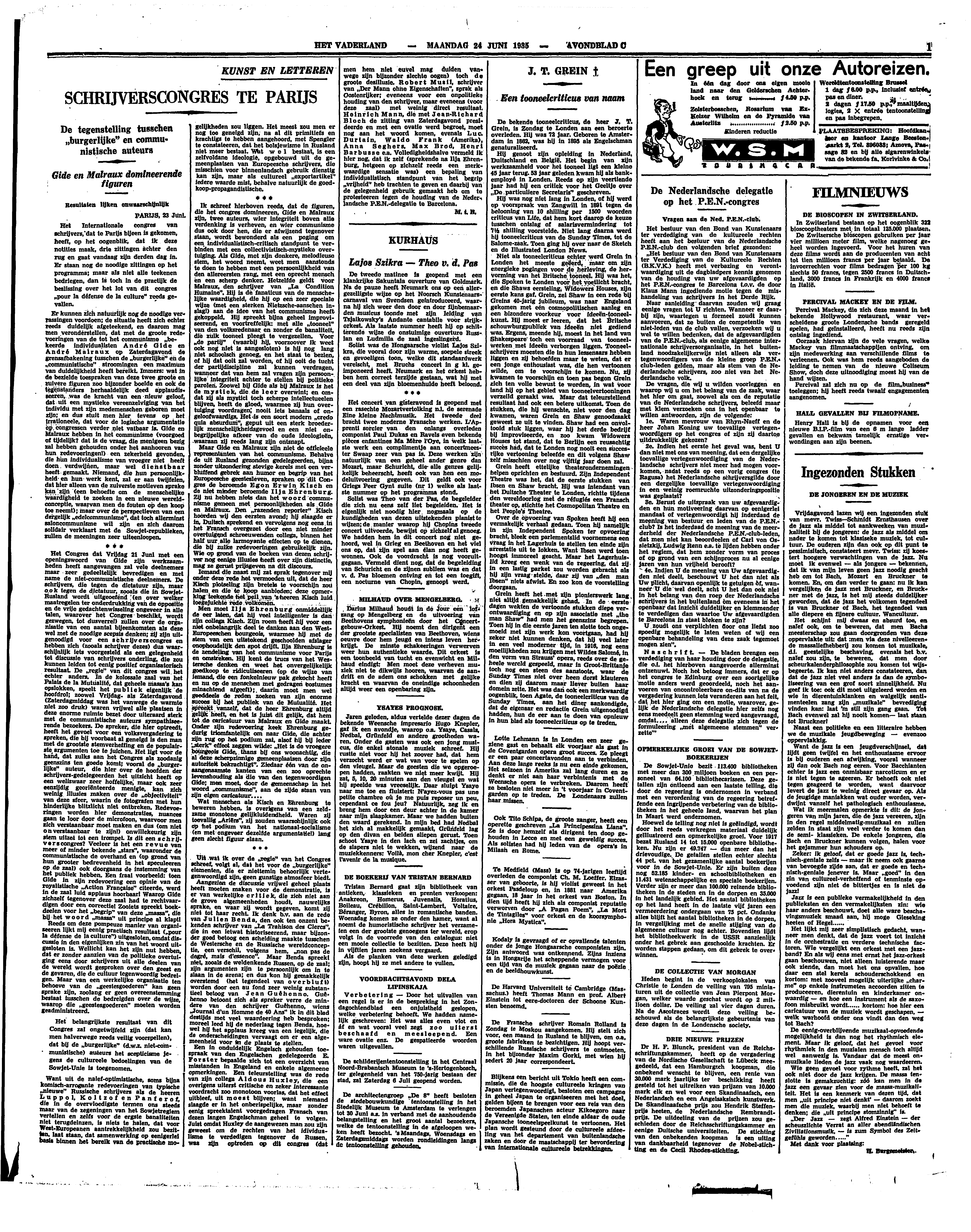 Er kunnen zich natuurlijk nog de noodige verrassingen voordoen; de situatie heeft zich echter reeds duidelijk afgeteekend, en daarom mag men veronderstellen, dat met de groote redevoeringen van de tot het communisme ‘bekeerde individualisten André Gide en Andrë Malraux op Zaterdagavond de grensafbakening tusschen de ‘burgerlijke’ en de ‘communistische’ stroomingen een maximum van duidelijkheid heeft bereikt. Immers: wat in de bezielde toespraken van deze twee groote en zuivere figuren zoo bijzonder boeide en ook de tegenstanders herhaaldelijk deed applaudisseeren, was de kracht van een nieuw geloof, dat uit een mystieke vereenzelviging van het individu met zijn medemenschen geboren moet zijn; en dus stuit men hier tevens op het irrationeele, dat voor de logische argumentatie op congressen verder niet vatbaar is. Gide en Malraux hebben in het communisme (voorgoed of tijdelijk? dat is de vraag, die menigeen bezig zal heben gehouden onder het aanhooren van hun redevoeringen!) een zekerheid gevonden, die hun individualisme van vroeger niet heeft doen verdwijnen, maar wel dienstbaar heeft gemaakt. Niemand, die hun persoonlijkheid en hun werk kent, zal er aan twijfelen, dat hier alleen van de zuiverste motieven sprake kan zijn (een behoefte om de menschelijke waardigheid te zoeken in een nieuwe wereldconceptie, waarvan men de fouten op den koop toe neemt); maar over de perspectieven van een dergelijk ‘edelcommunisme’, dat toch allerminst saloncommunisme wil zijn en zich daarom solidair verklaart met de Sowjet-republieken, zullen de meeningen zeer uiteenloopen.