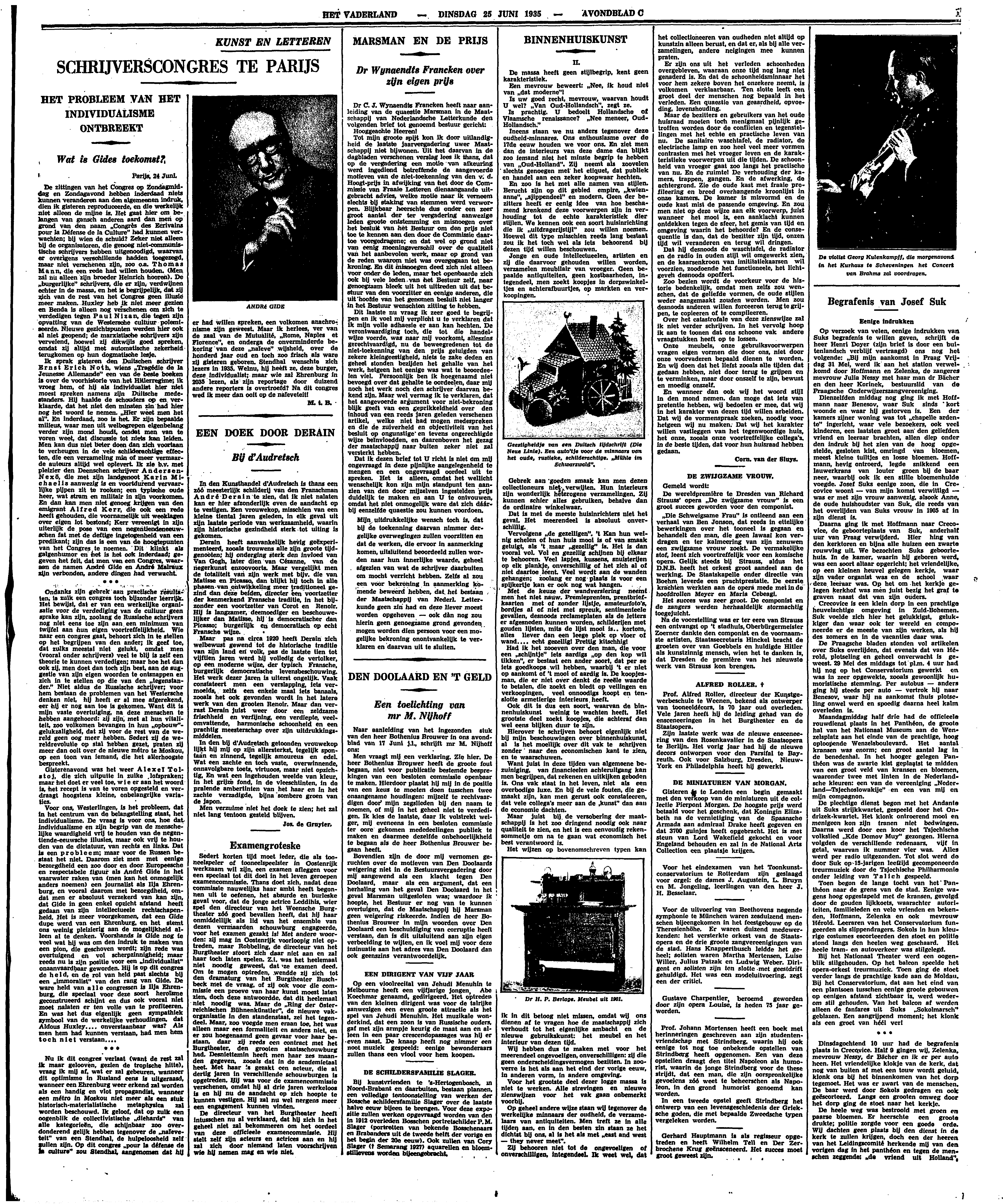 De zittingen van het Congres op Zondagmiddag en Zondagavond hebben inderdaad niets kunnen veranderen aan den algemeenen indruk, dien ik gisteren reproduceerde, en die werkelijk niet alleen de mijne is. Het gaat hier om belangen van gansch anderen aard dan men op grond van den naam ‘Congrès des Ecrivains pour la Défense de la Culture’ had kunnen verwachten; bij wien de schuld? Zeker niet alleen bij de organisatoren, die genoeg niet-communistische schrijvers hebben uitgenoodigd, waarvan er overigens verschillende hadden toegezegd, maar niet verschenen zijn, zoo o.a. Thomas Mann, die een rede had willen houden. (Men zal nu alleen zijn broeder Heinrich hooren). De ‘burgerlijke’ schrijvers, die er zijn, verdwijnen echter in de massa, en het is begrijpelijk, dat zij zich van de rest van het Congres geen illusie meer maken. Huxley heb ik niet meer gezien en Benda is alleen nog verschenen om zich te verdedigen tegen Paul Nizan, die tegen zijn opvatting van de Westersche cultuur polemiseerde. Nieuwe gezichtspunten werden hier ook al niet geopend; de marxistische schrijvers zijn vervelend, hoewel zij dikwijls goed spreken, omdat zij altijd met automatische zekerheid terugkomen op hun dogmatische lesje.