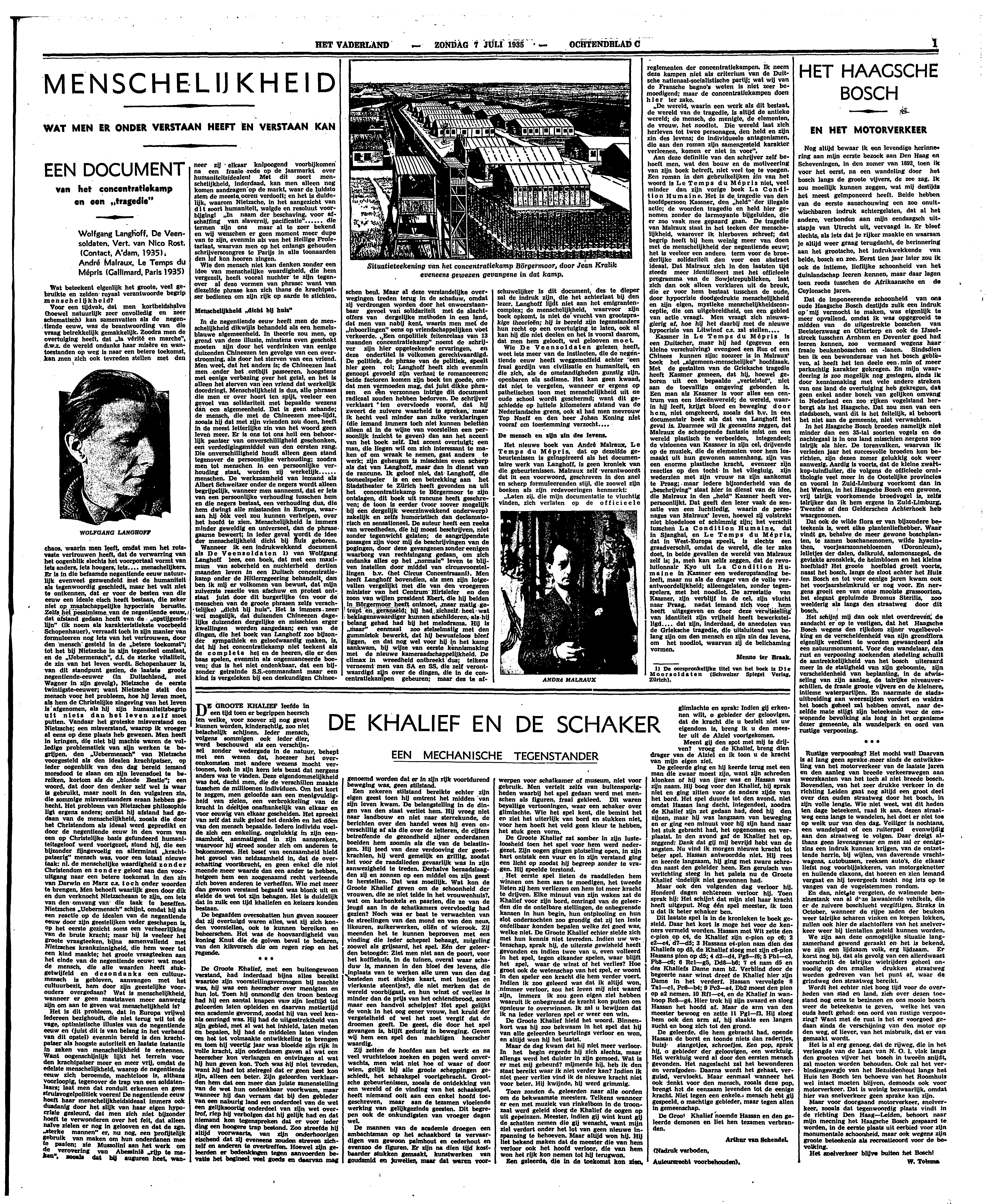 Het nieuwe boek van André Malraux, Le Temps du Mépris, dat op dezelfde gebeurtenissen is geïnspireerd als het documentaire werk van Langhoff, is geen kroniek van die gebeurtenissen. Malraux zelf verantwoordt dat in een voorwoord, geschreven in den snel en scherp formuleerenden stijl, die zoowel zijn boeken als zijn redevoeringen kenmerkt: