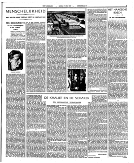 In de negentiende eeuw heeft men de menschelijkheid dikwijls behandeld als een hemelsblauwe algemeenheid. In theorie zou men, op grond van deze illusie, minstens even geschokt moeten zijn door het verdrinken van eenige duizenden Chineezen ten gevolge van een overstrooming, als door het sterven van een vriend. Men weet, dat het anders is; de Chineezen laat men onder het ontbijt passeeren, hoogstens met eenige verbazing over het getal, en het is alleen het sterven van een vriend dat werkelijk doordringt. Menschelijkheid is dus, alle phrases die men er over hoort ten spijt, veeleer een gevoel van solidariteit met bepaalde wezens dan een algemeenheid. Dat is geen schande; de mensch, die met de Chineezen mee-lijdt, zooals hij dat met zijn vrienden zou doen, heeft in de meest letterlijke zin van het woord geen leven meer. Er is ons tot ons heil een behoorlijk pantser van onverschilligheid geschonken, een verdedigingsmiddel van den eersten rang. Die onverschilligheid houdt alleen geen stand tegenover de persoonlijke verhouding; zoodra men tot menschen in een persoonlijke verhouding staat, worden zij werkelijk...... menschen. De werkzaamheid van iemand als Albert Schweitzer onder de negers wordt alleen begrijpelijk, wanneer men aanneemt, dat er iets van een persoonlijke verhouding tusschen hem en die negers bestaat, een verhouding dus, die hem dwingt alle misstanden in Europa, waaraan hij òòk veel zou kunnen verhelpen, over het hoofd te zien. Menschelijkheid is immers minder geweldig en universeel, dan de phrase gaarne beweert; in ieder geval wordt de idee der menschelijkheid dicht bij huis geboren.