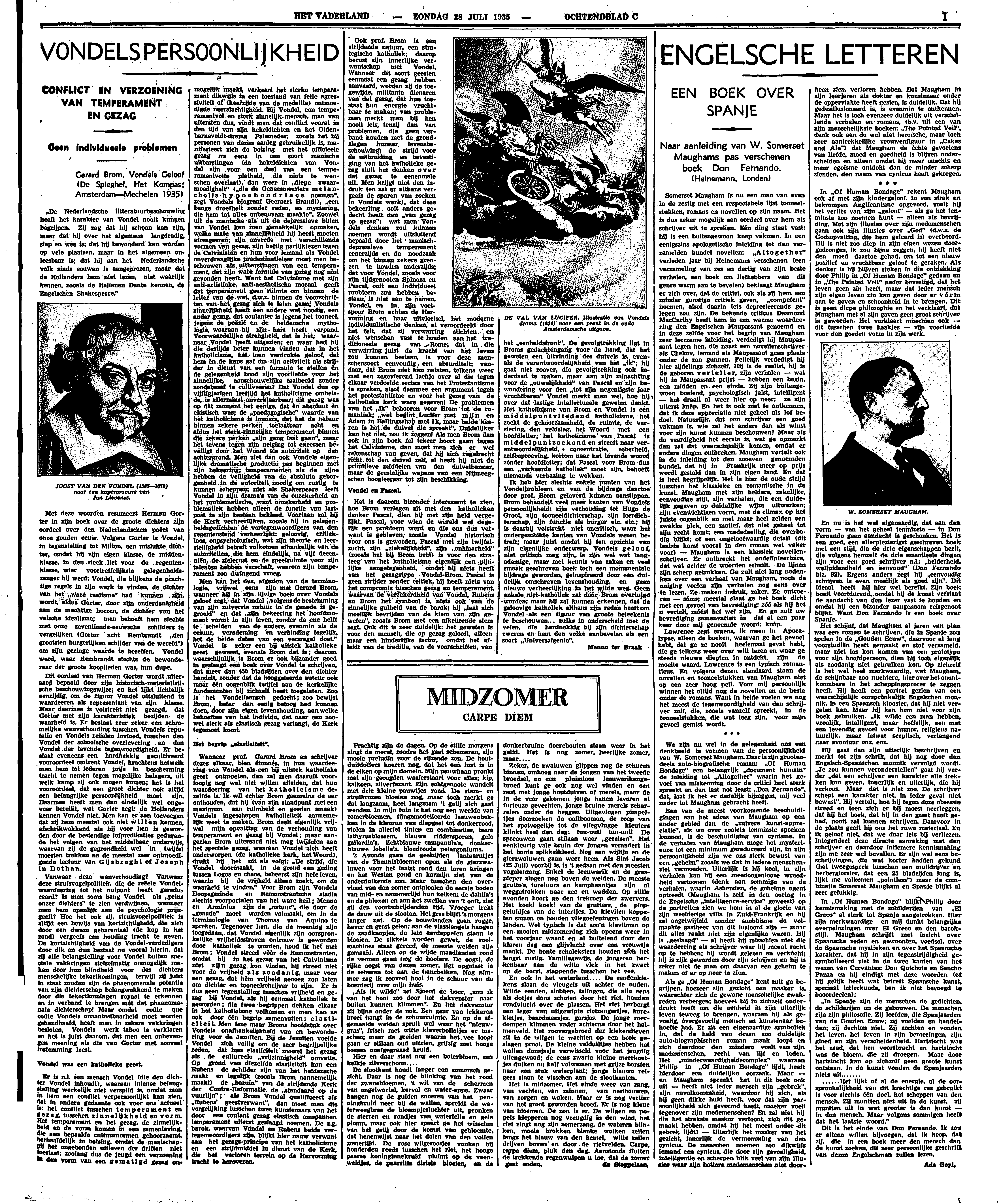 Ik heb hier slechts enkele punten van het Vondelprobleem en van de bijdrage daartoe door prof. Brom geleverd kunnen aanstippen. Brom behandelt veel meer kanten van Vondels persoonlijkheid: zijn verhouding tot Hugo de Groot, zijn tooneeldichterschap, zijn leerdichterschap, zijn functie als burger etc. etc.; hij is daarbij volstrekt niet oncritisch, waar het ondergeschikte kanten van Vondels wezen betreft; maar juist omdat hij ten opzichte van zijn eigenlijke onderwerp, Vondels geloof, niet critisch mag zijn, is zijn wel wat langademige, maar met kennis van zaken en veel smaak geschreven boek toch een monumentale bijdrage geworden, geinspireerd door een duidelijk omschreven levenshouding, en geen nieuwe verheerlijking in het wilde weg. Geen enkele niet-katholiek zal door Brom overtuigd worden; maar hij zal kunnen erkennen, dat de geloovige katholiek althans zijn reden heeft om Vondel als een figuur van groote beteekenis te beschouwen... zulks in onderscheid met de velen, die hardnekkig bij zijn dichterschap zweren en hem den volke aanbevelen als een soort ‘Universalgenie’.