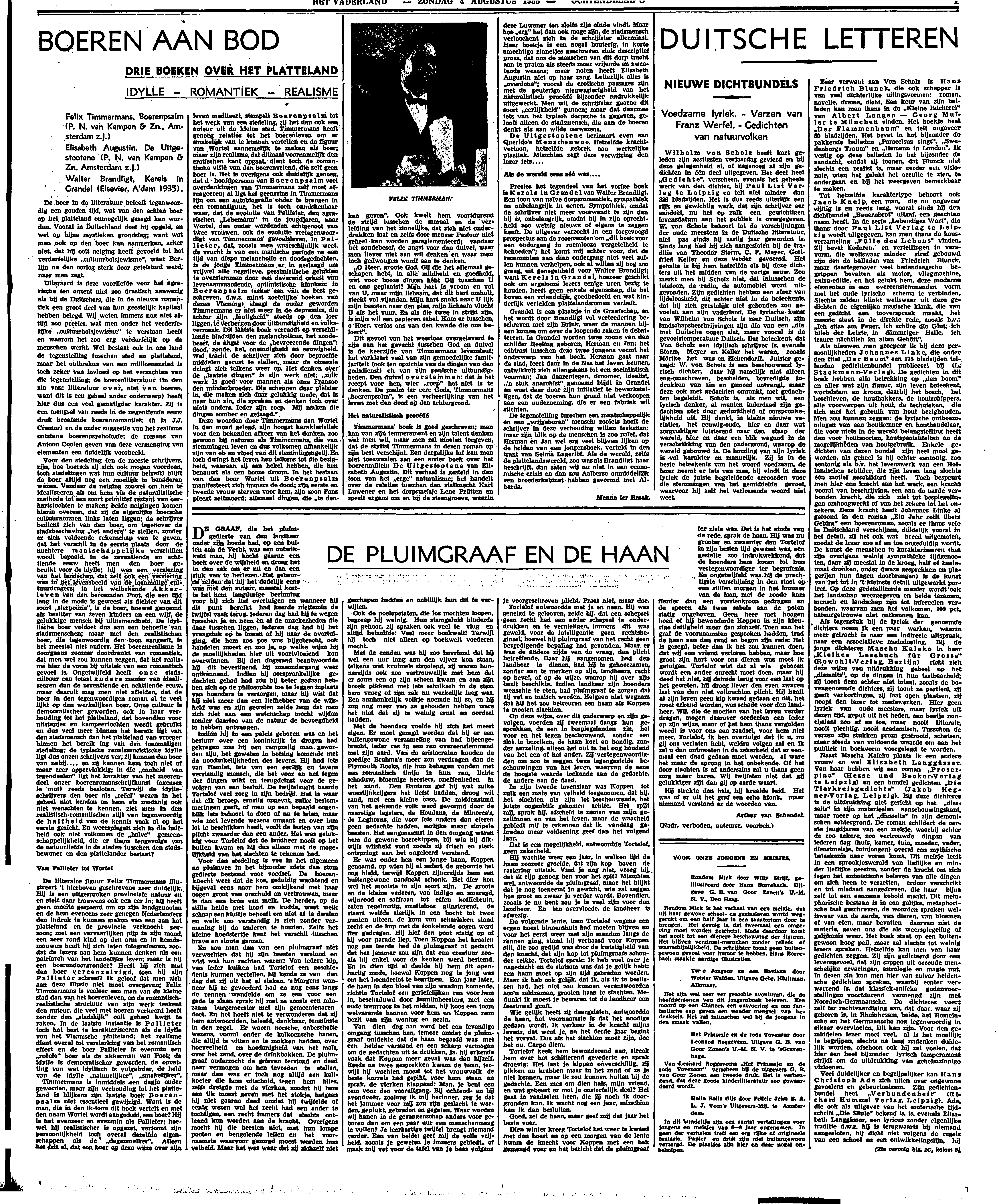 De boer in de litteratuur beleeft tegenwoordig een gouden tijd, wat van den echten boer op het platteland onmogelijk gezegd kan worden. Vooral in Duitschland doet hij opgeld, en wel op bijna mystieken grondslag; want wat men ook op den boer kan aanmerken, zeker niet, dat hij ooit neiging heeft gevoeld tot het verderfelijke ‘cultuurbolsjewisme’, waar Berlijn na den oorlog sterk door geteisterd werd, naar men zegt.